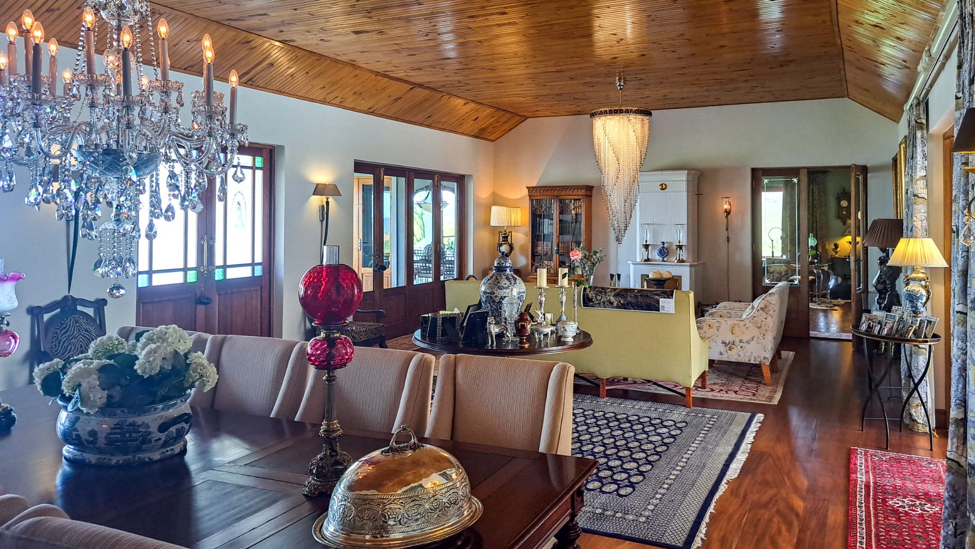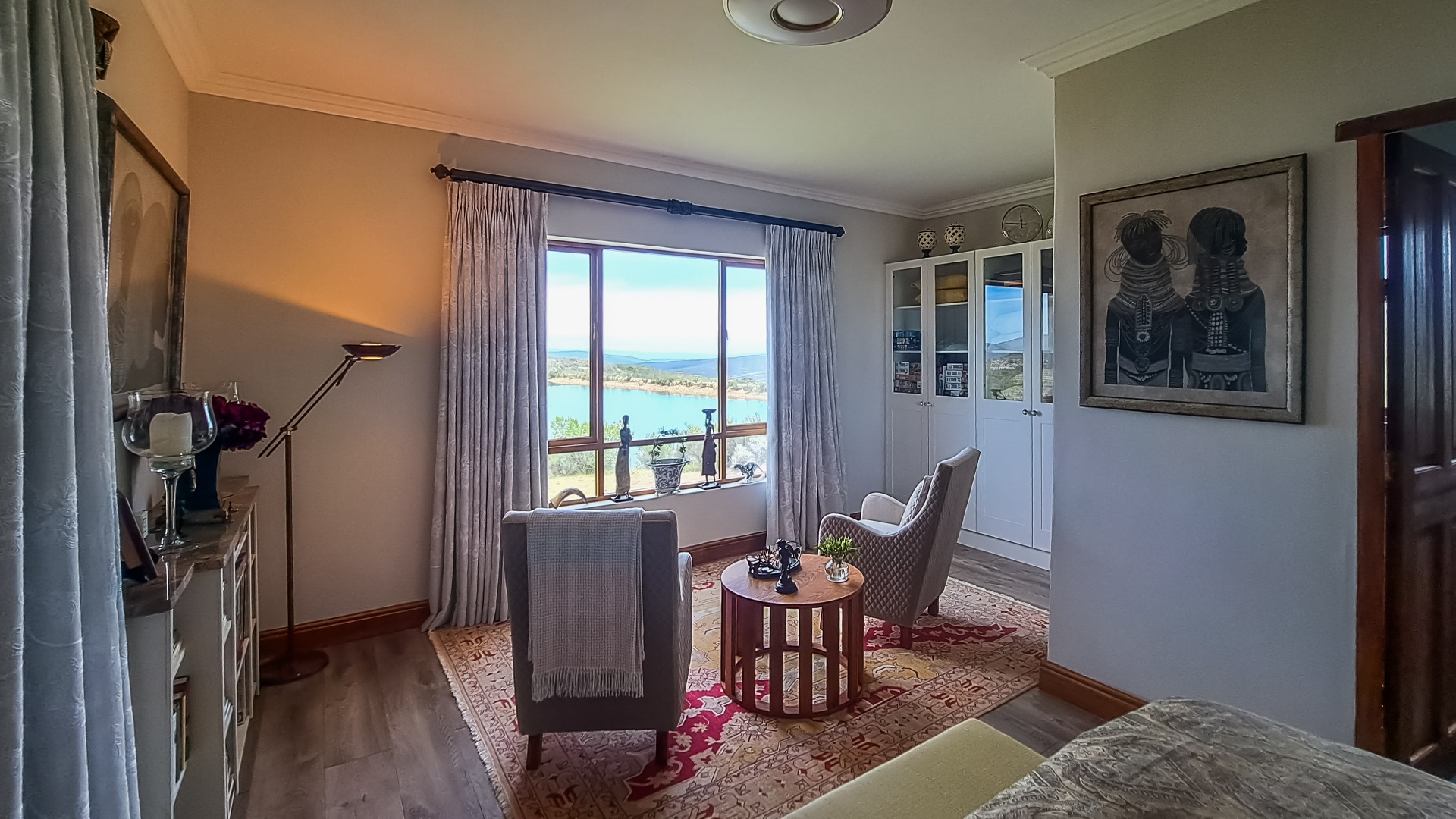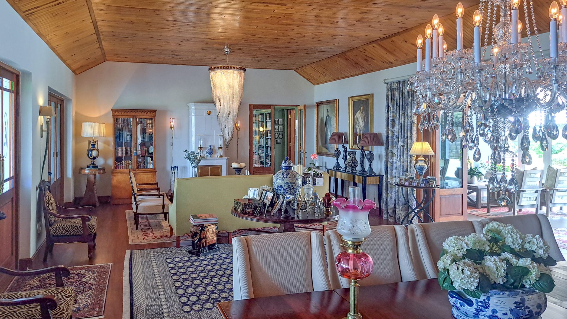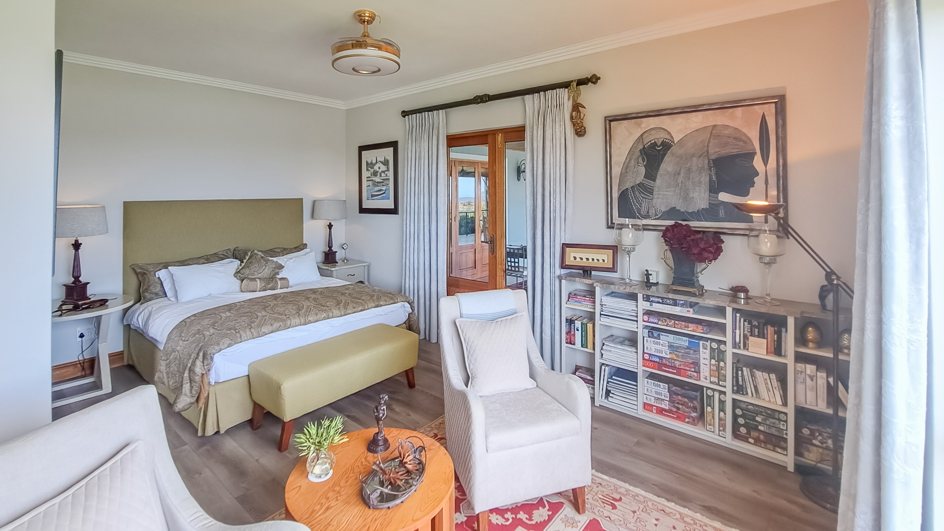 A rule of the estate is that homes may not be built within sight of one another, creating the feeling that you are alone in the vast landscape. The design of the homes is sympathetic to the landscape, blending in rather than standing out. The home on offer is a masterpiece, offering superb design for luxurious and comfortable living. All the rooms are spacious with top class fixtures and fittings. It overlooks a large dam. The home is entered from the south side via a huge, covered patio. Walking through the bank of wood and glass doors, one enters a huge reception room, with high ceilings and a floor. The dining area is part of this space. The floor is mahogany, and the lounge area has a white, Norwegian, wood burning “kaggel” stove. From here, through another set of wood and glass doors, you enter another huge room, furnished as a more casual lounge with seating and a coffee table and chairs. From this room, one can access the large, impressive library and TV room, with extensive bookshelves, a fireplace and wooden floors.