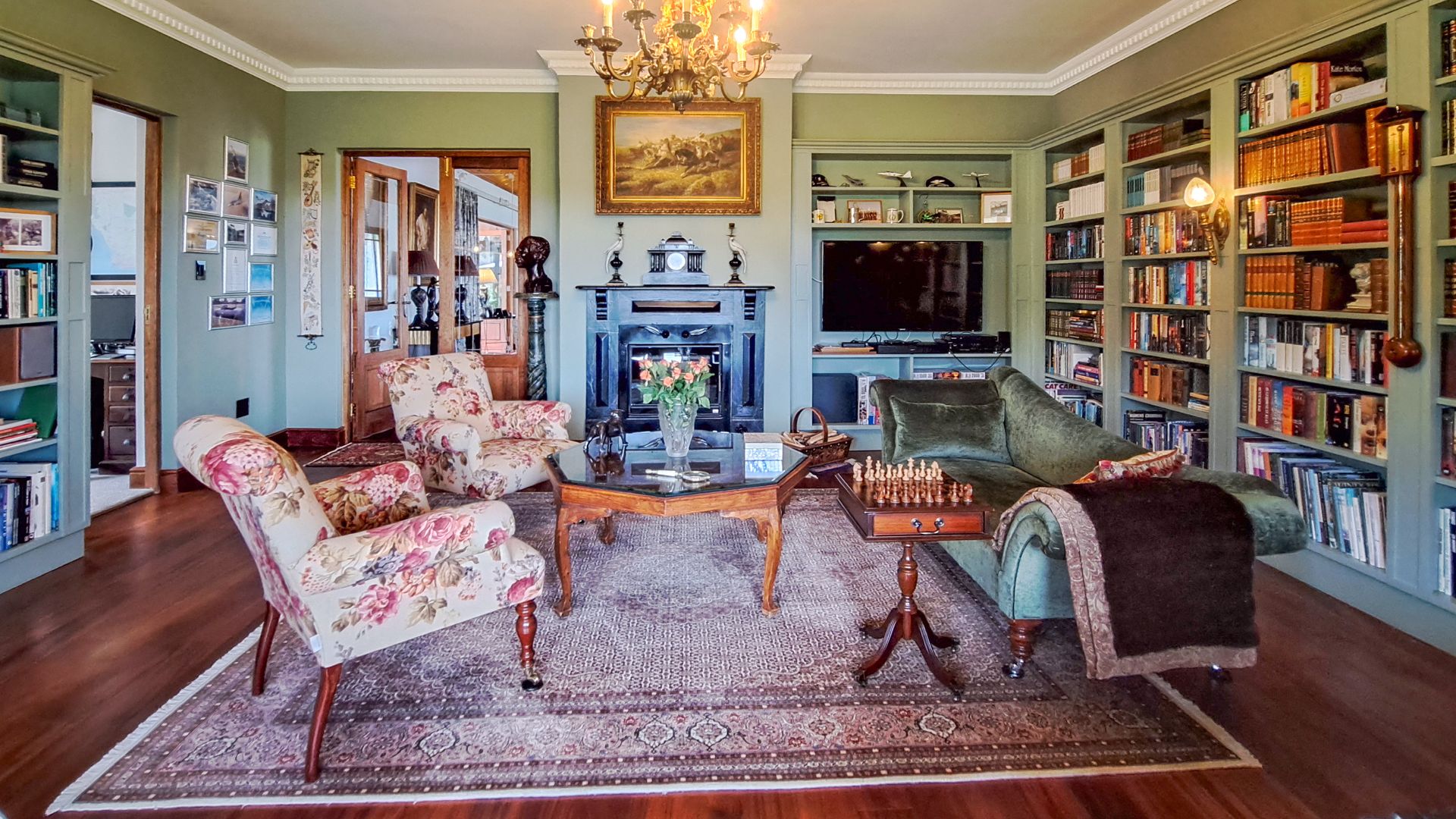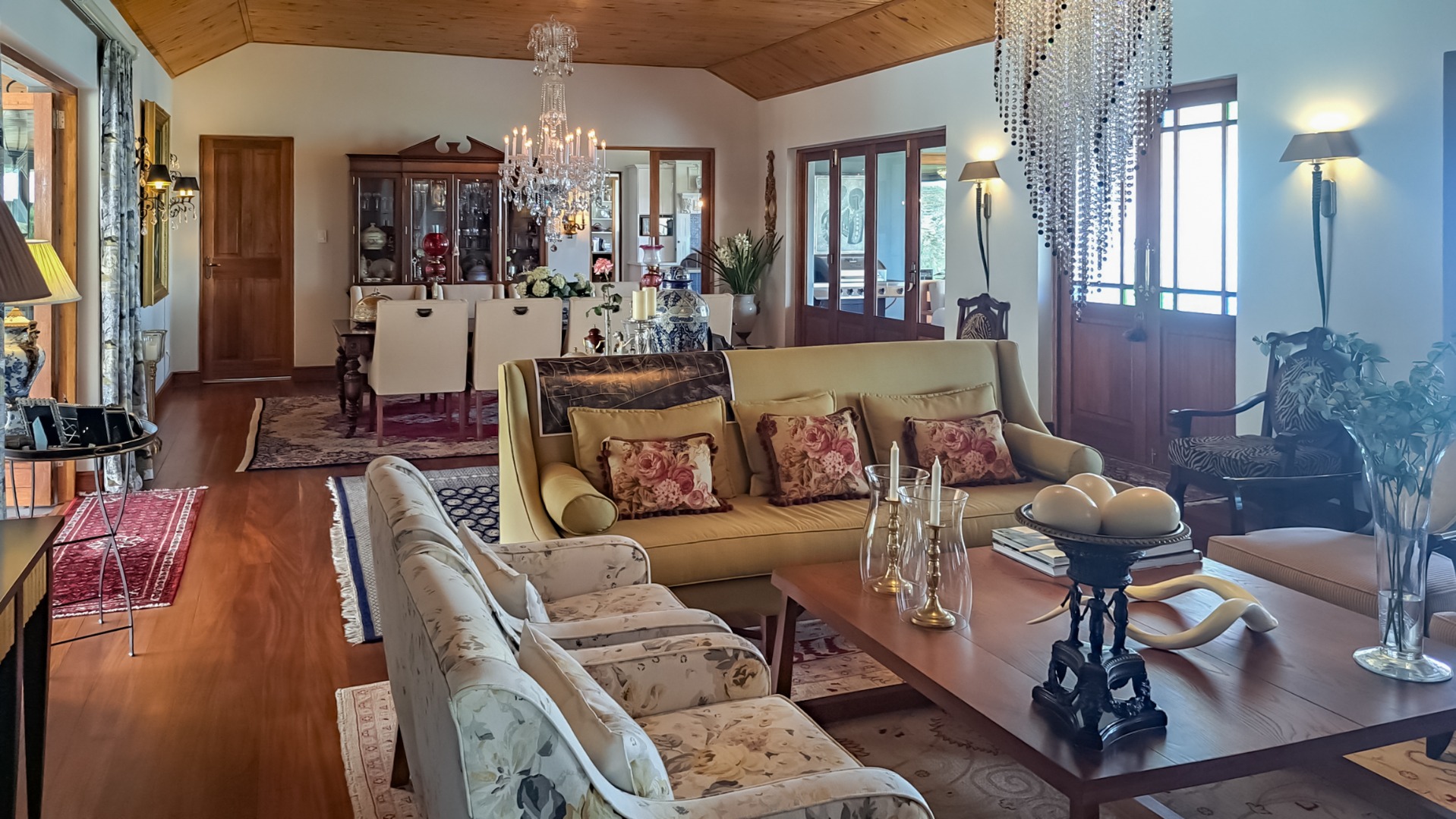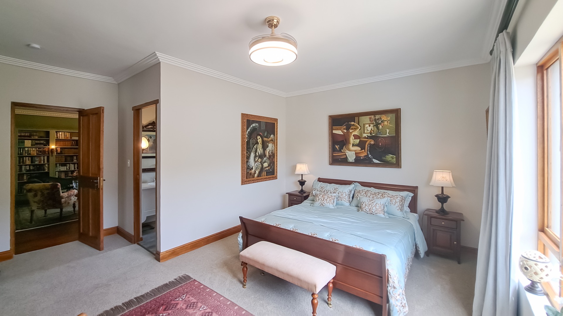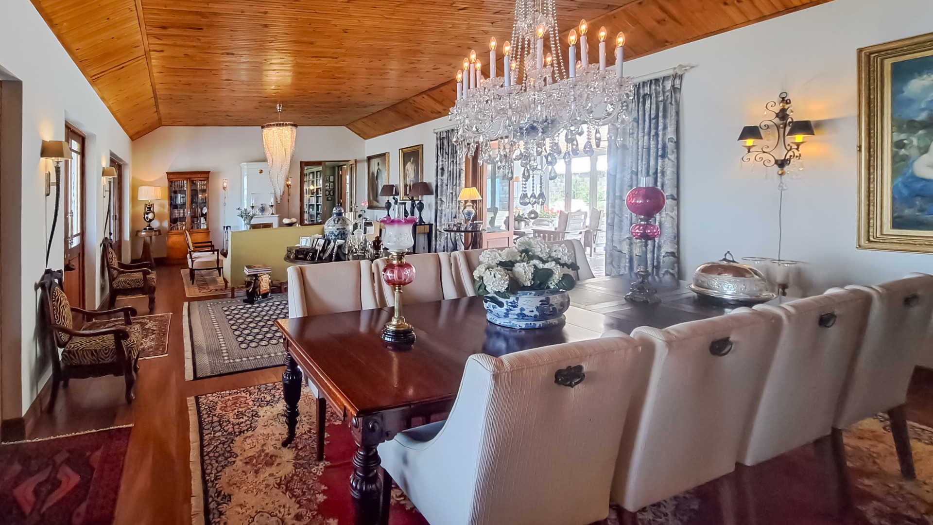 A rule of the estate is that homes may not be built within sight of one another, creating the feeling that you are alone in the vast landscape. The design of the homes is sympathetic to the landscape, blending in rather than standing out. The home on offer is a masterpiece, offering superb design for luxurious and comfortable living. All the rooms are spacious with top class fixtures and fittings. It overlooks a large dam. The home is entered from the south side via a huge, covered patio. Walking through the bank of wood and glass doors, one enters a huge reception room, with high ceilings and a floor. The dining area is part of this space. The floor is mahogany, and the lounge area has a white, Norwegian, wood burning “kaggel” stove. From here, through another set of wood and glass doors, you enter another huge room, furnished as a more casual lounge with seating and a coffee table and chairs. From this room, one can access the large, impressive library and TV room, with extensive bookshelves, a fireplace and wooden floors.