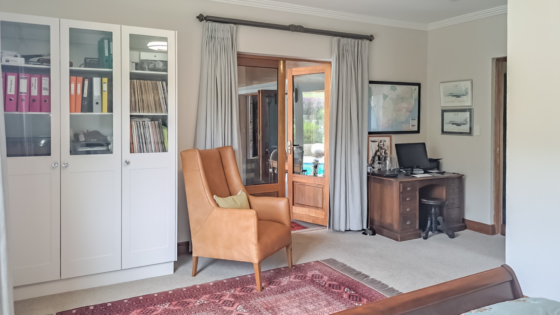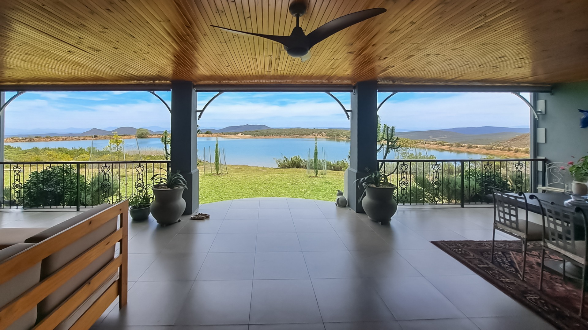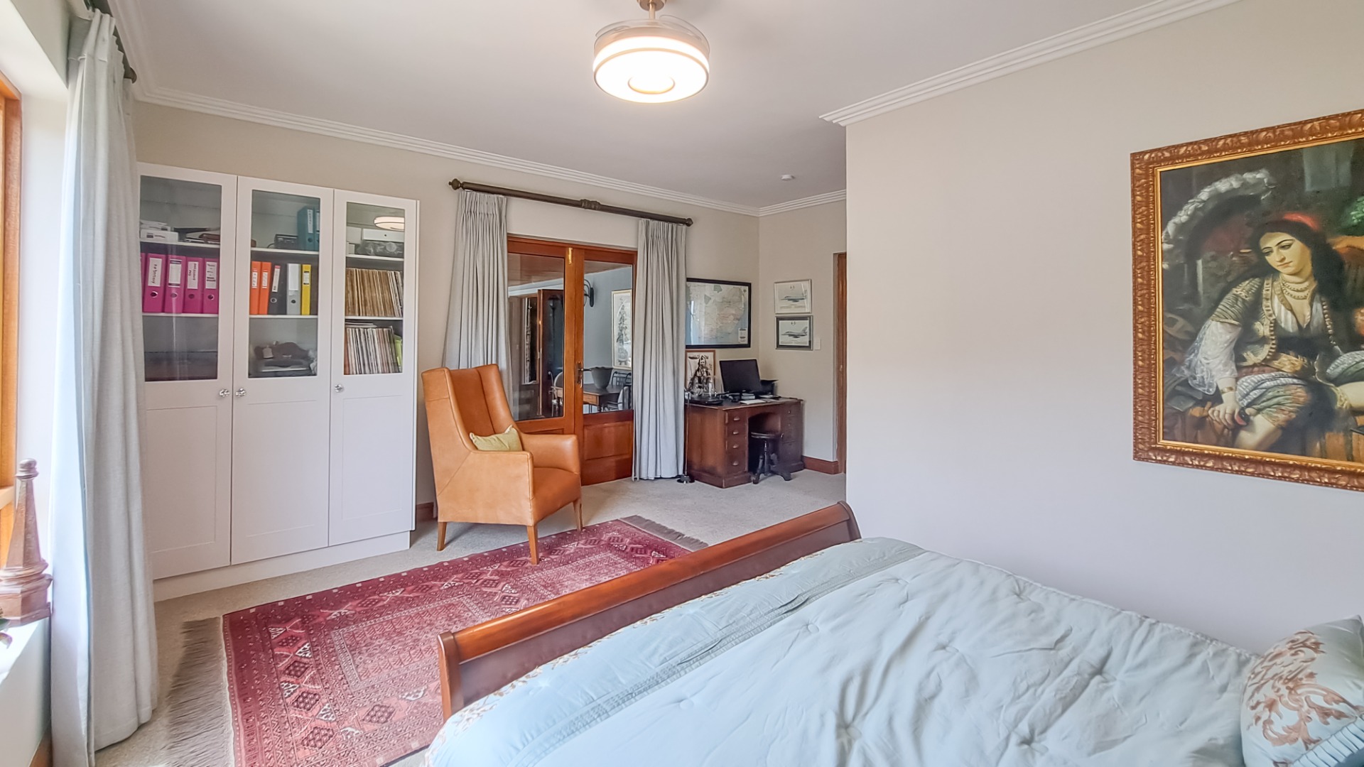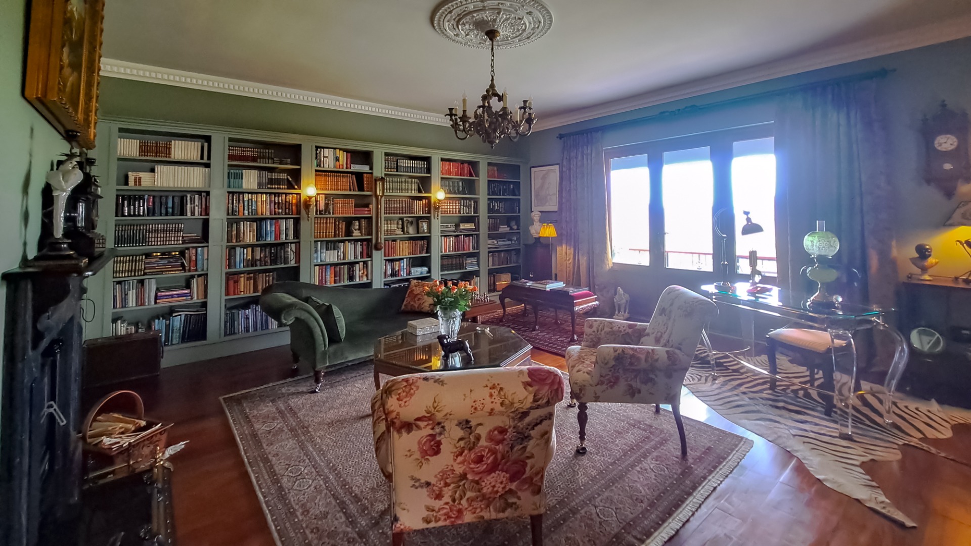 A rule of the estate is that homes may not be built within sight of one another, creating the feeling that you are alone in the vast landscape. The design of the homes is sympathetic to the landscape, blending in rather than standing out. The home on offer is a masterpiece, offering superb design for luxurious and comfortable living. All the rooms are spacious with top class fixtures and fittings. It overlooks a large dam. The home is entered from the south side via a huge, covered patio. Walking through the bank of wood and glass doors, one enters a huge reception room, with high ceilings and a floor. The dining area is part of this space. The floor is mahogany, and the lounge area has a white, Norwegian, wood burning “kaggel” stove. From here, through another set of wood and glass doors, you enter another huge room, furnished as a more casual lounge with seating and a coffee table and chairs. From this room, one can access the large, impressive library and TV room, with extensive bookshelves, a fireplace and wooden floors.