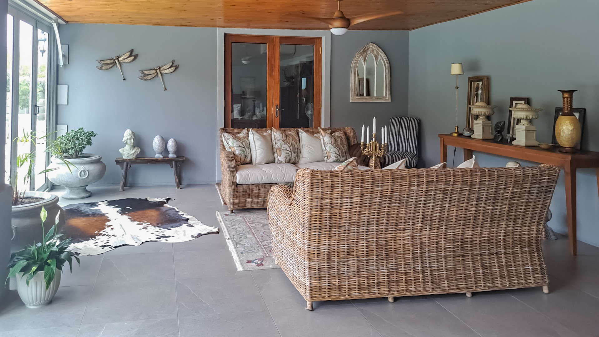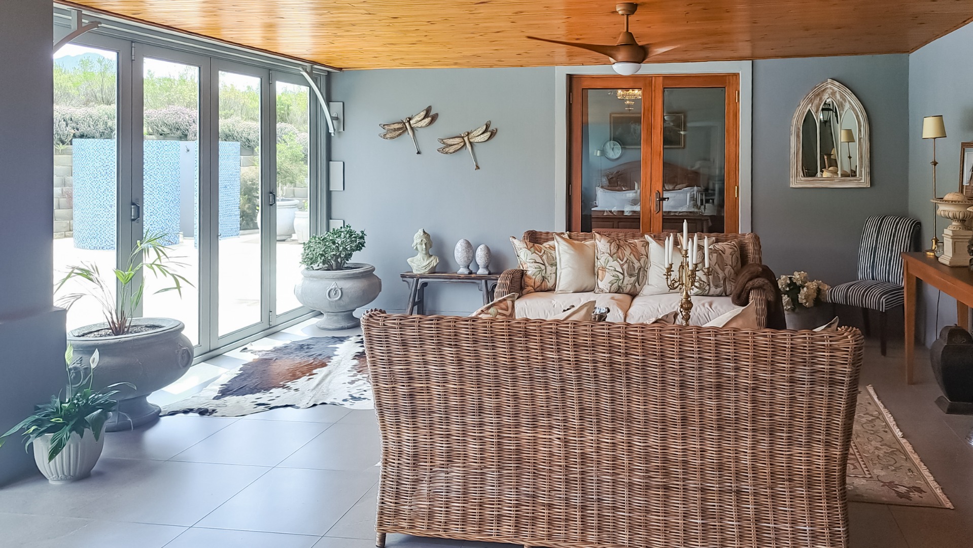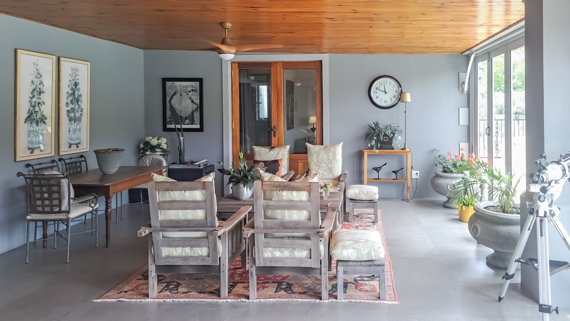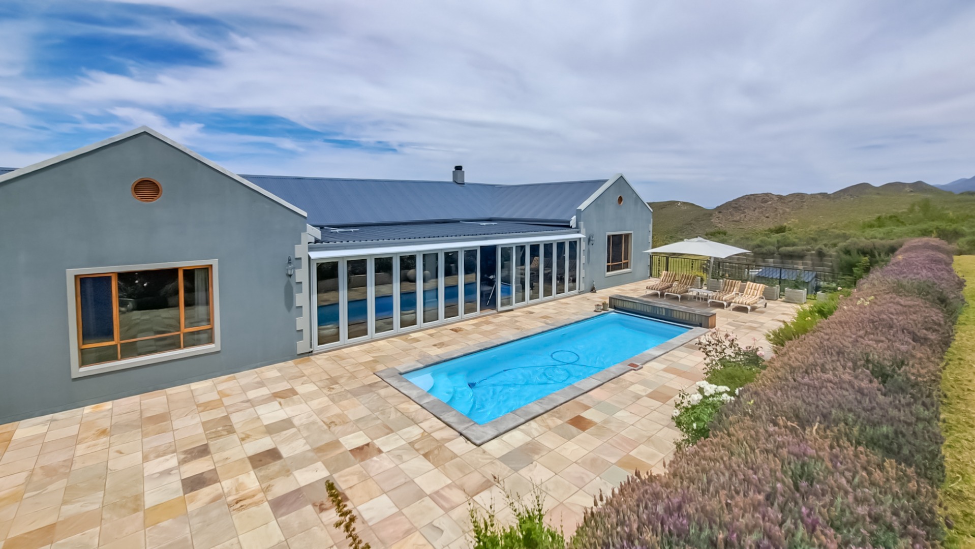 A rule of the estate is that homes may not be built within sight of one another, creating the feeling that you are alone in the vast landscape. The design of the homes is sympathetic to the landscape, blending in rather than standing out. The home on offer is a masterpiece, offering superb design for luxurious and comfortable living. All the rooms are spacious with top class fixtures and fittings. It overlooks a large dam. The home is entered from the south side via a huge, covered patio. Walking through the bank of wood and glass doors, one enters a huge reception room, with high ceilings and a floor. The dining area is part of this space. The floor is mahogany, and the lounge area has a white, Norwegian, wood burning “kaggel” stove. From here, through another set of wood and glass doors, you enter another huge room, furnished as a more casual lounge with seating and a coffee table and chairs. From this room, one can access the large, impressive library and TV room, with extensive bookshelves, a fireplace and wooden floors.