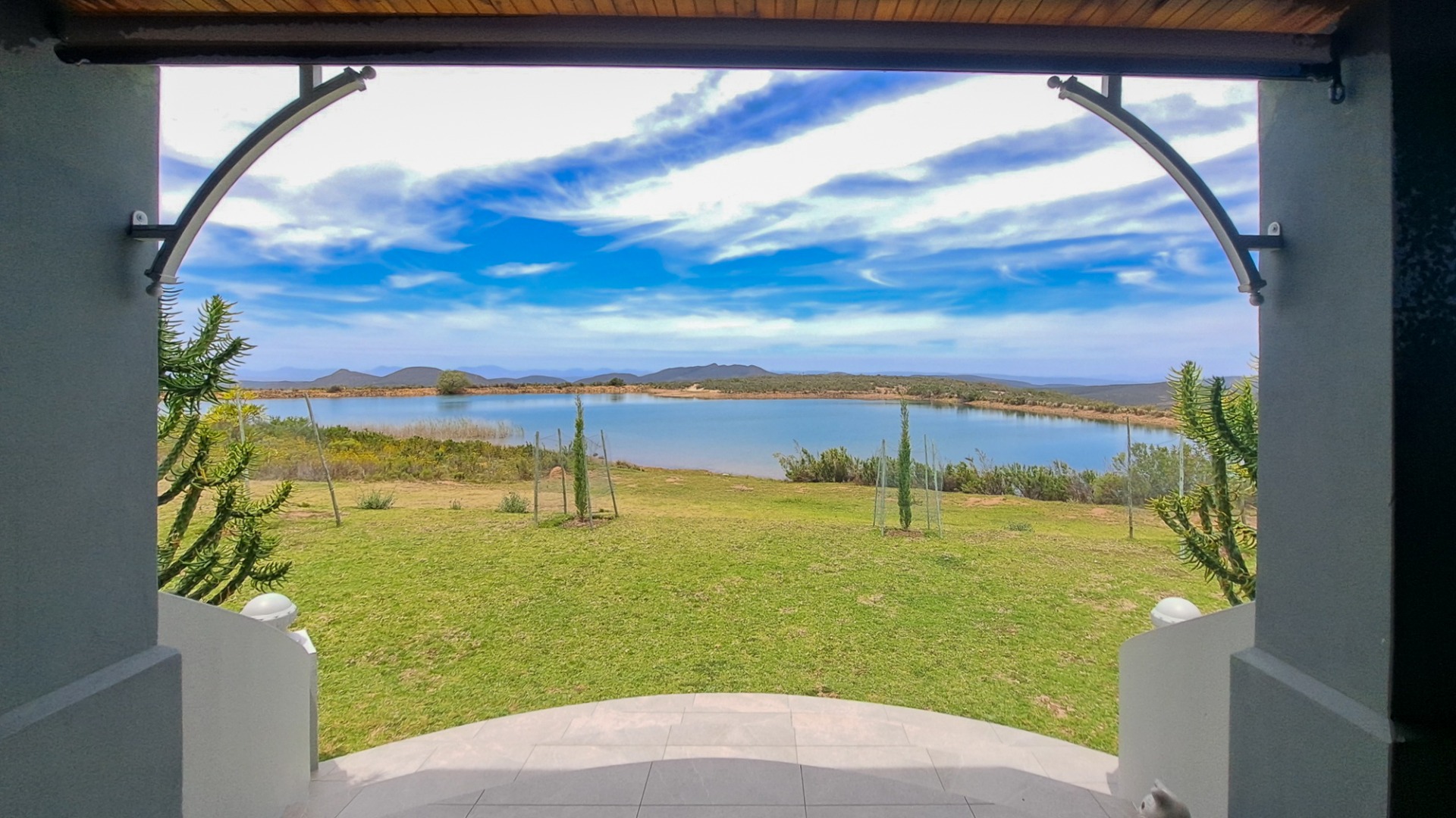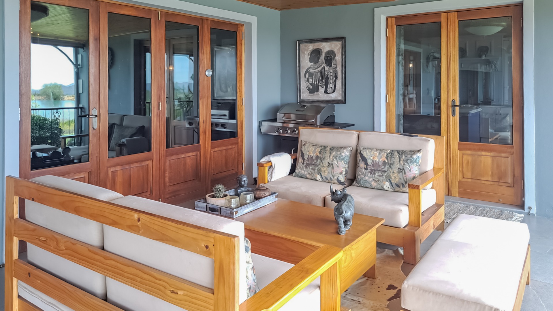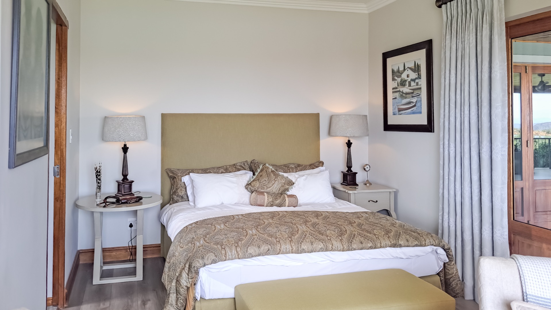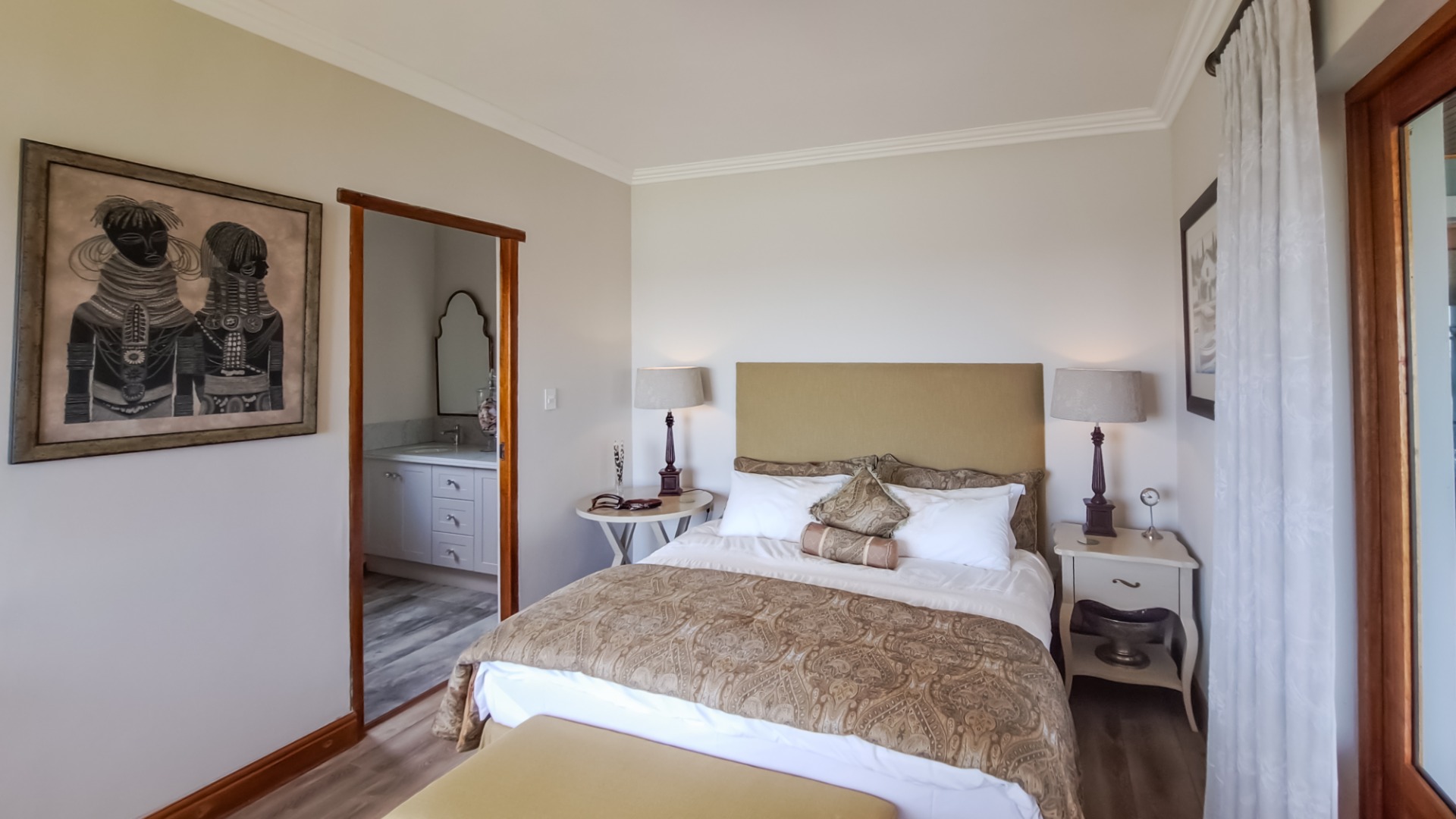 A small second patio, offers a perfect spot to enjoy the superb sunsets whilst sipping your favourite wine. The home has three spacious bedrooms, each en-suite. The first guest bedroom has white built-in cupboards, and- a vinyl floor, and leads out onto the patio. The en-suite bathroom has a shower, toilet and hand basin and a marble floor as well as quartz vanity slabs. The second guest bedroom is carpeted and has a similar en-suite bathroom. The guest room includes a double basin and tiled floor.