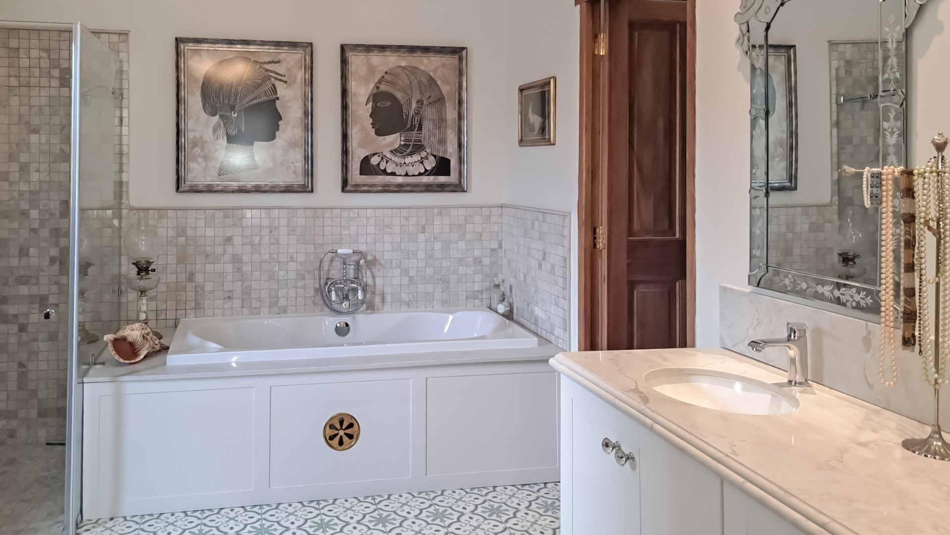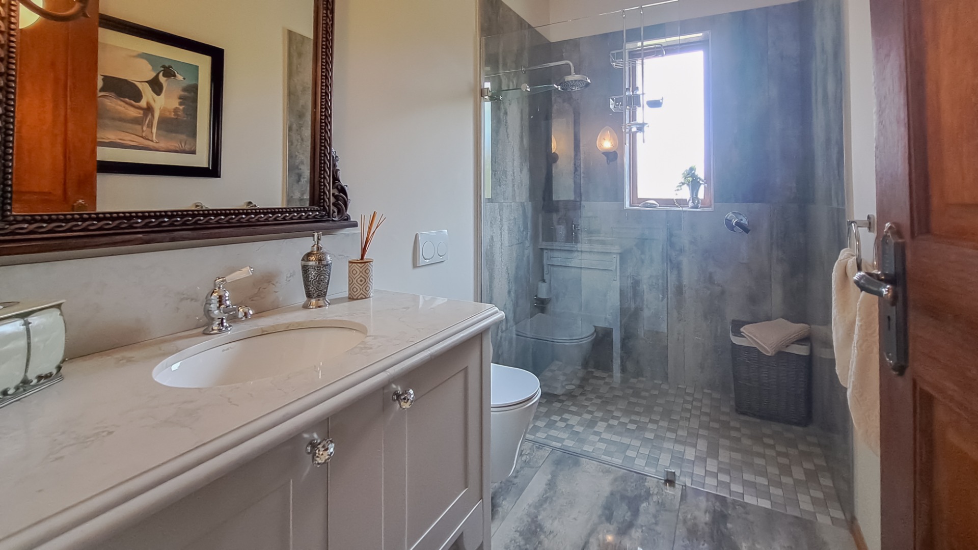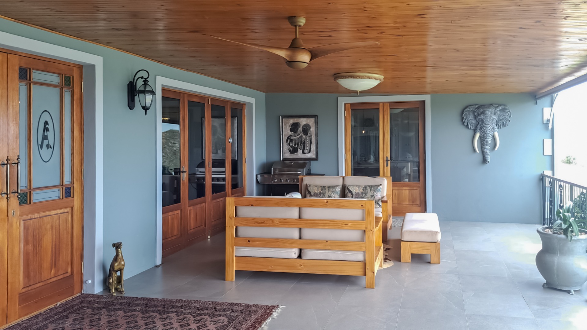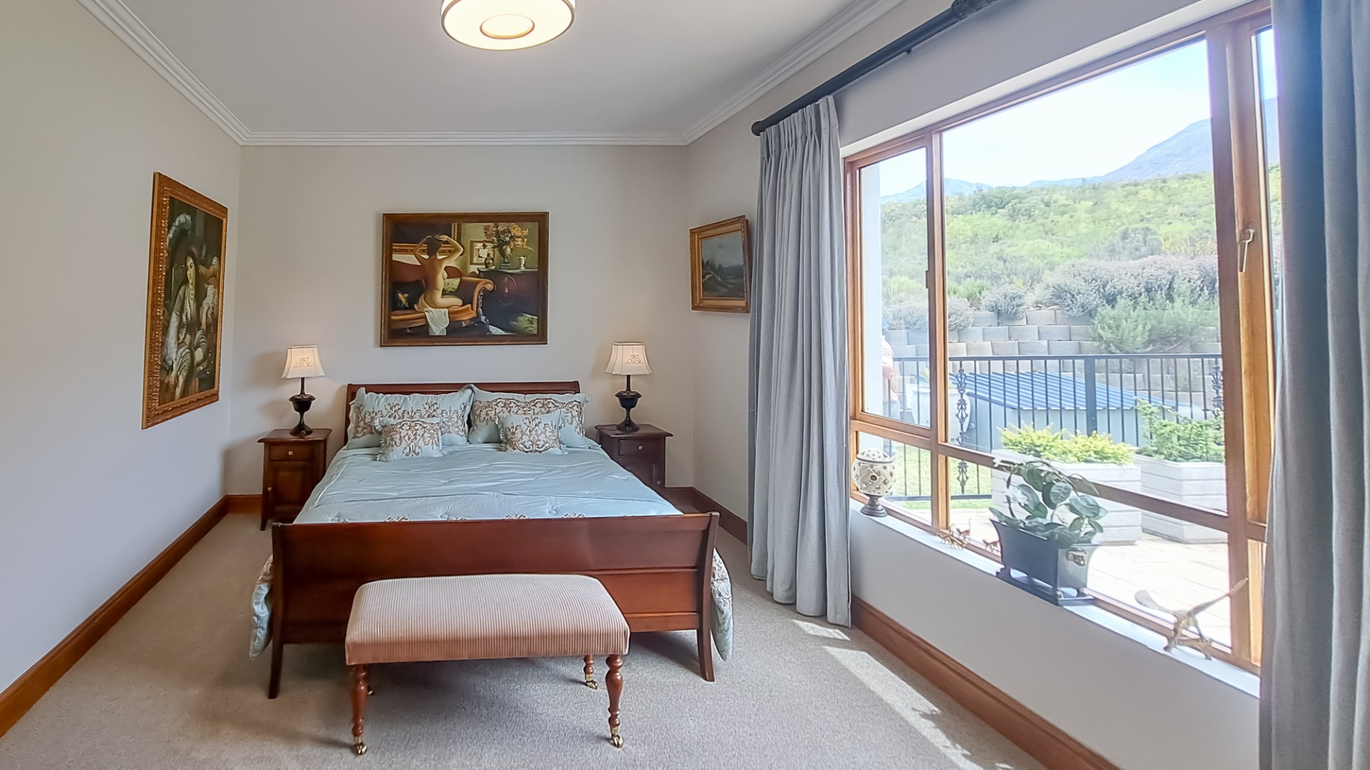 A small second patio, offers a perfect spot to enjoy the superb sunsets whilst sipping your favourite wine. The home has three spacious bedrooms, each en-suite. The first guest bedroom has white built-in cupboards, and- a vinyl floor, and leads out onto the patio. The en-suite bathroom has a shower, toilet and hand basin and a marble floor as well as quartz vanity slabs. The second guest bedroom is carpeted and has a similar en-suite bathroom. The guest room includes a double basin and tiled floor.