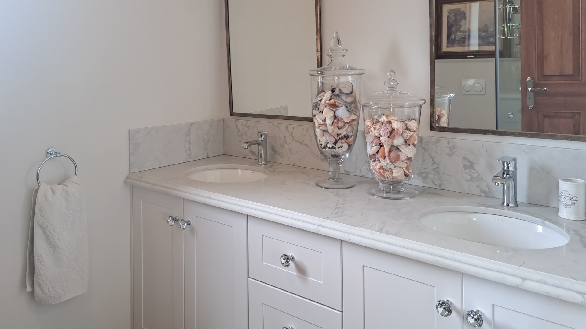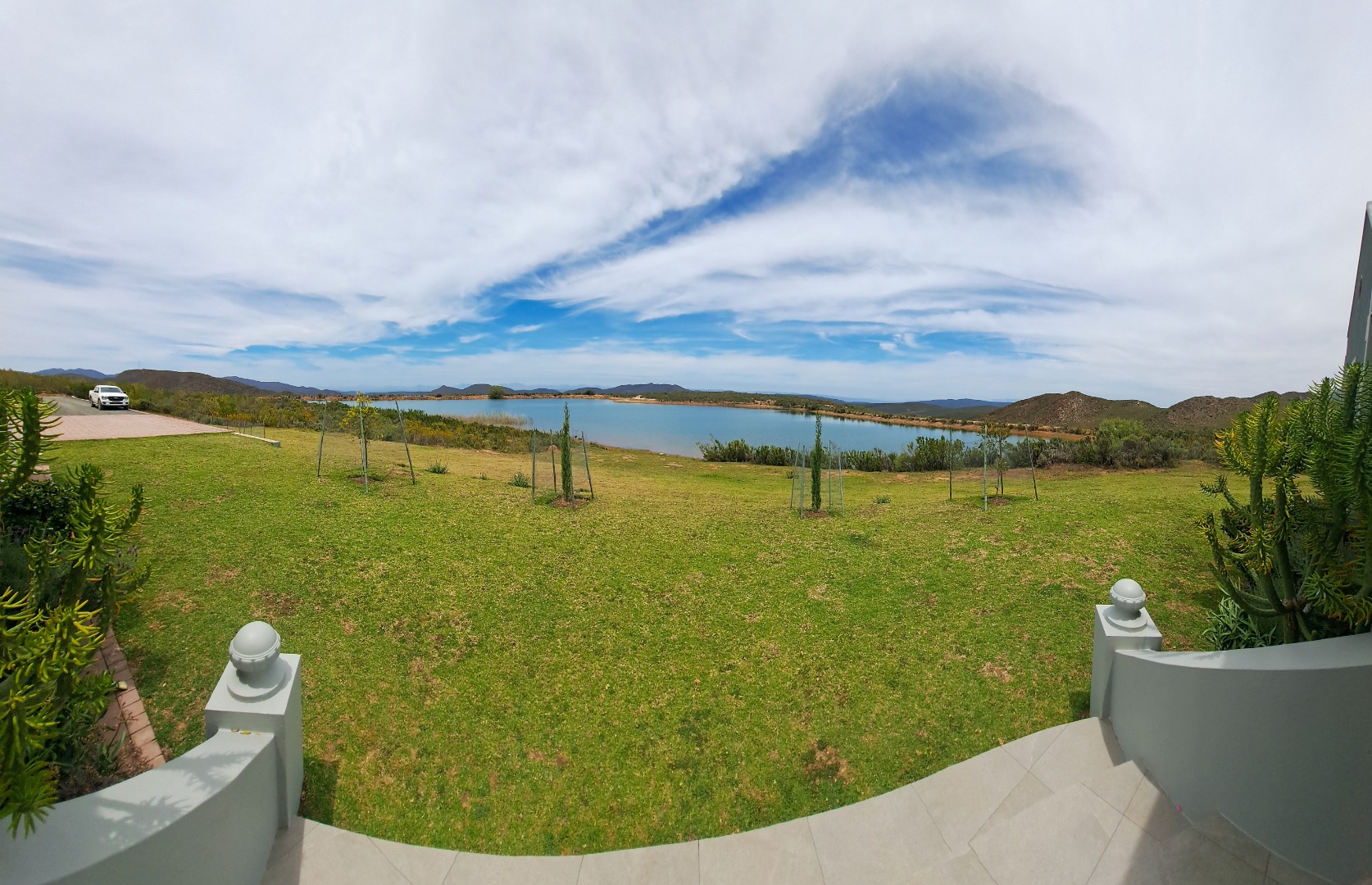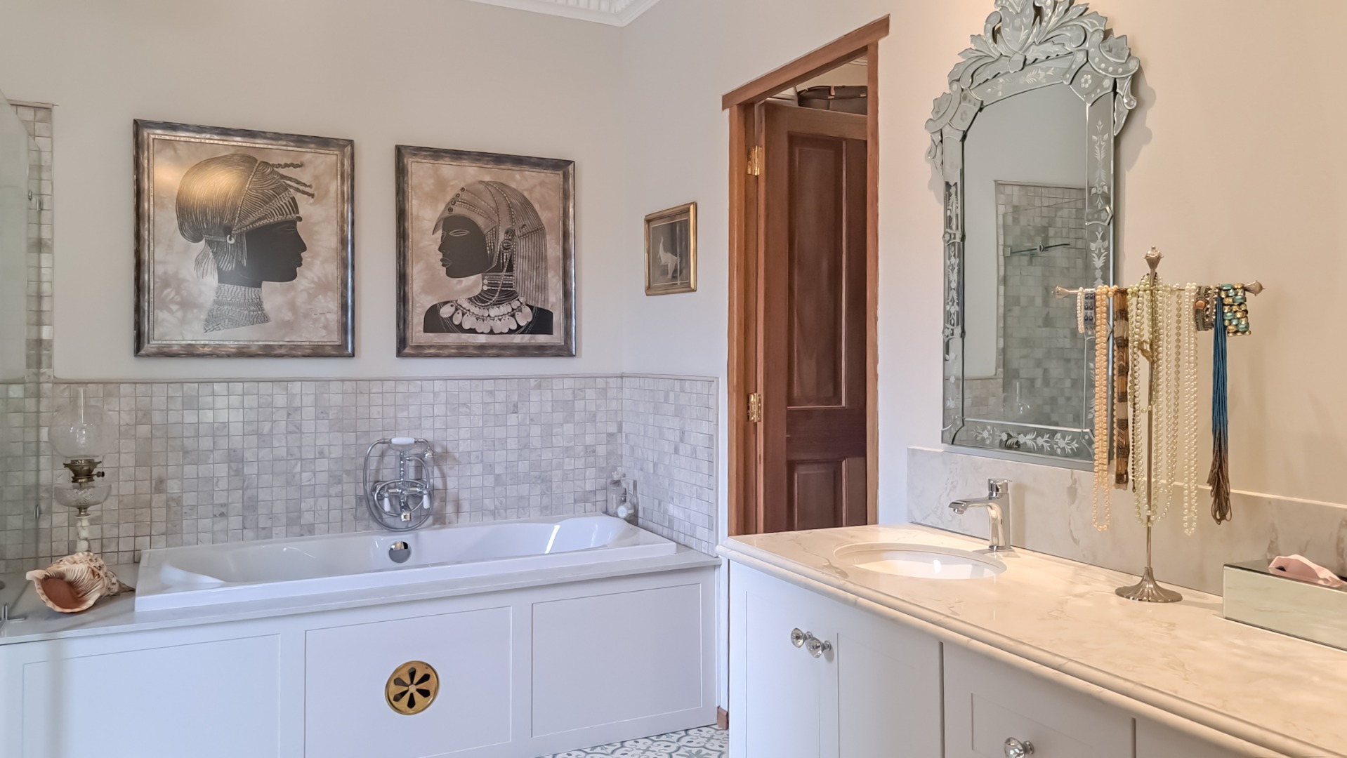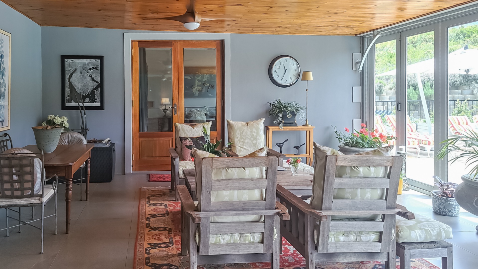 A small second patio, offers a perfect spot to enjoy the superb sunsets whilst sipping your favourite wine. The home has three spacious bedrooms, each en-suite. The first guest bedroom has white built-in cupboards, and- a vinyl floor, and leads out onto the patio. The en-suite bathroom has a shower, toilet and hand basin and a marble floor as well as quartz vanity slabs. The second guest bedroom is carpeted and has a similar en-suite bathroom. The guest room includes a double basin and tiled floor.