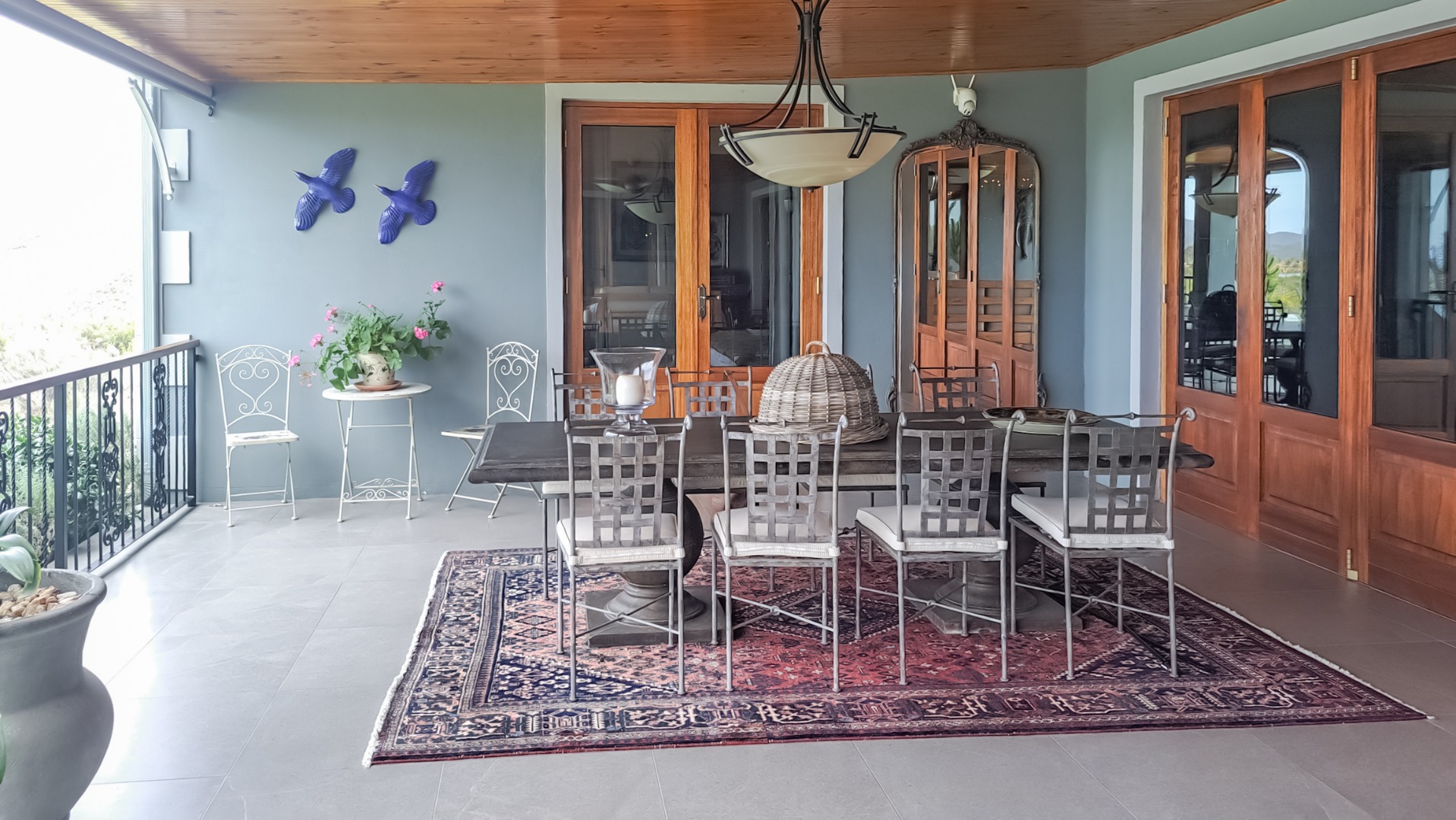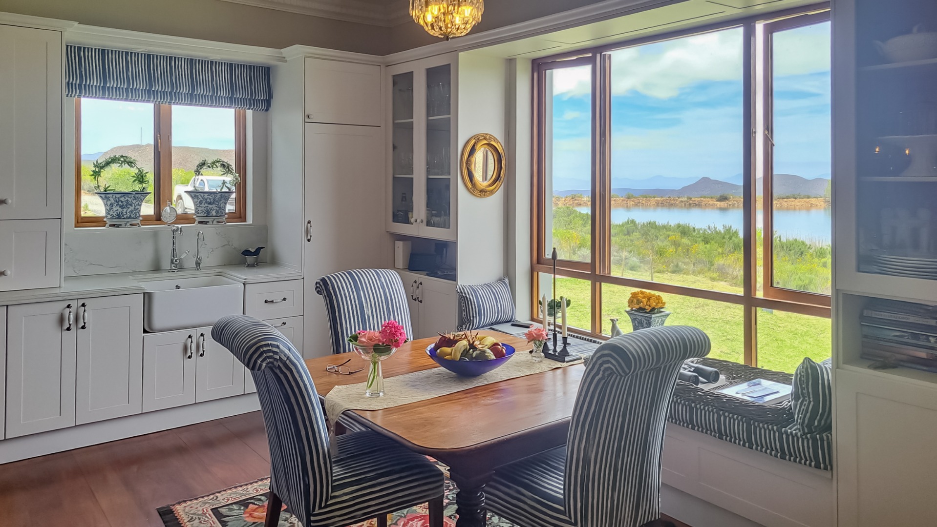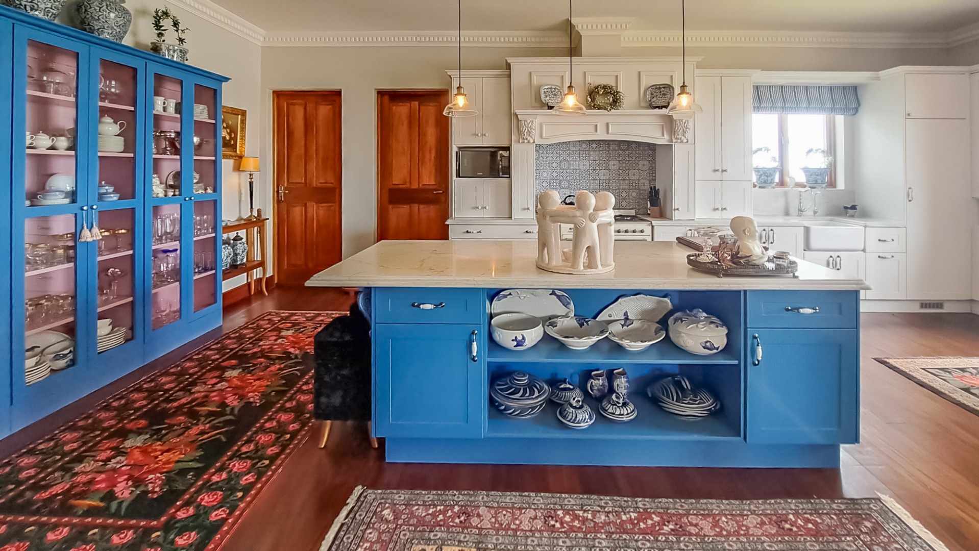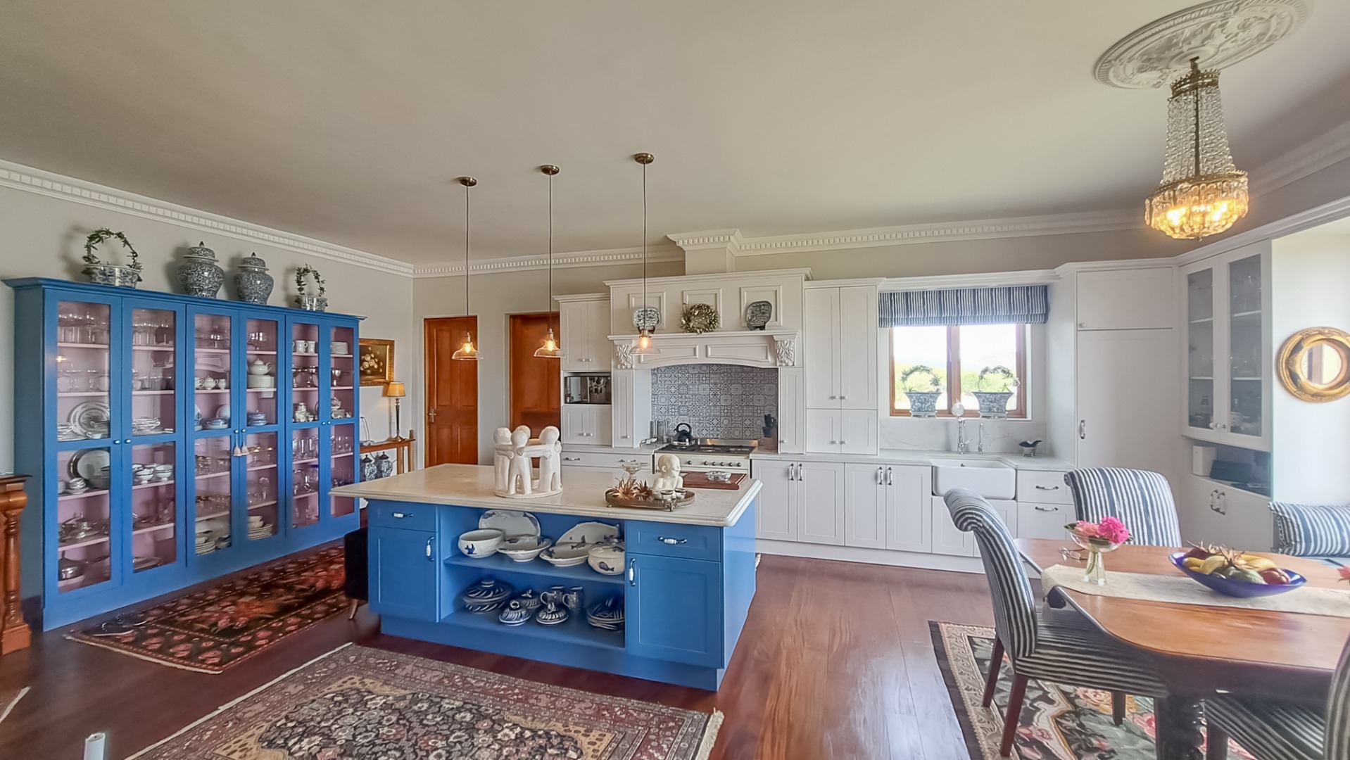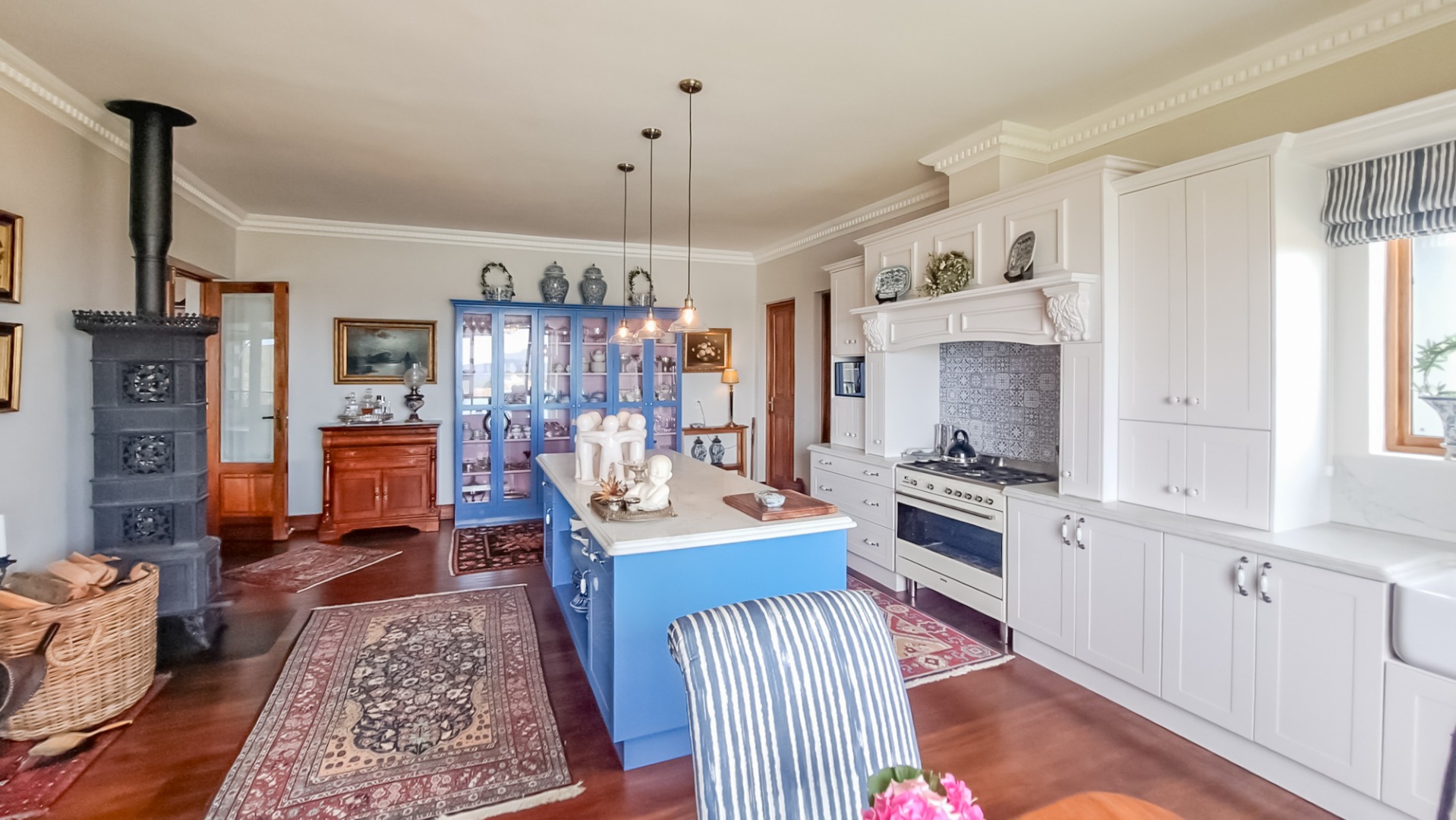 The kitchen is very spacious with a dark blue central island with cupboards and shelves and a quarts countertops, and a Smeg gas stove, set against the wall with a blue tile splash back. The built-in kitchen cupboards are white with recessed coffee station and bread station. There is a free-standing wood and glass display cupboard. There is also an antique black Norwegian fireplace. There is a separate scullery and laundry the countertops are also quartz.