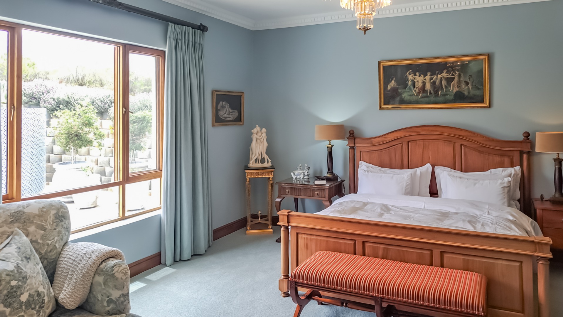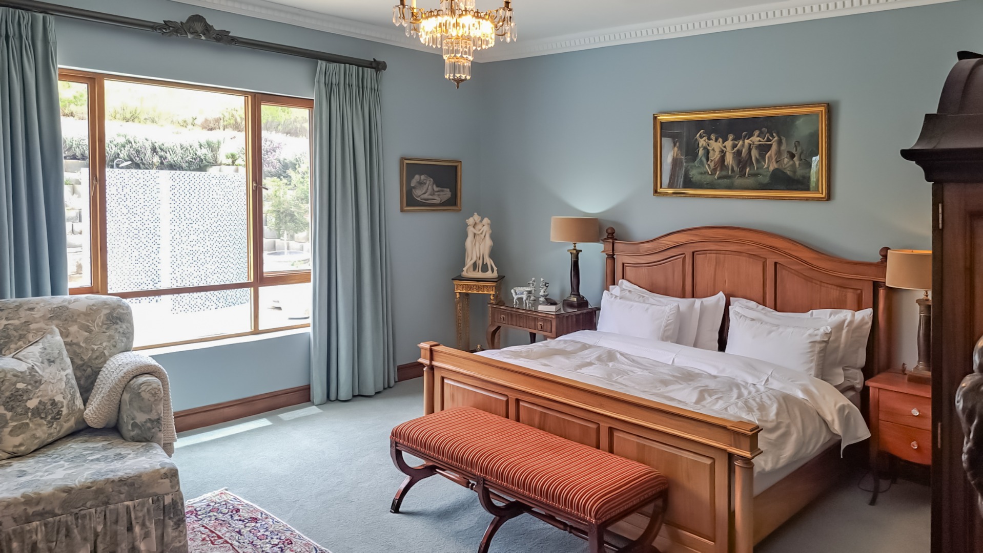 The house is sold unfurnished, but certain items may be available for purchase, by negotiation. The chandeliers and certain other light fittings do not go with the house.