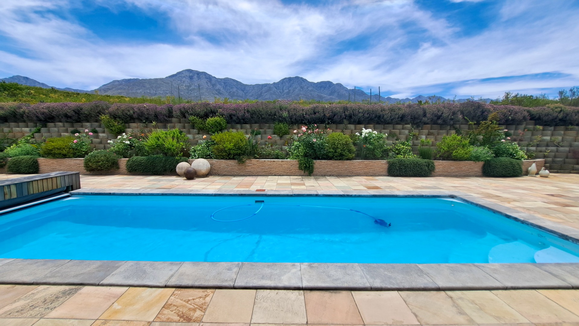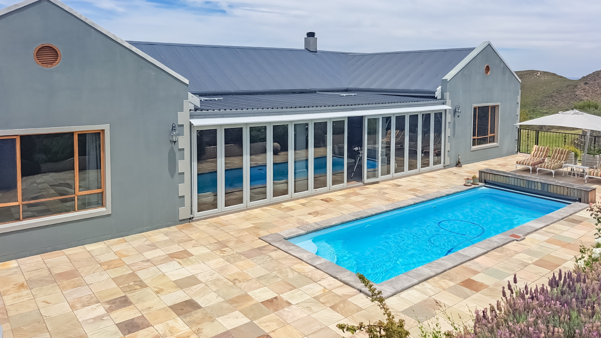 On the northern side of the house is a very extensive saltwater pool patio which is tiled in sandstone. On one side are raised garden beds The pool is 9 metres long, 3 metres wide and 2 metres, deep. The pool has a retractable pool cover. Leading inside from the pool patio is an indoor enclosed patio with aluminum sliding doors and a tiled floor. There is a 3-car garage and a workshop. There is an ATV which is included in the asking price.