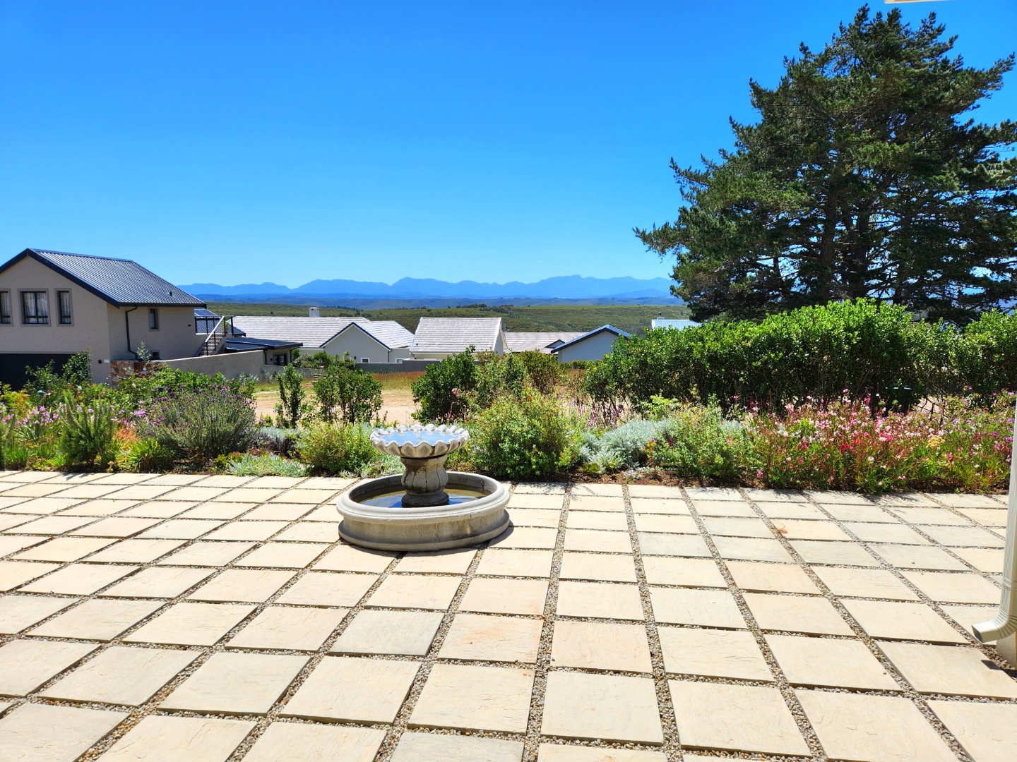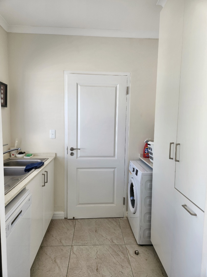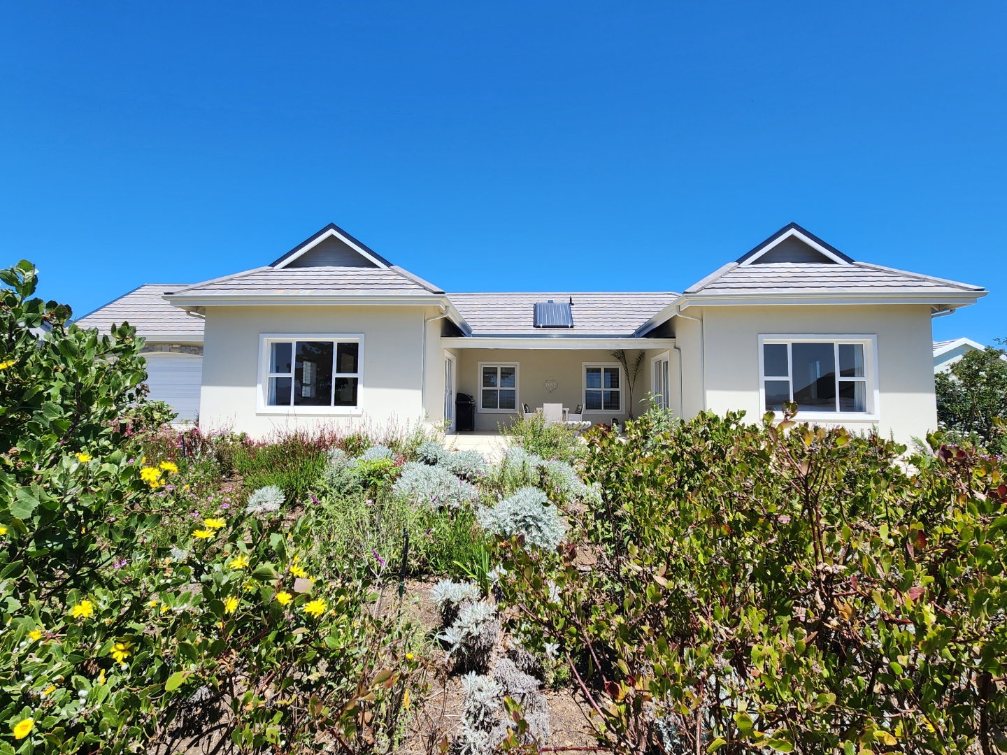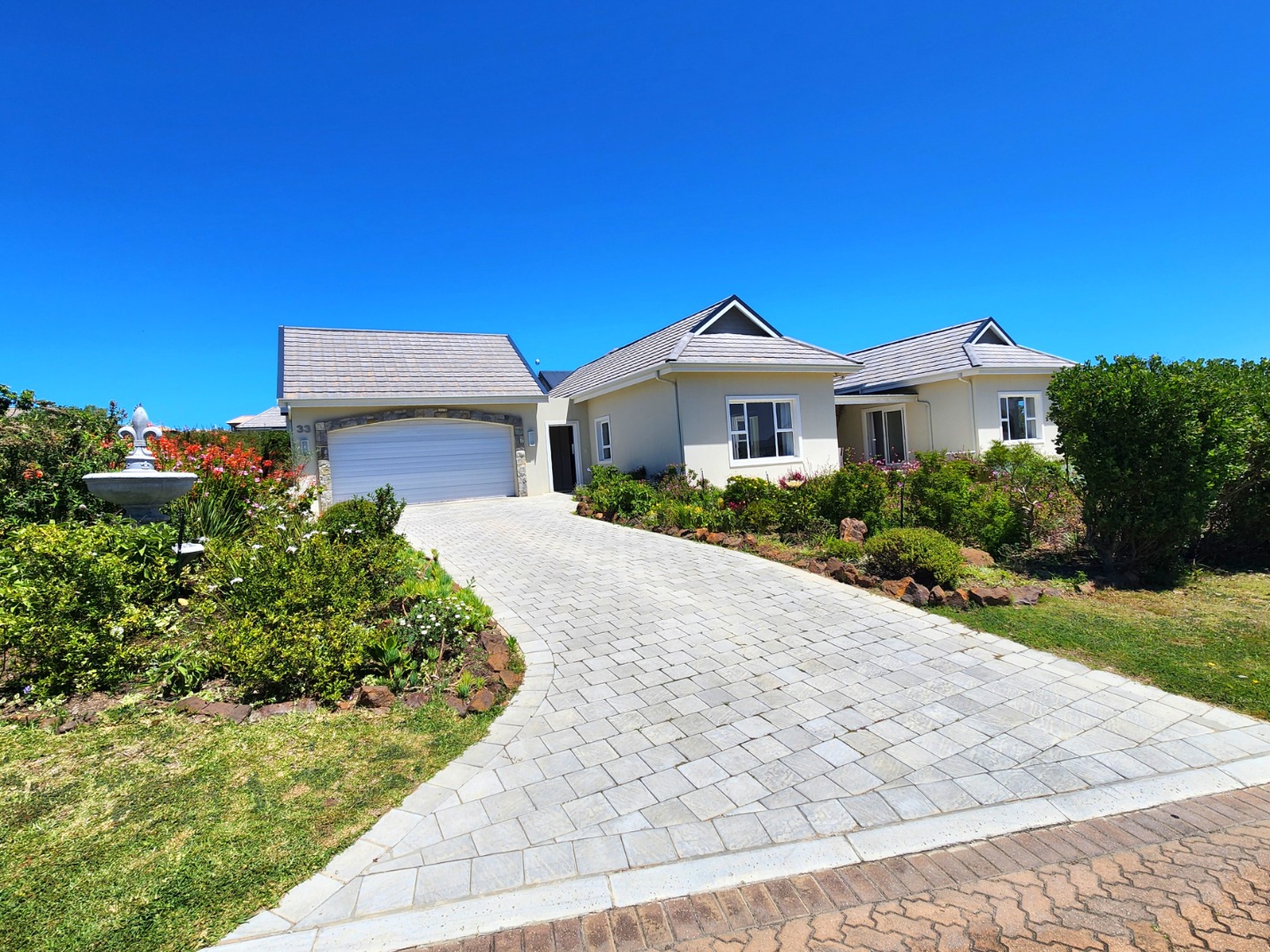 Bright and immaculate, north facing home on a corner property in a cul de sac in Barons View Estate. A well designed home, all on one level with open plan lounge, dining room, kitchen with gas stove, electric oven and extractor, granite finishes, separate laundry/scullery interleading to the double garage. 3 spacious bedrooms (carpeted), 2 bathrooms, main en suite. The living room and the master bedroom both lead out to a large covered patio, overlooking the pretty, colourful, irrigated garden. The mountain view is magnificent. The peace and tranquility is perfect. Homes of this quality and price seldom come up for sale in this prestigious estate.