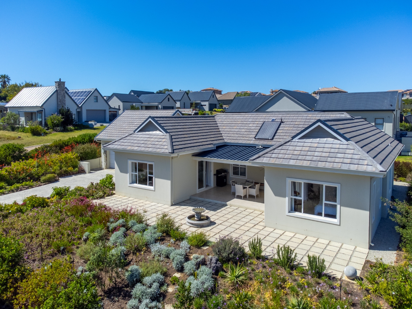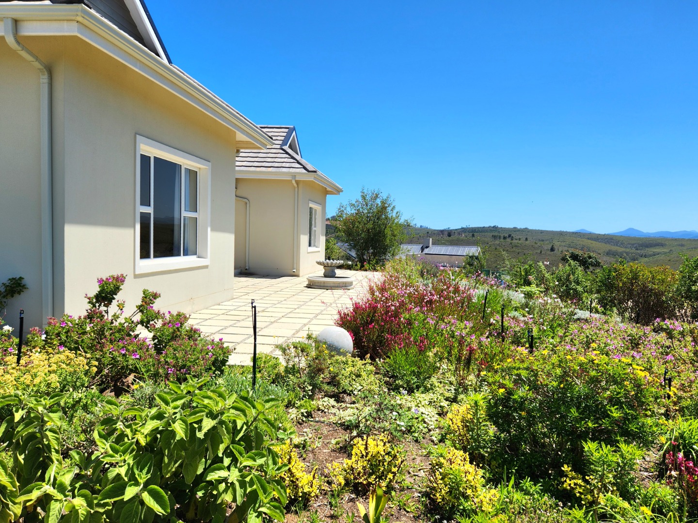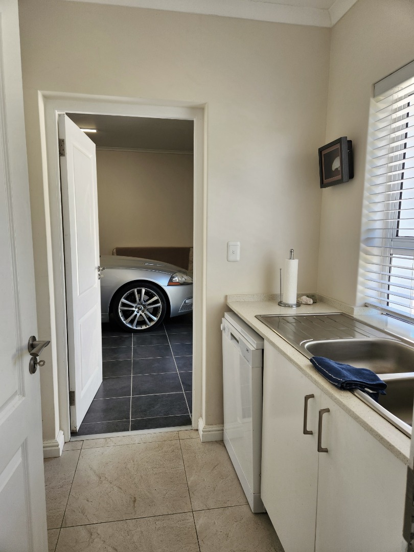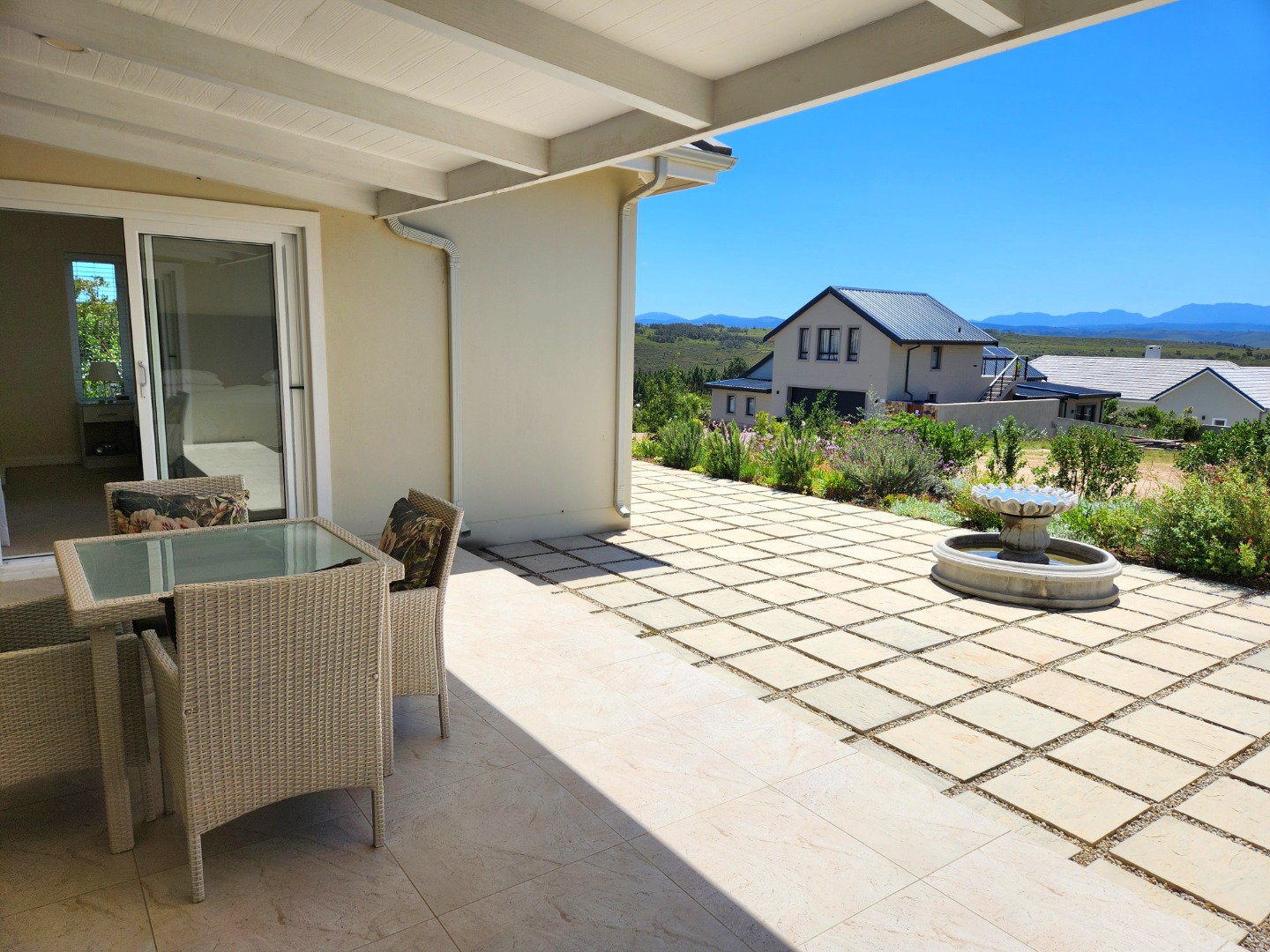 Bright and immaculate, north facing home on a corner property in a cul de sac in Barons View Estate. A well designed home, all on one level with open plan lounge, dining room, kitchen with gas stove, electric oven and extractor, granite finishes, separate laundry/scullery interleading to the double garage. 3 spacious bedrooms (carpeted), 2 bathrooms, main en suite. The living room and the master bedroom both lead out to a large covered patio, overlooking the pretty, colourful, irrigated garden. The mountain view is magnificent. The peace and tranquility is perfect. Homes of this quality and price seldom come up for sale in this prestigious estate.