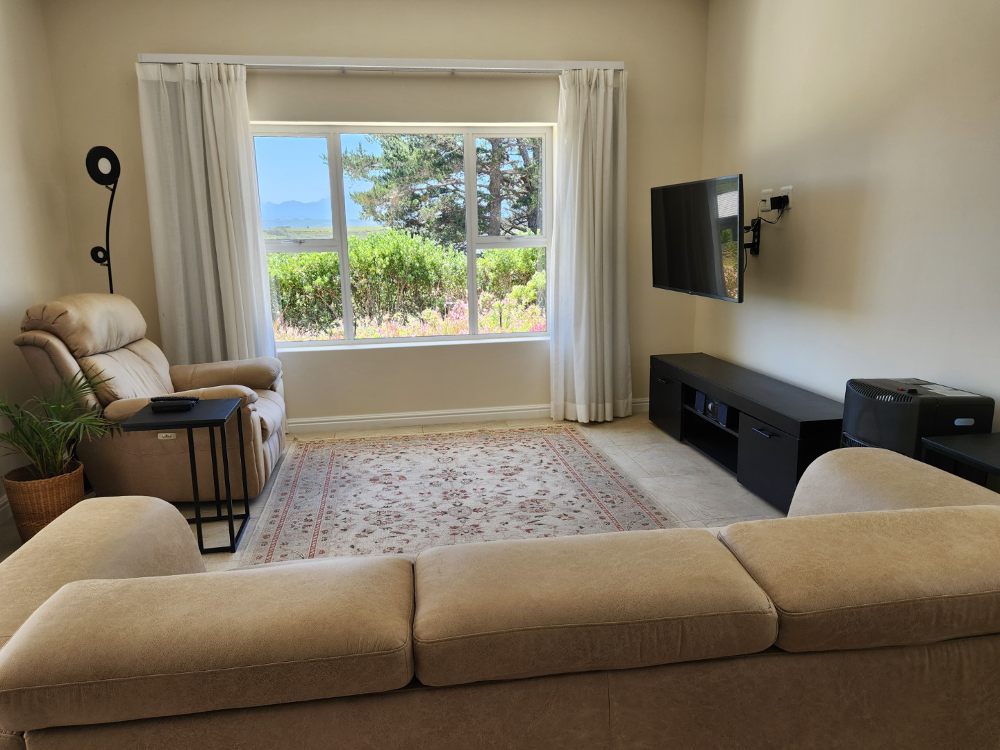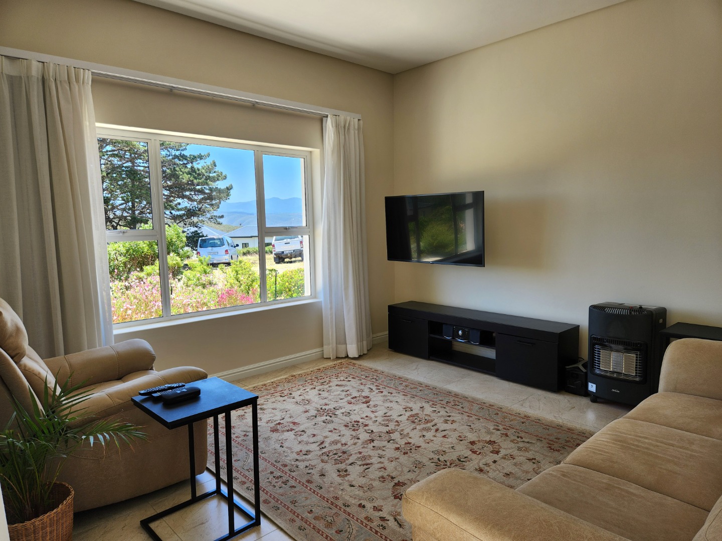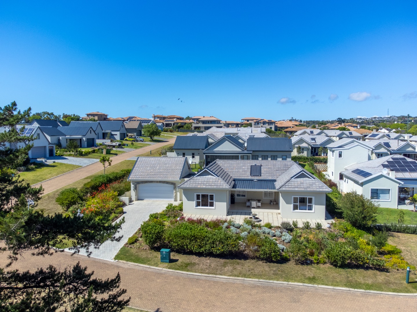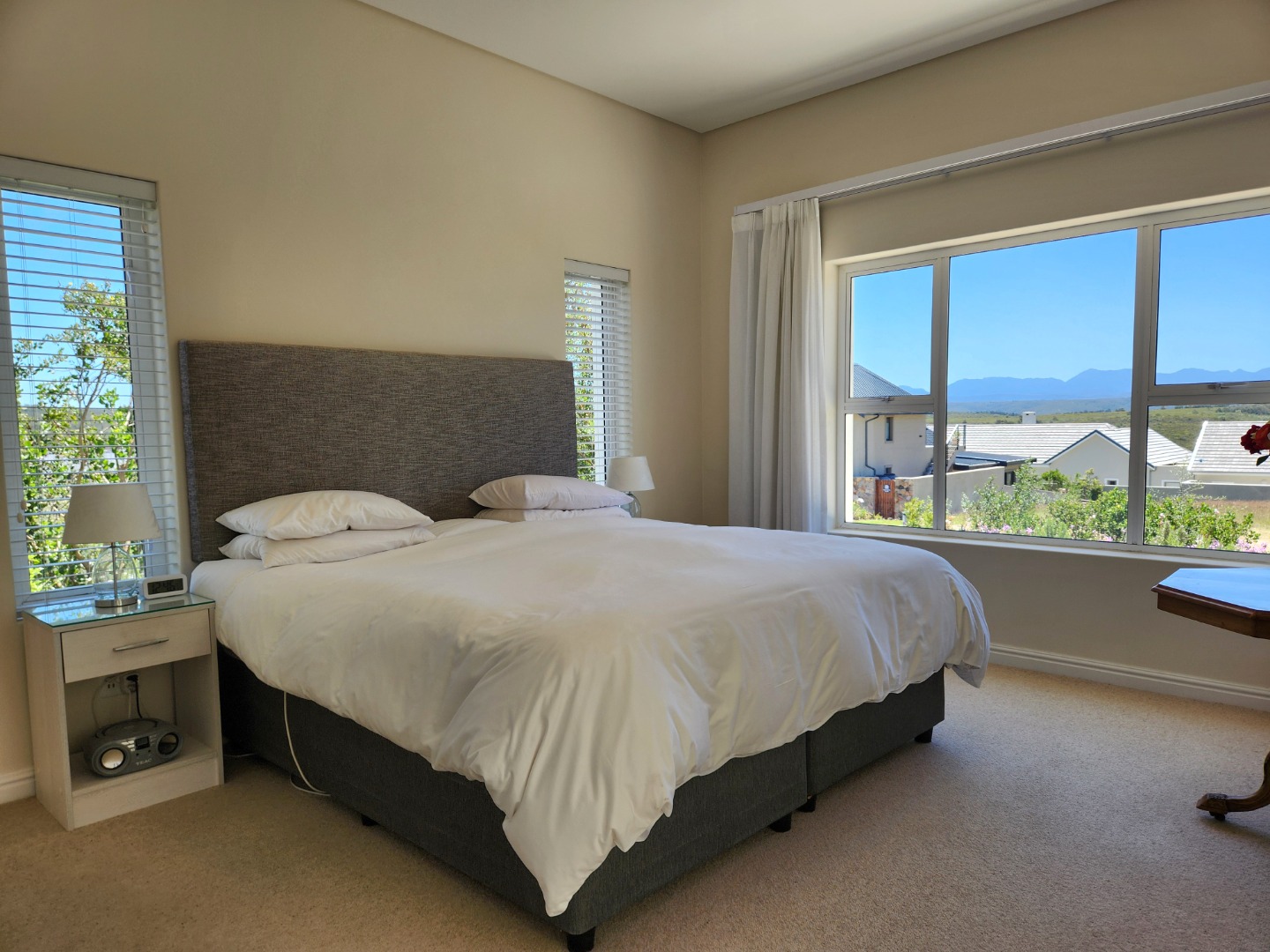 Bright and immaculate, north facing home on a corner property in a cul de sac in Barons View Estate. A well designed home, all on one level with open plan lounge, dining room, kitchen with gas stove, electric oven and extractor, granite finishes, separate laundry/scullery interleading to the double garage. 3 spacious bedrooms (carpeted), 2 bathrooms, main en suite. The living room and the master bedroom both lead out to a large covered patio, overlooking the pretty, colourful, irrigated garden. The mountain view is magnificent. The peace and tranquility is perfect. Homes of this quality and price seldom come up for sale in this prestigious estate.