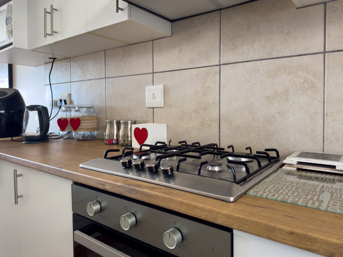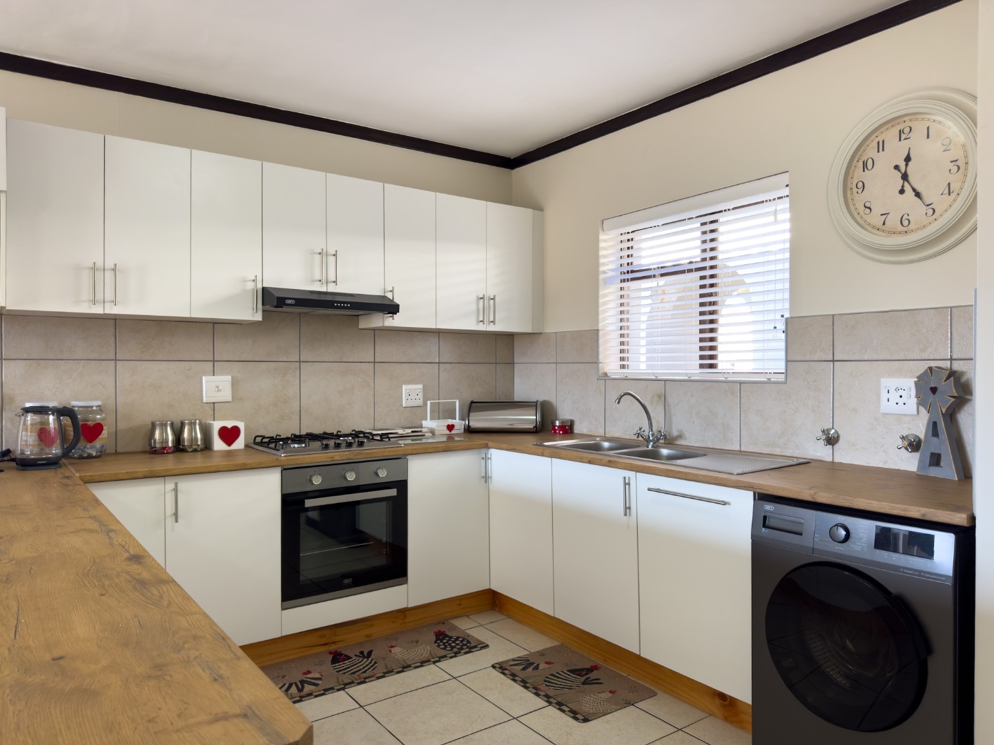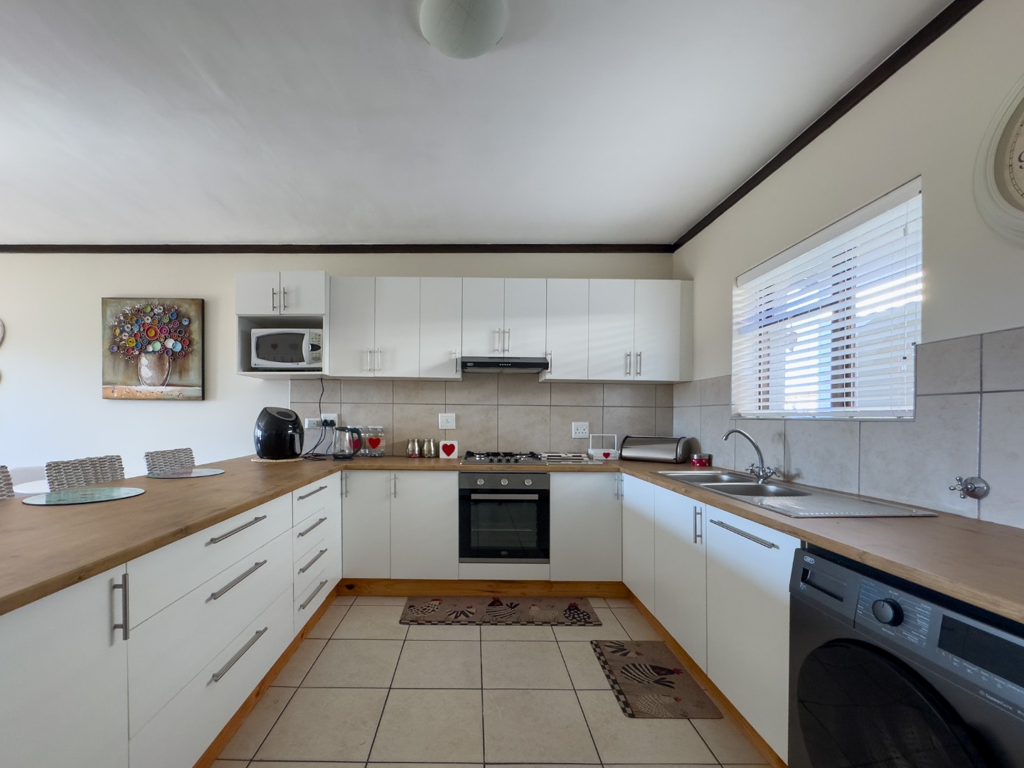 - Modern kitchen with white cabinetry, built-in oven, gas hob, and ample cupboard space