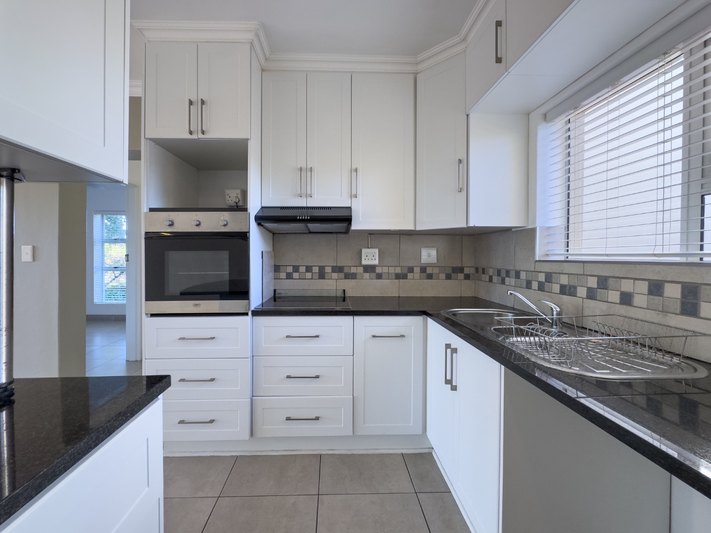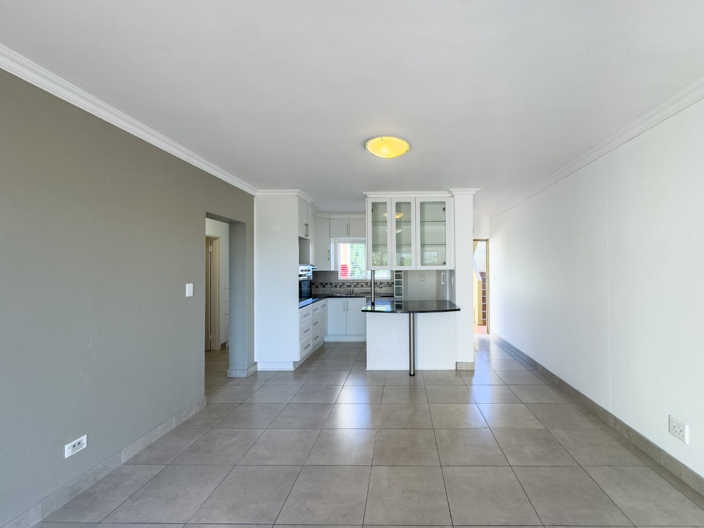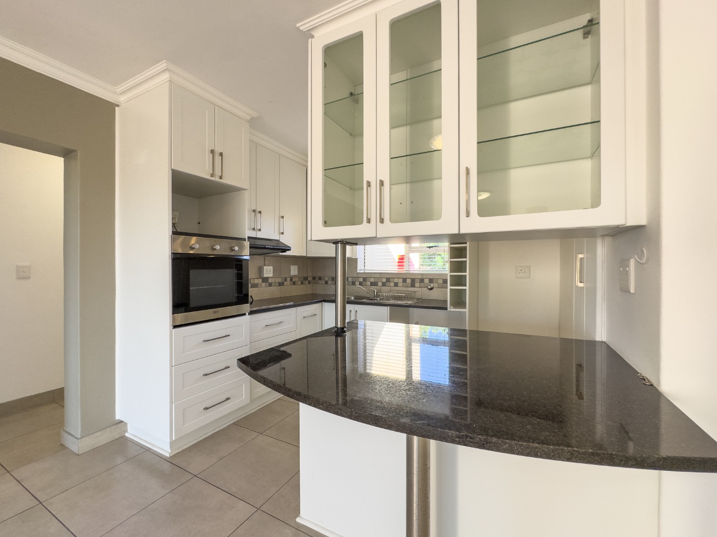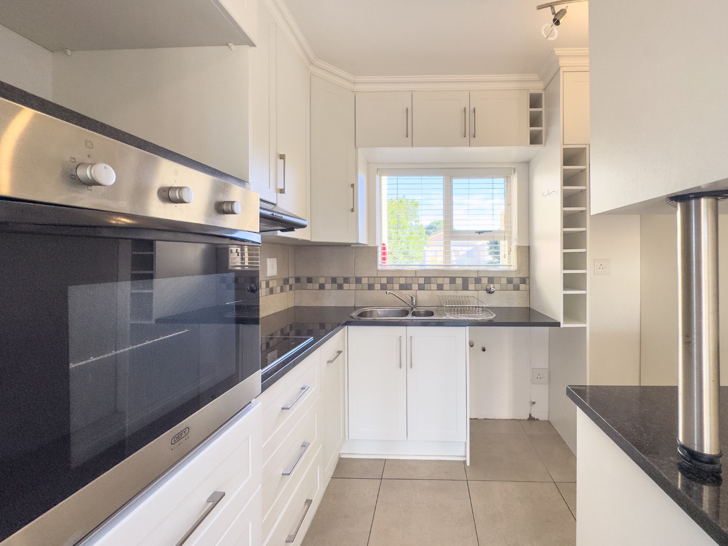 The kitchen has been tastefully upgraded with modern built-in cupboards, granite countertops, a double wash-up basin, an eye-level oven and an electric hob. A breakfast counter and built-in wine rack add both functionality and charm. Plumbing is available for one appliance in the kitchen, and an additional appliance can be plumbed into a built-in unit in the second bedroom.