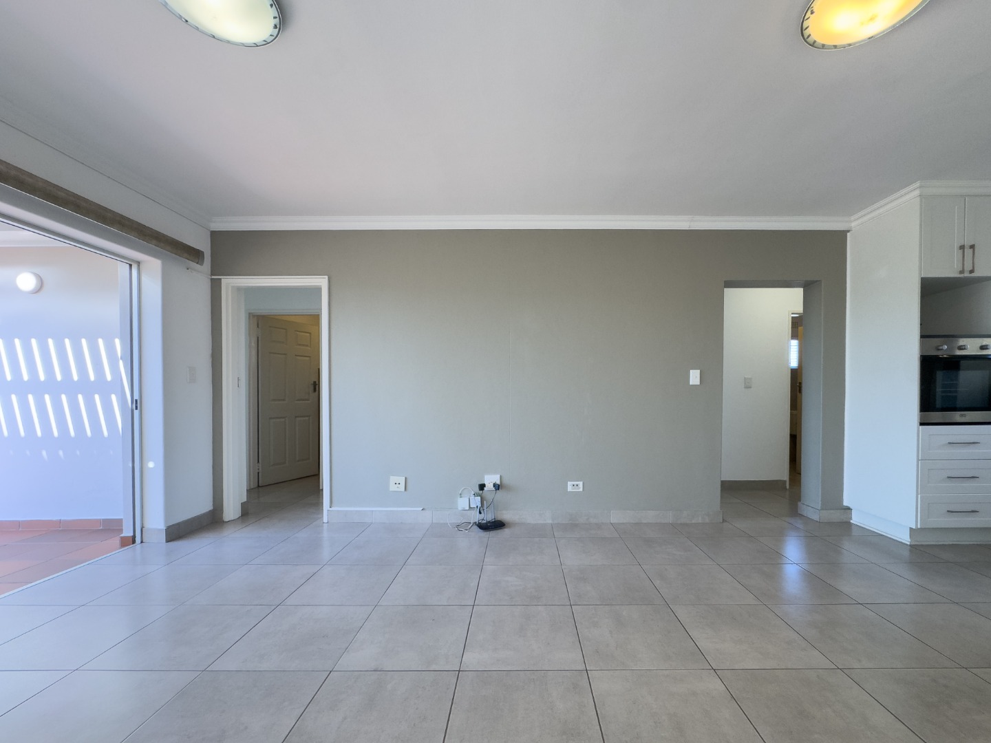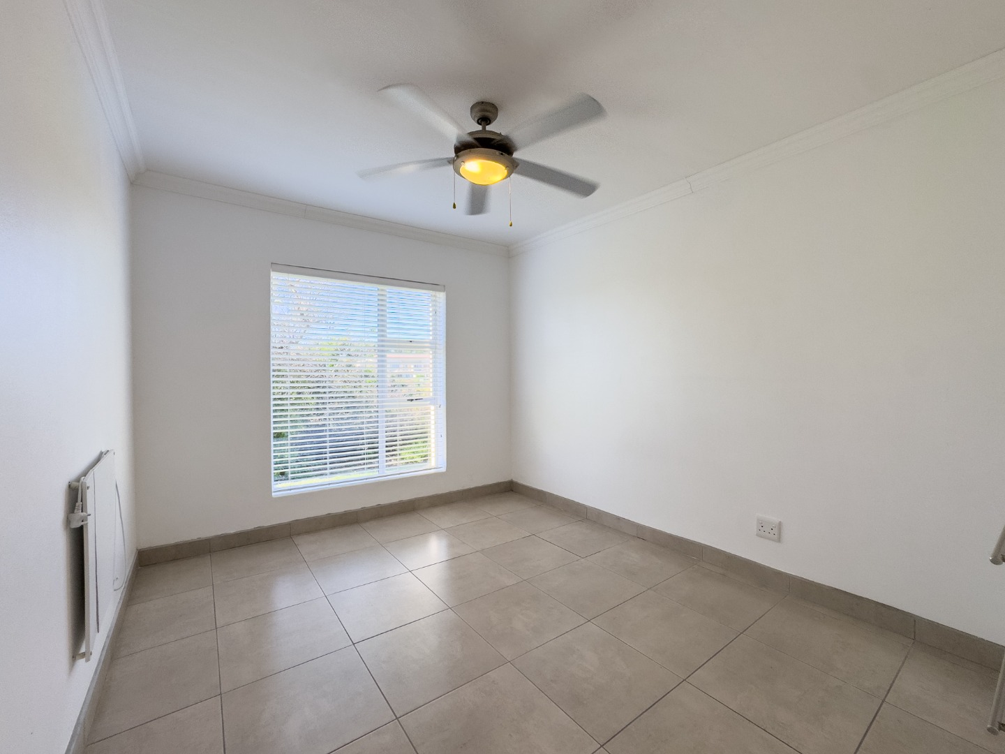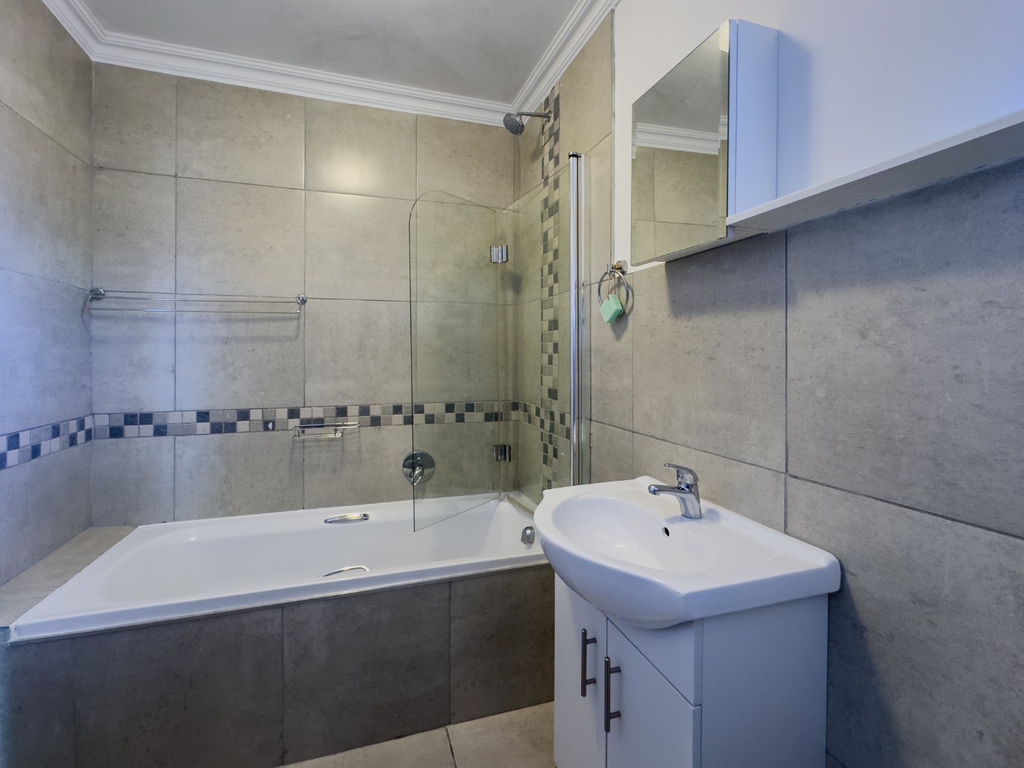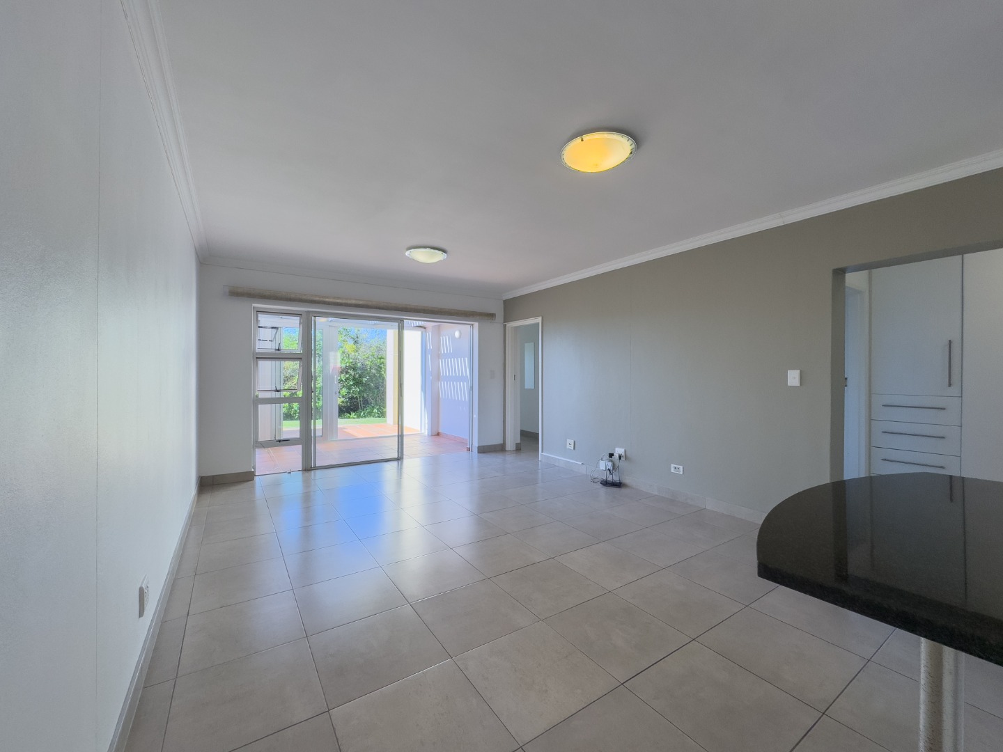 The kitchen has been tastefully upgraded with modern built-in cupboards, granite countertops, a double wash-up basin, an eye-level oven and an electric hob. A breakfast counter and built-in wine rack add both functionality and charm. Plumbing is available for one appliance in the kitchen, and an additional appliance can be plumbed into a built-in unit in the second bedroom.