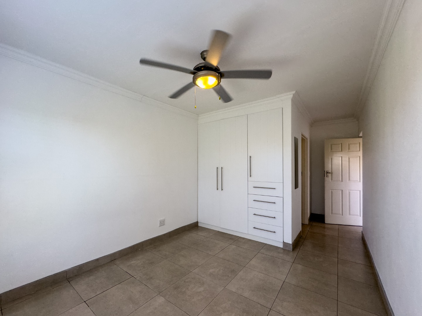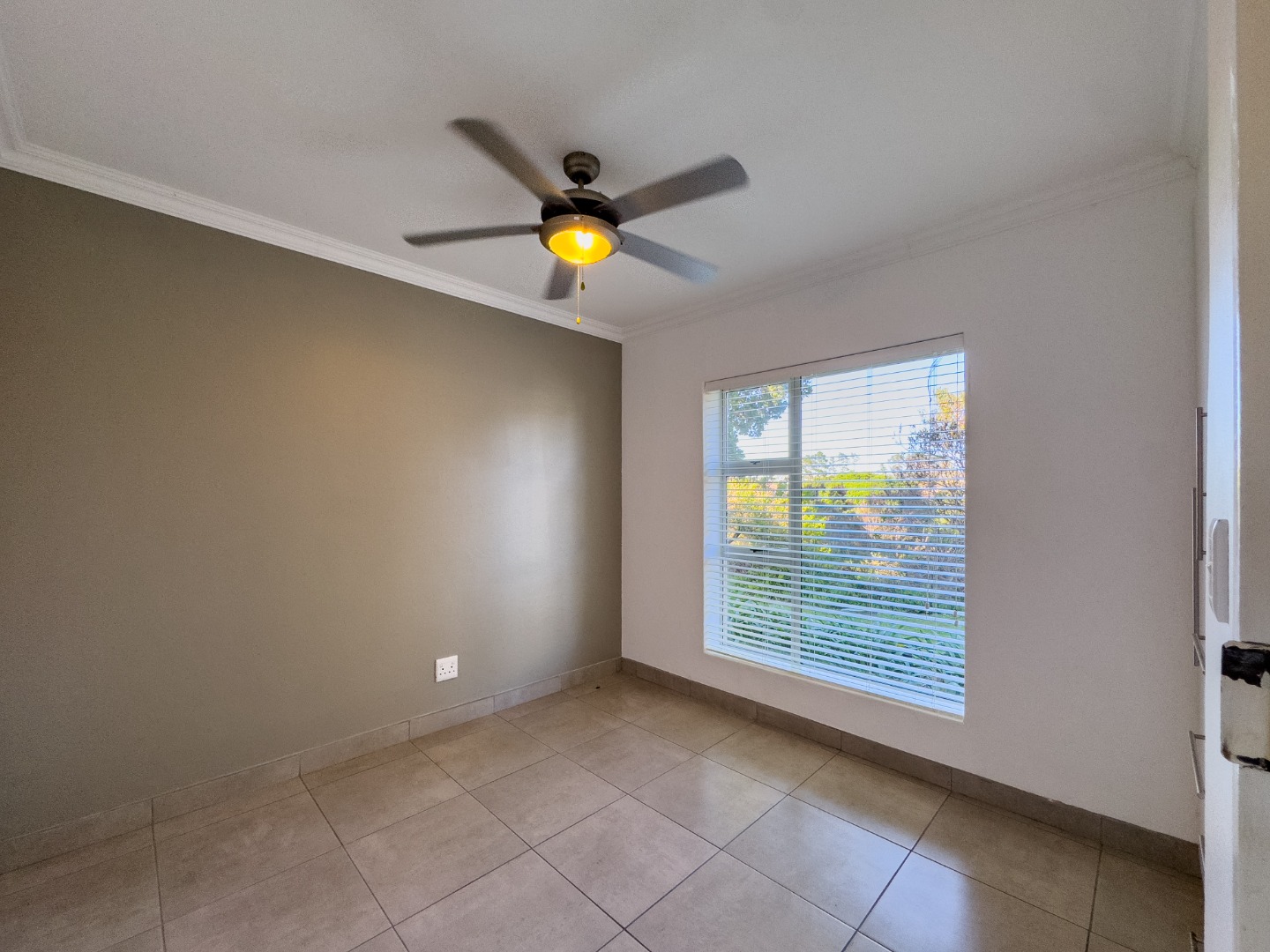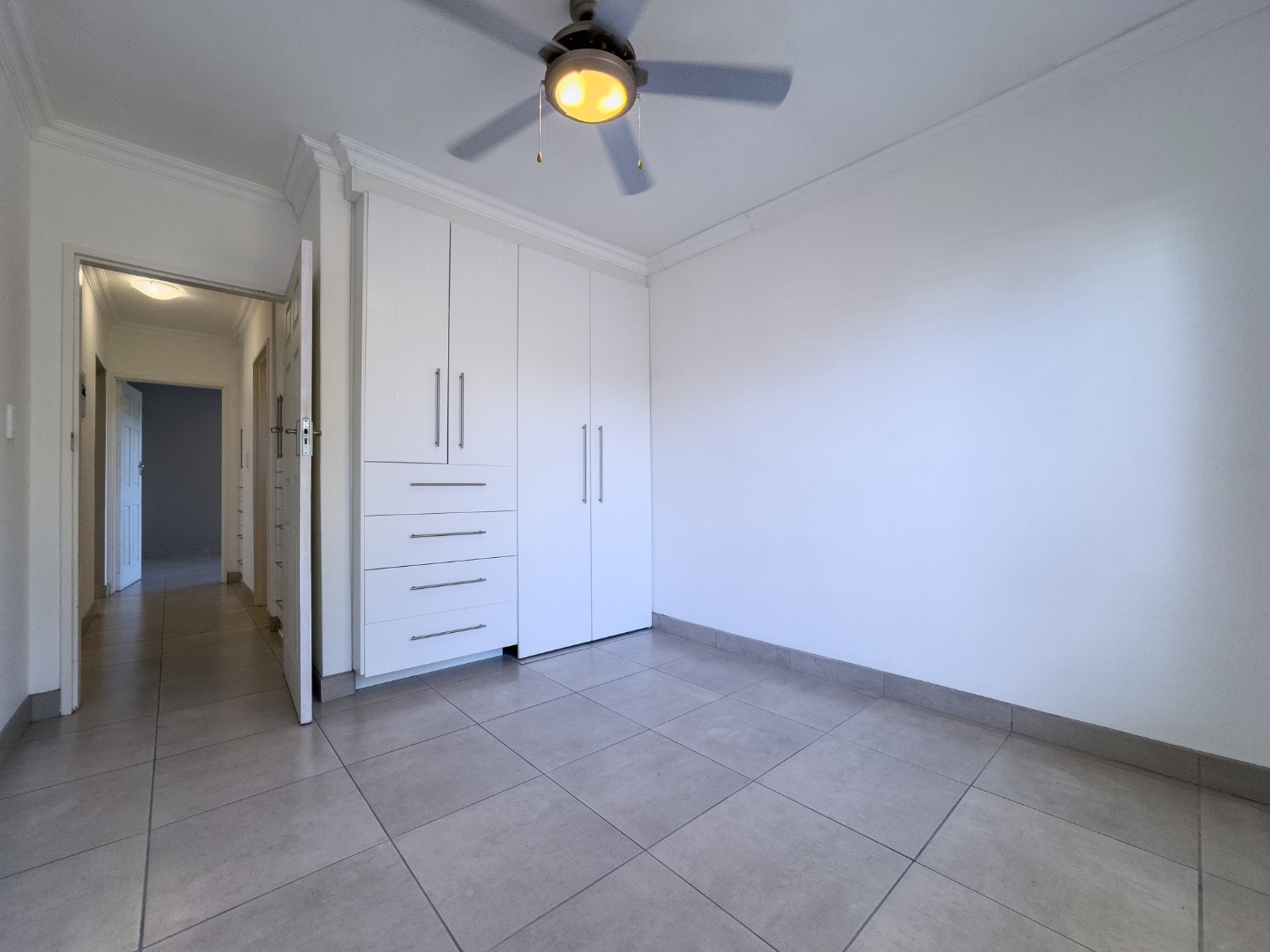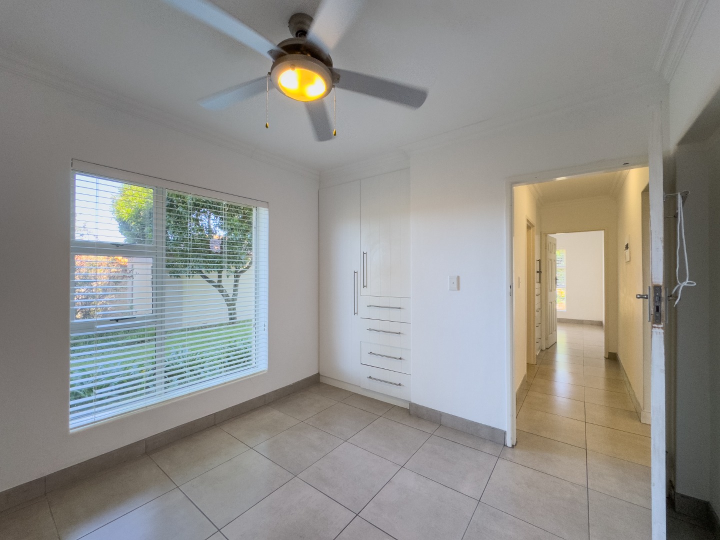 The kitchen has been tastefully upgraded with modern built-in cupboards, granite countertops, a double wash-up basin, an eye-level oven and an electric hob. A breakfast counter and built-in wine rack add both functionality and charm. Plumbing is available for one appliance in the kitchen, and an additional appliance can be plumbed into a built-in unit in the second bedroom.