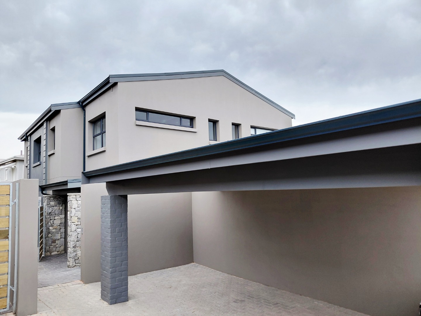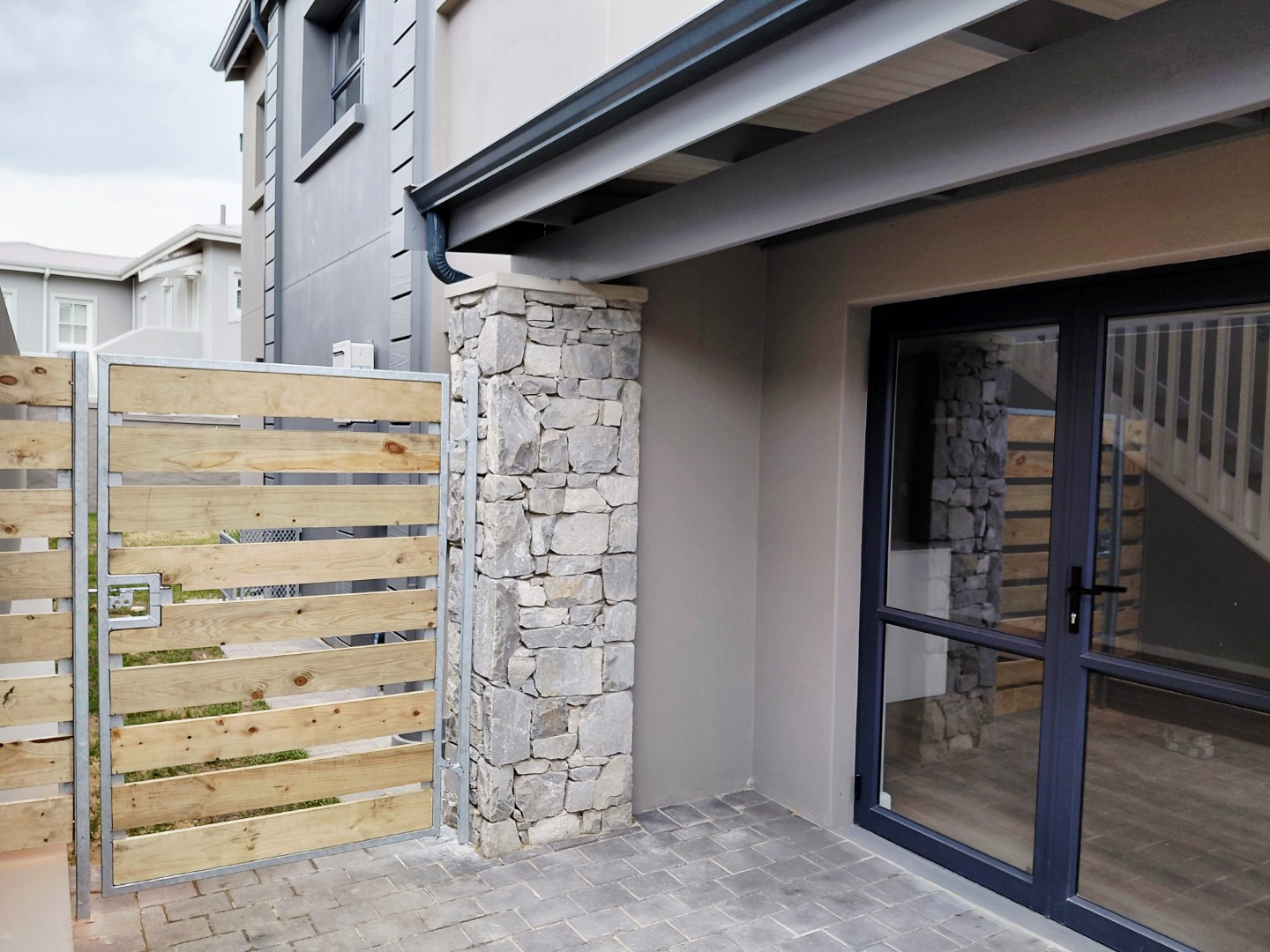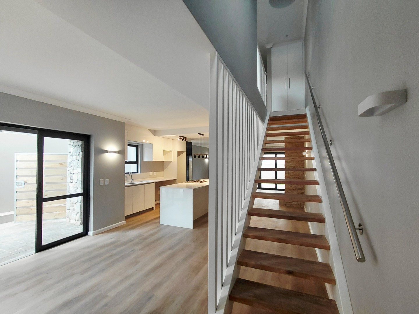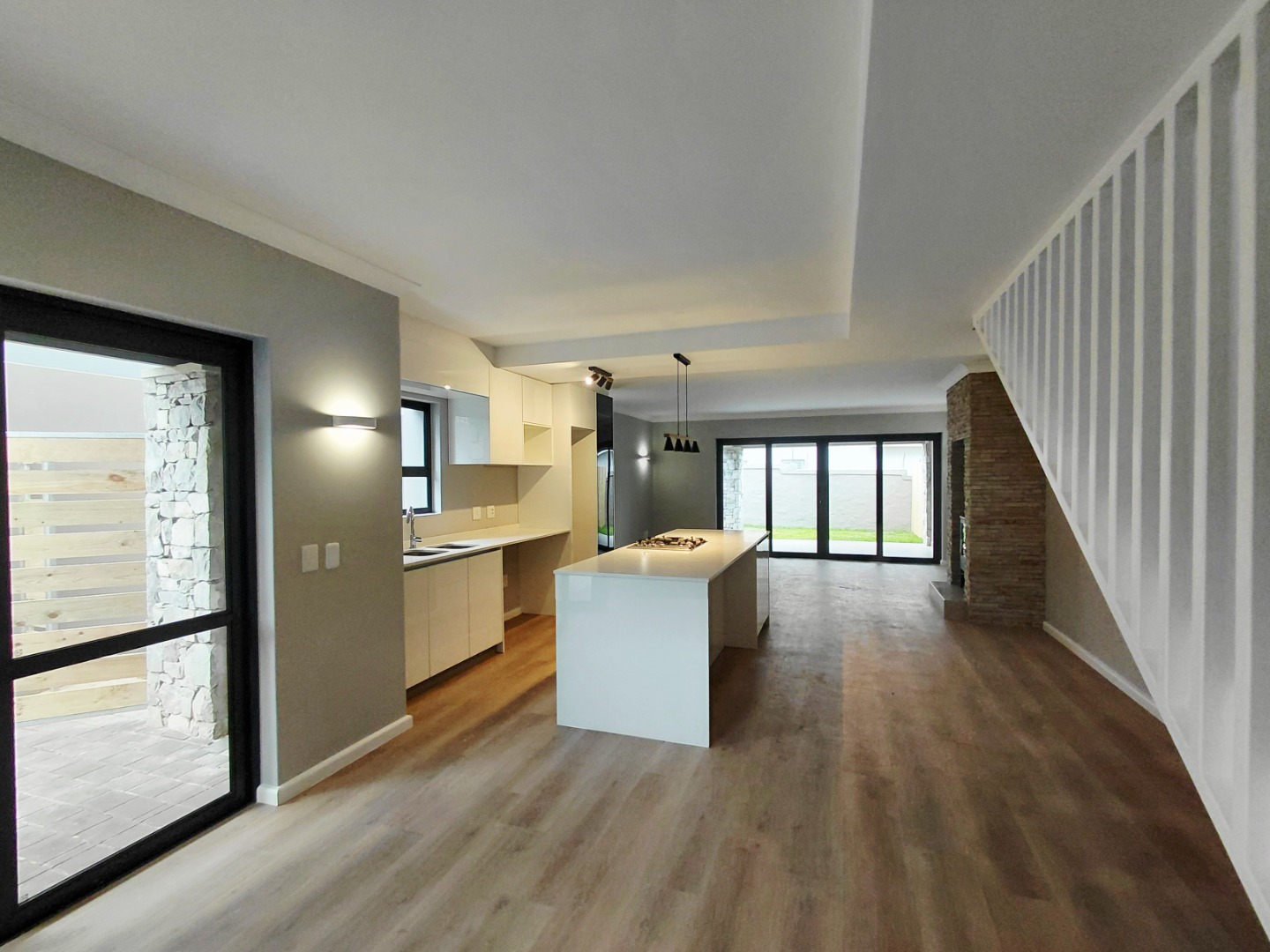 Discover modern living in this contemporary 3-bedroom, 2-bathroom home situated within a secure gated community in Plettenberg Bay Central. The residence boasts an inviting open-plan layout, seamlessly connecting the living, dining, and kitchen areas. Modern finishes, including elegant wood-look flooring and a neutral colour palette, create a sophisticated atmosphere. The sleek kitchen features an integrated gas hob on a stylish island, while large glass sliding doors flood the space with natural light and provide access to both a private courtyard and a rear garden. A striking stone-clad feature wall with a fireplace adds character and warmth, complemented by a contemporary open-tread staircase.