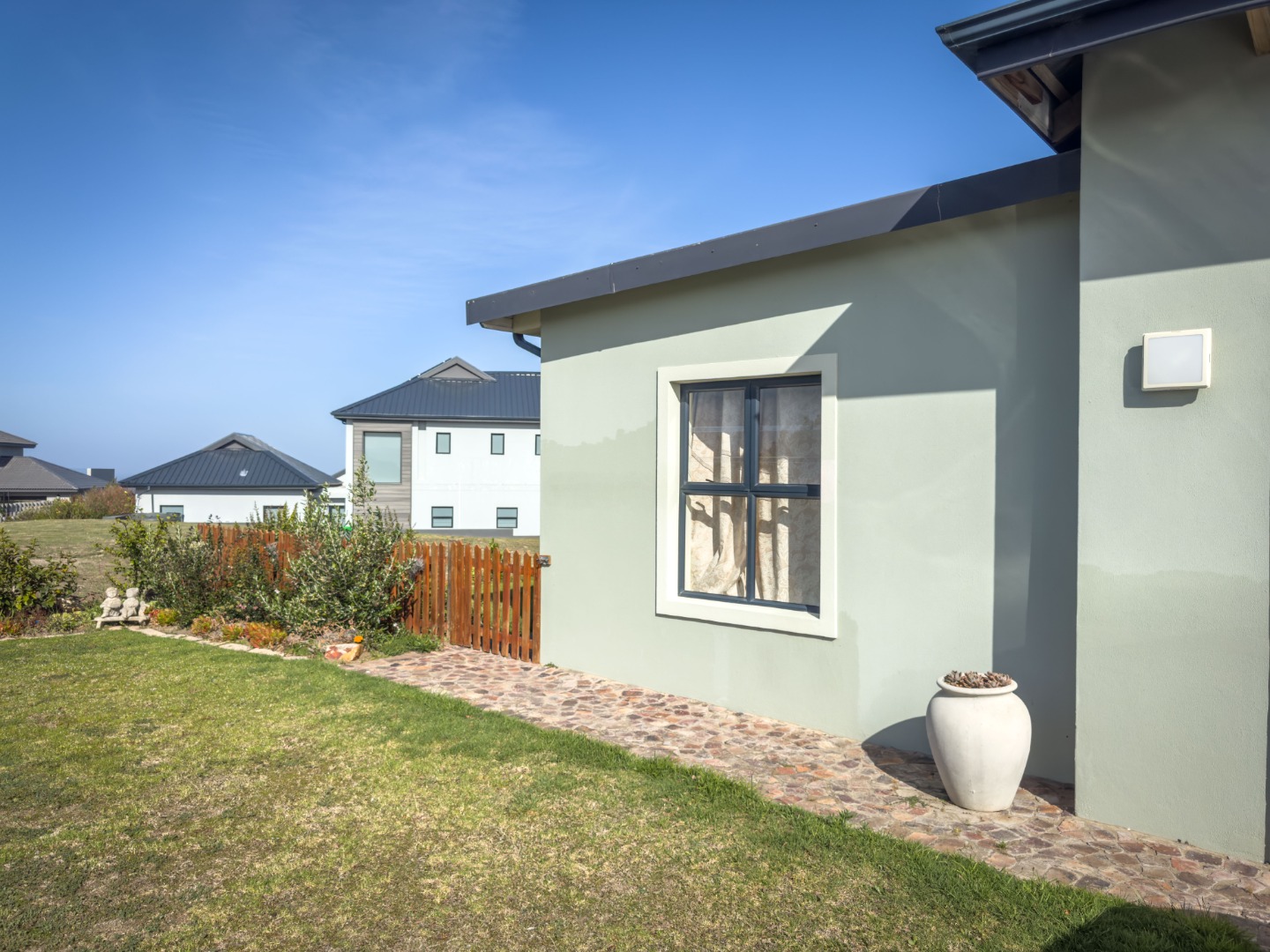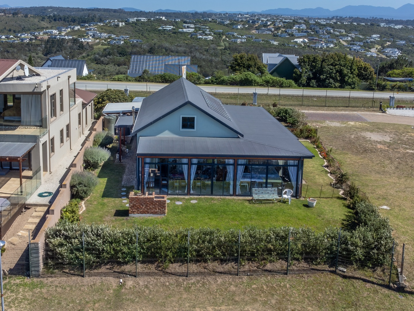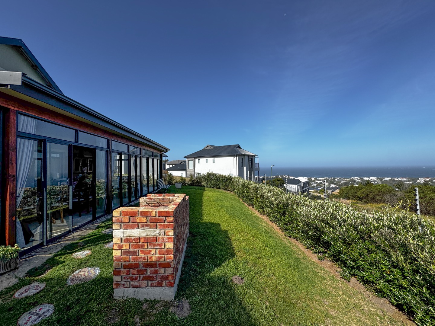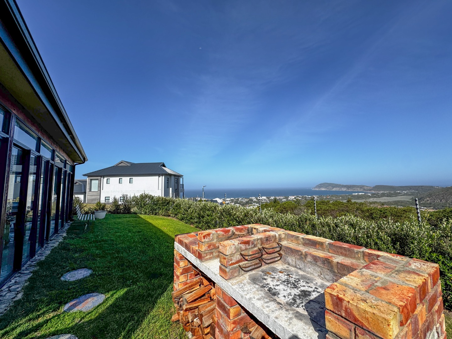 Attractive, single storey home, well positioned and elevated, within a small security estate, with magnificent sea and Robberg views. The home consists of an open plan lounge, dining room with a lovely coal stove, kitchen, enclosed patio/sunroom, built-in braai, 2 bedrooms, 2 bathrooms, double garage, carport. Extras include 3 water tanks, 5 kw invertor, fiber availability, solar. The garden is partially enclosed to accommodate pets.