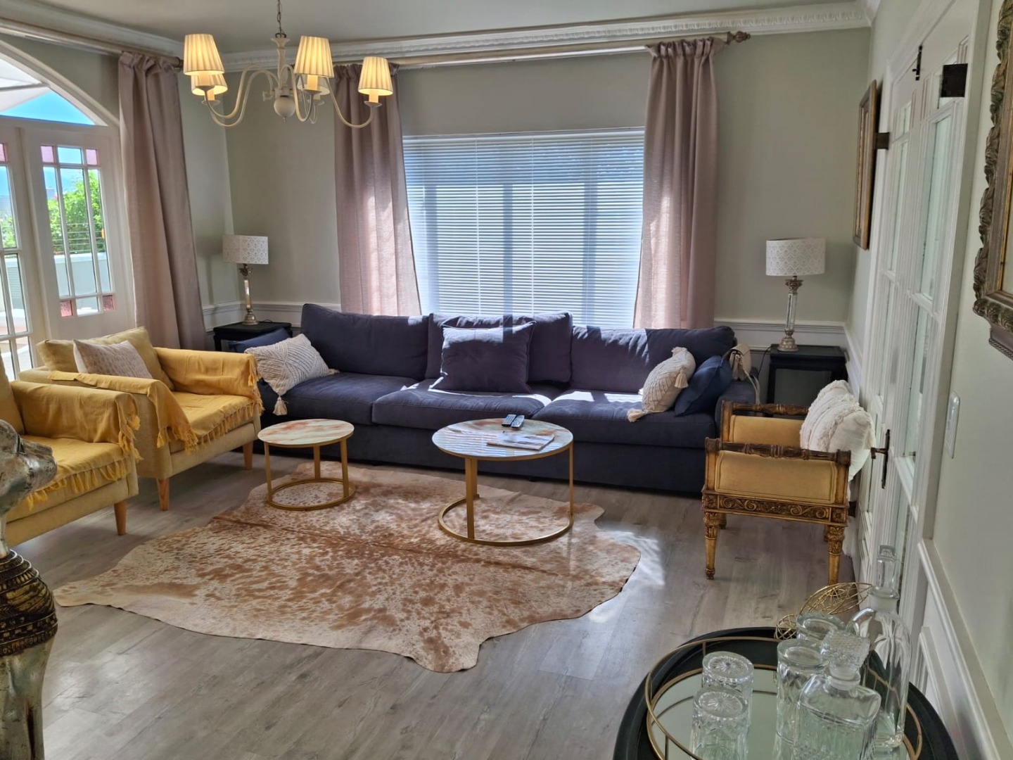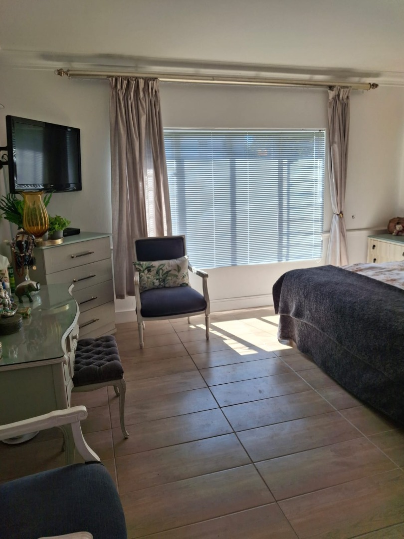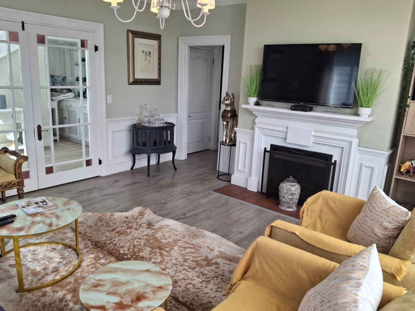 Lovely, private, well-furnished lounge with fireplace, doors open to a lovely deck area, TV with full DSTV.