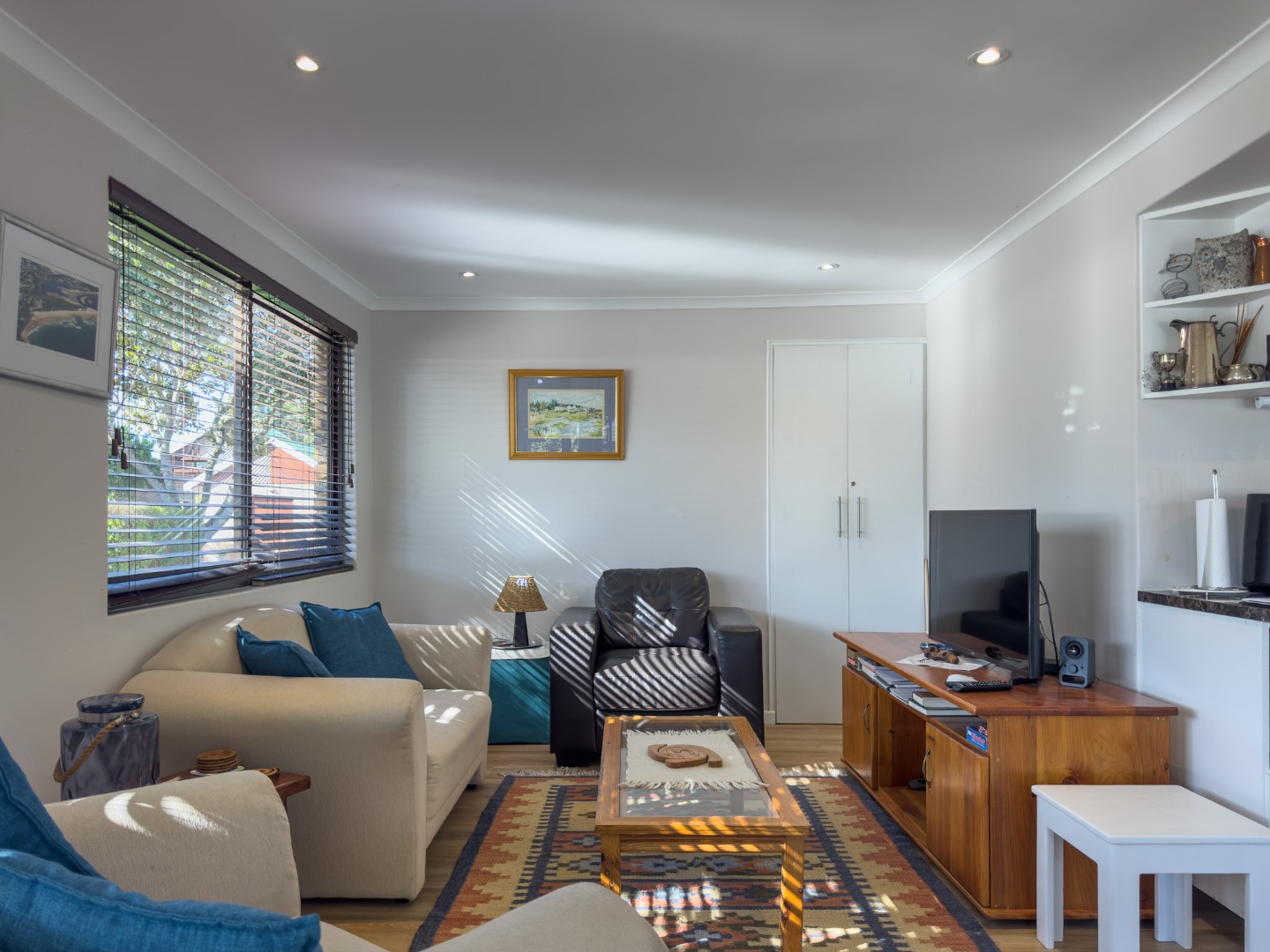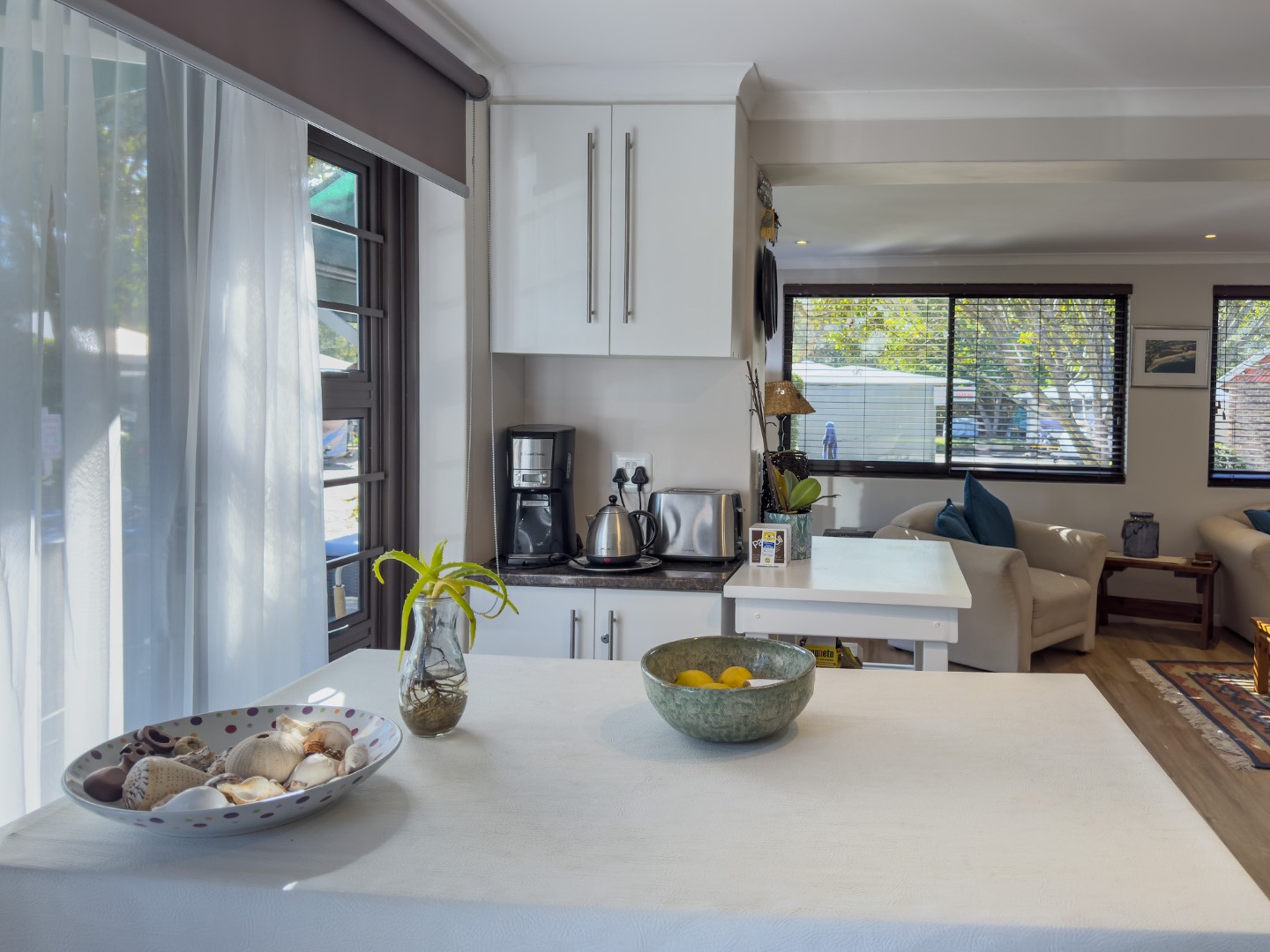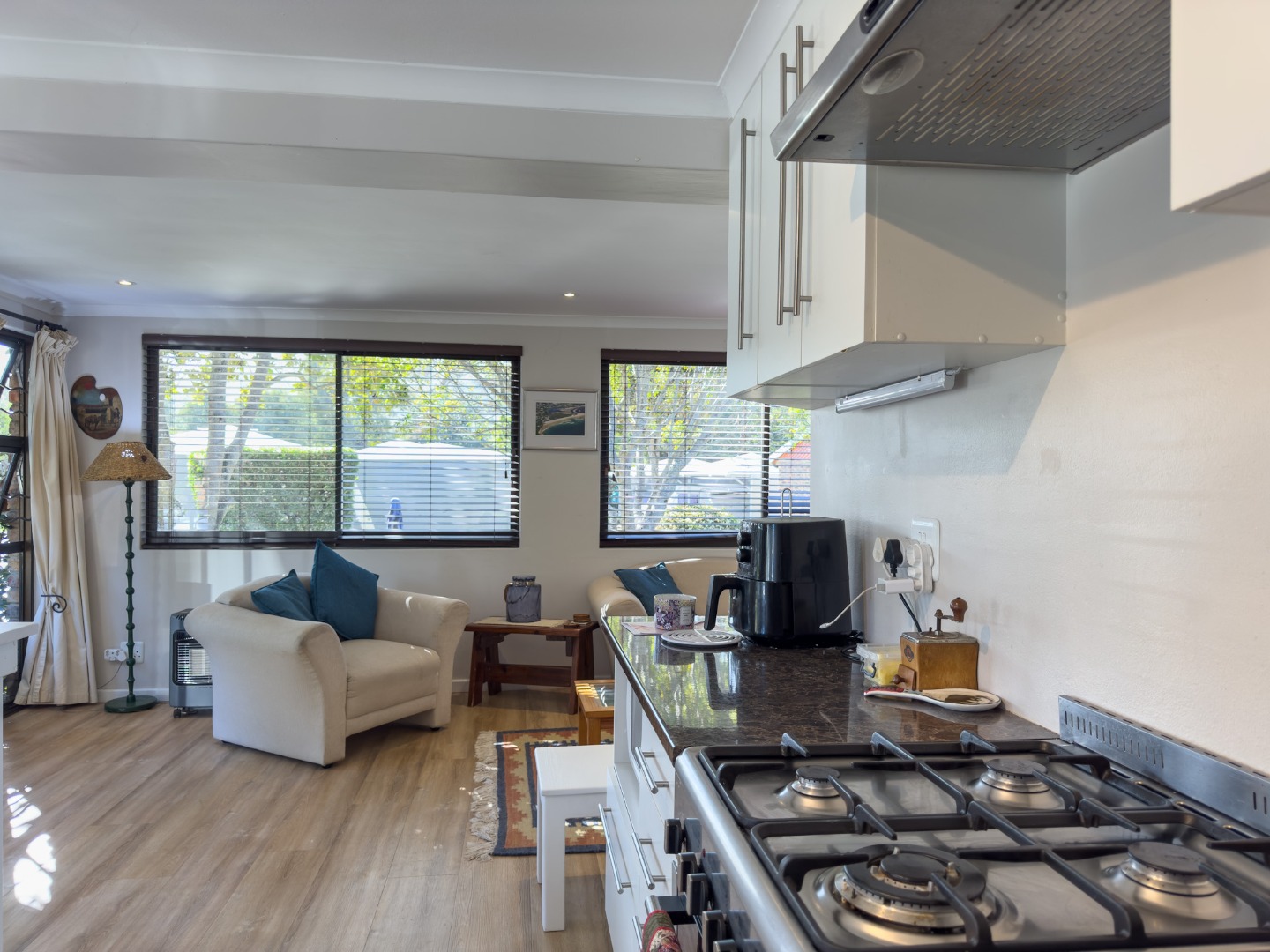 Open plan lounge with comfy sofa and armchairs, Smart TV with compac DSTV channel, guests can stream their own viewing channels.