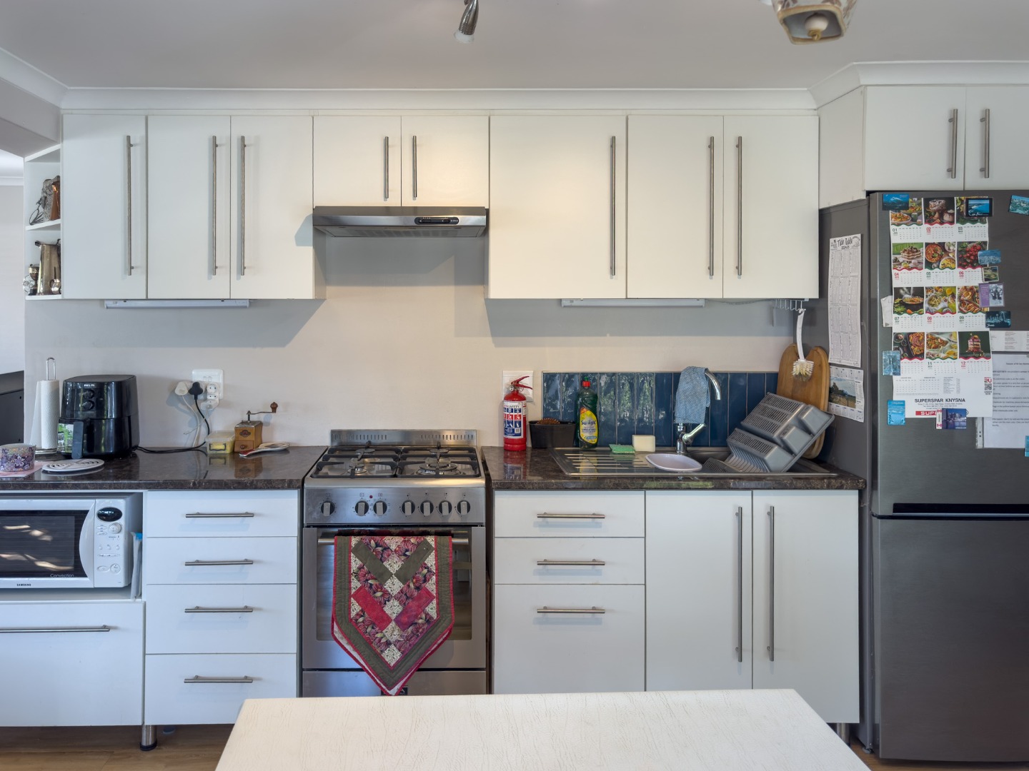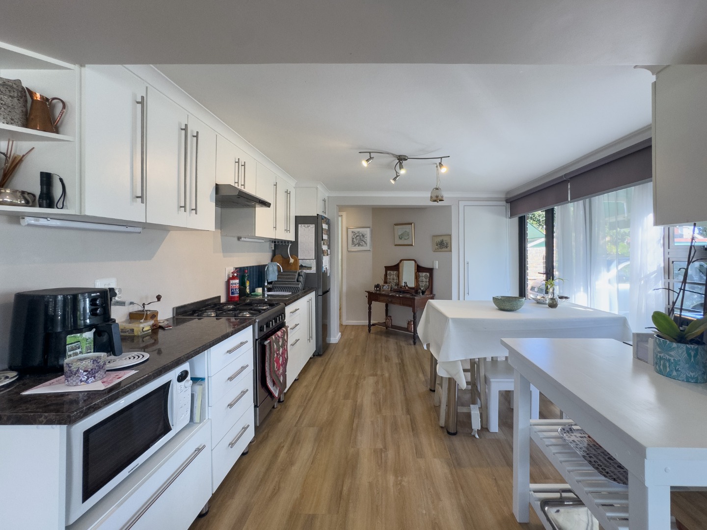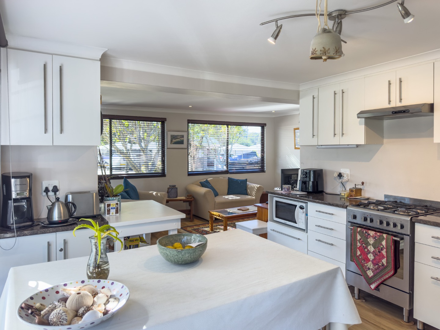 Neat open plan well-equipped kitchen with gas hob, electric oven, microwave, coffee machine, fridge/freezer.