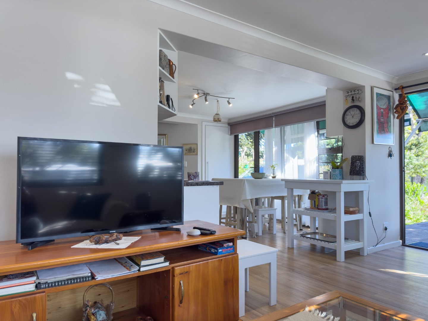 Open plan dining area with table and bar stools.