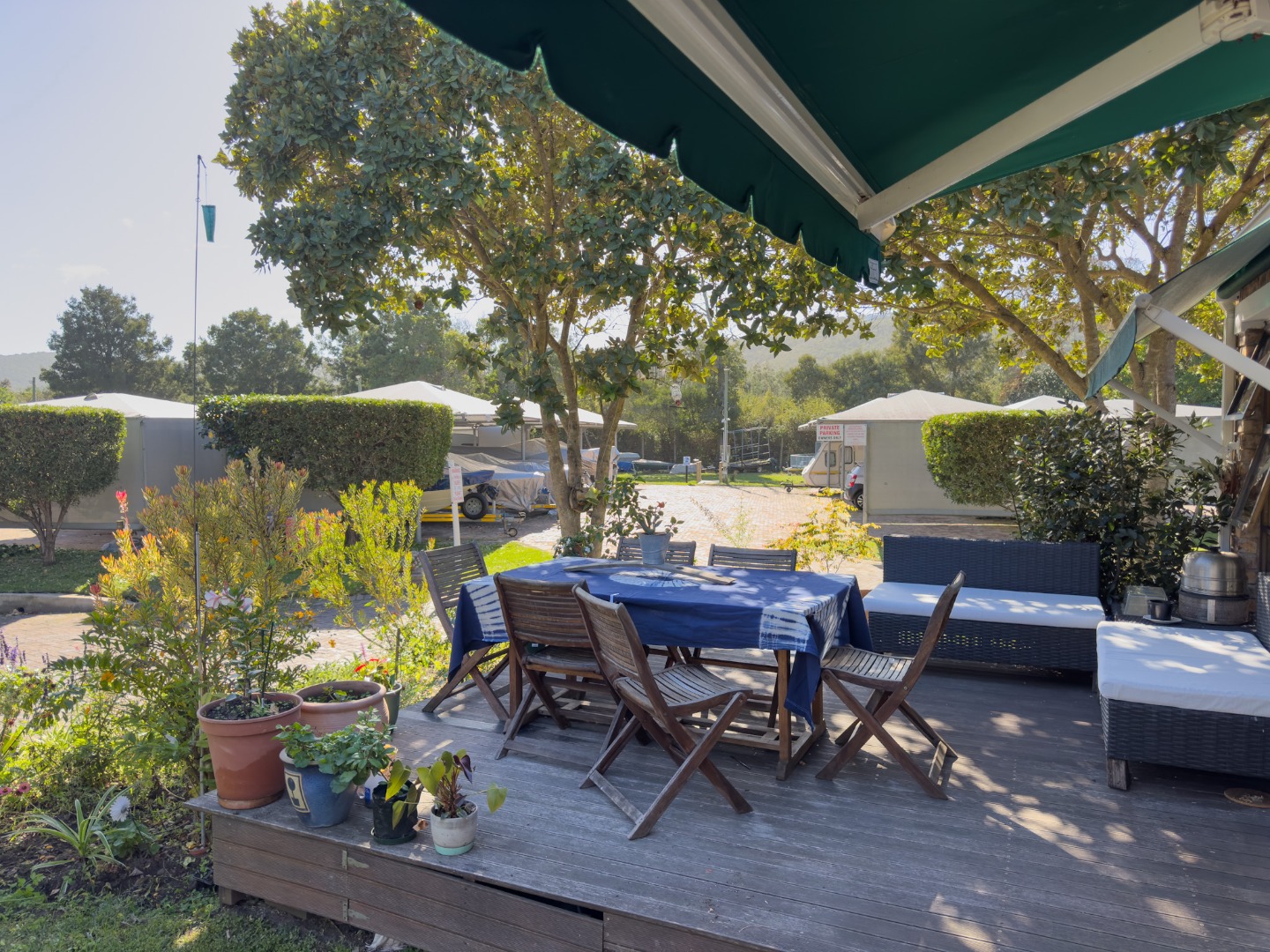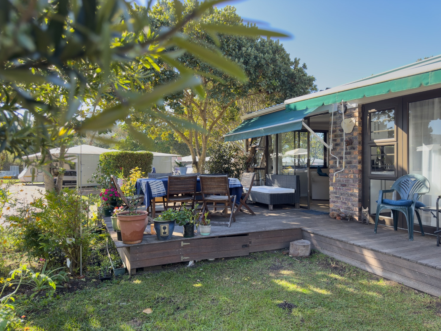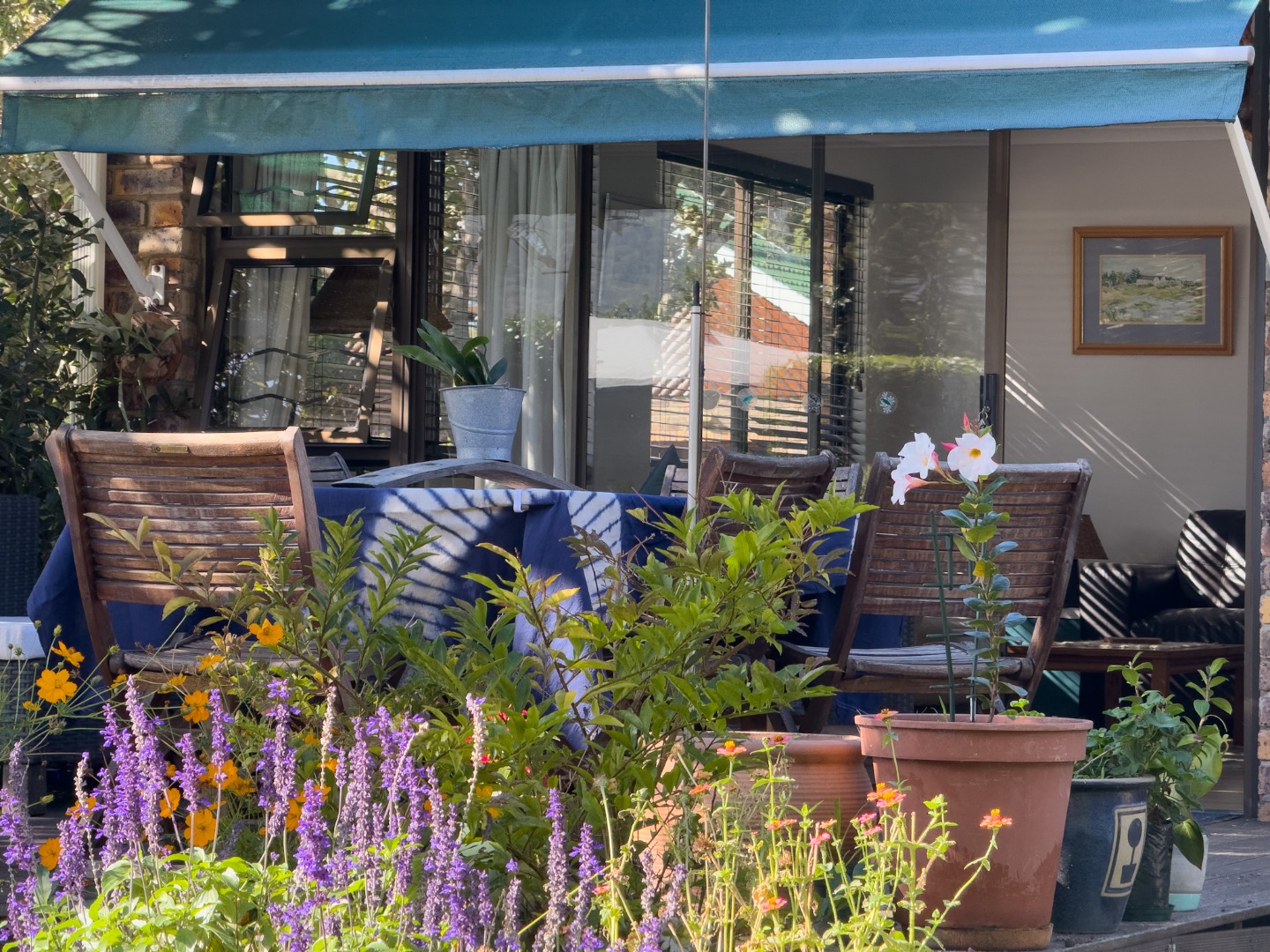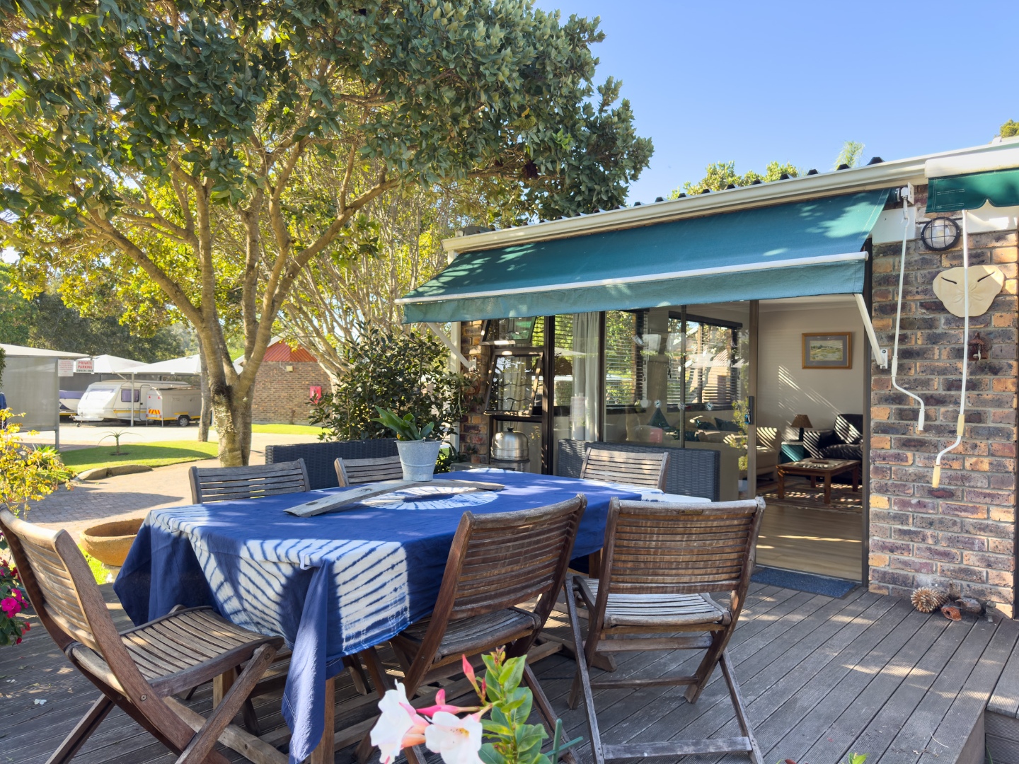 Lovely partially covered patio, overlooking the garden and towards the river. Patio furniture, table, and chairs with a portable braai.