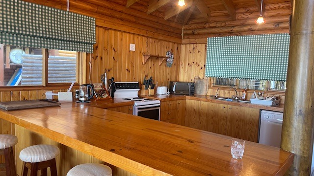 Open plan spacious kitchen, breakfast counter with bar stools, electric stove, double sink, microwave, dishwasher, fridge/freezer, kitchen is very well equipped.