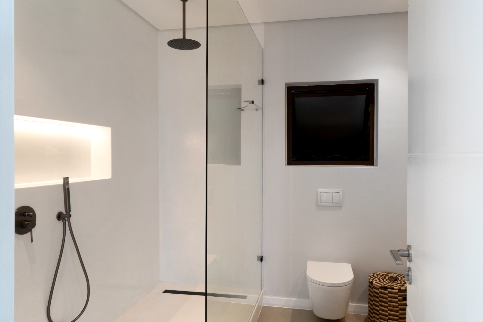 The main bedroom is fitted with a king-size extra-length bed and features an open en-suite bathroom with vanity, shower, bath, and a private toilet. Sliding doors open from the bedroom onto the outdoor patio, showcasing the spectacular views. This bedroom is equipped with air-conditioning and a ceiling fan.