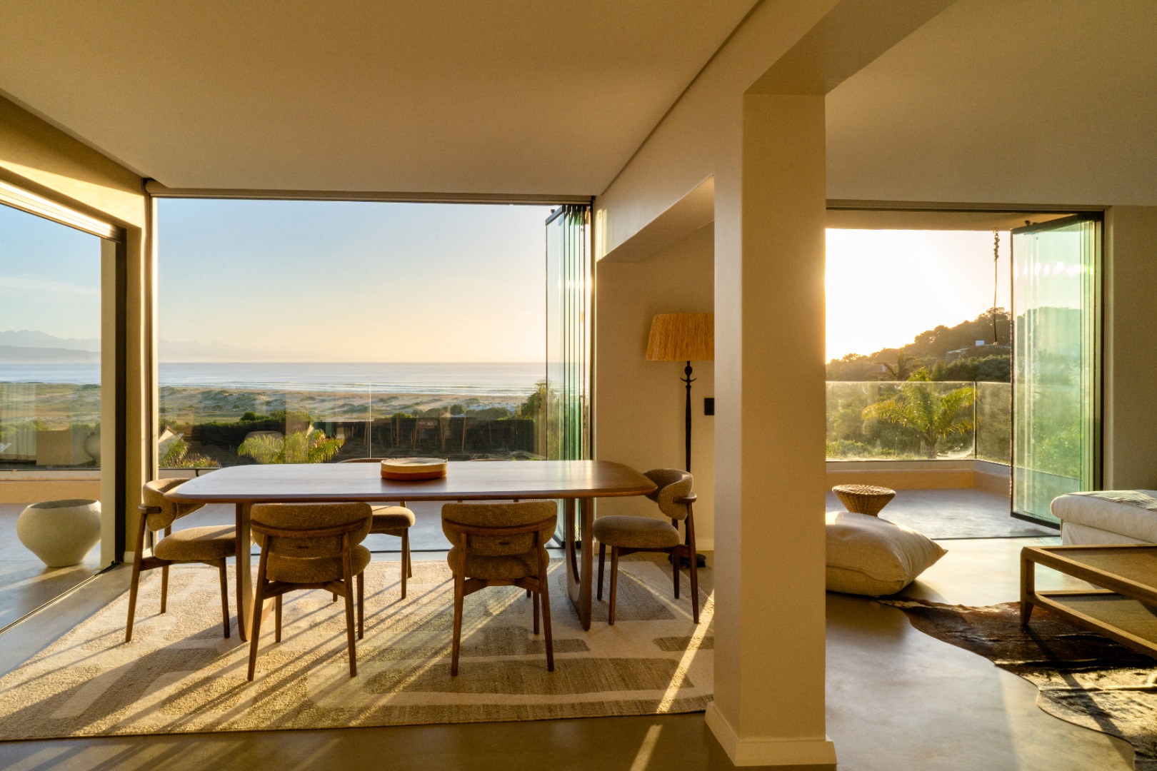 The dining area is furnished with a table and chairs seating eight, with glass stack doors opening to the entertainment area