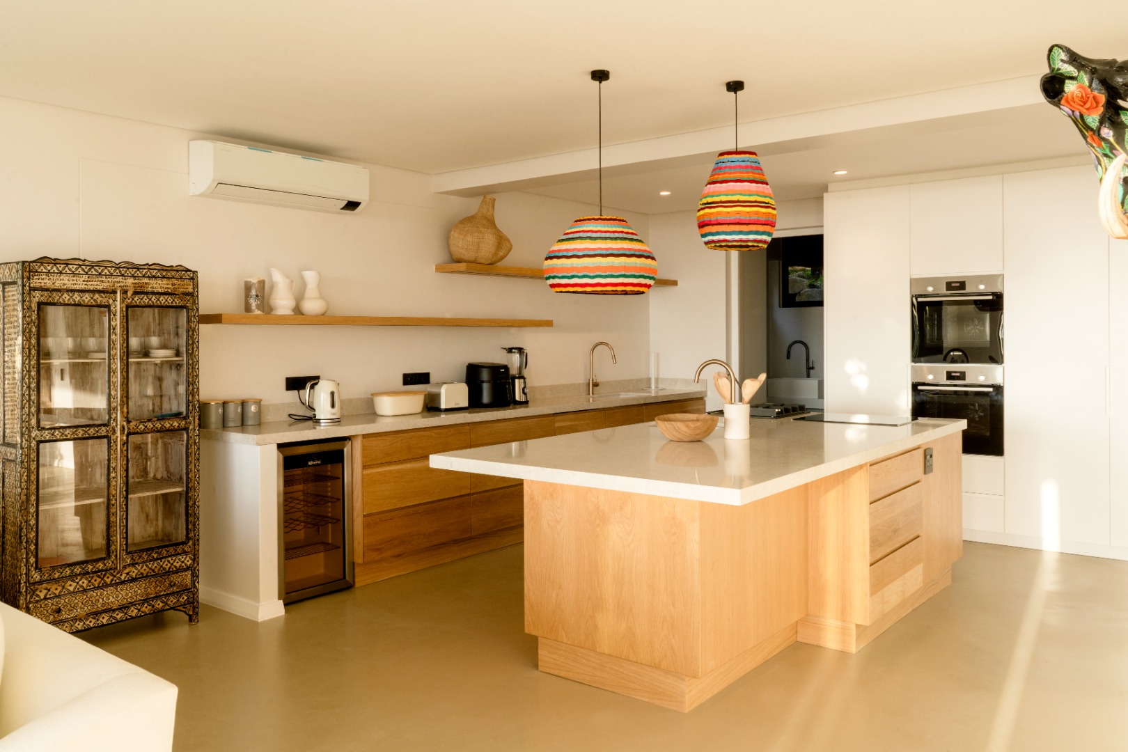 Kitchen A large open-plan gourmet kitchen with spectacular views, featuring a generous breakfast island with bar stools. The kitchen is equipped with a two-plate gas hob and electric hob, double eye-level oven, side-by-side fridge/freezer, air fryer, and two sinks (one prep bowl and one washing sink). A reverse osmosis water system is also installed.
