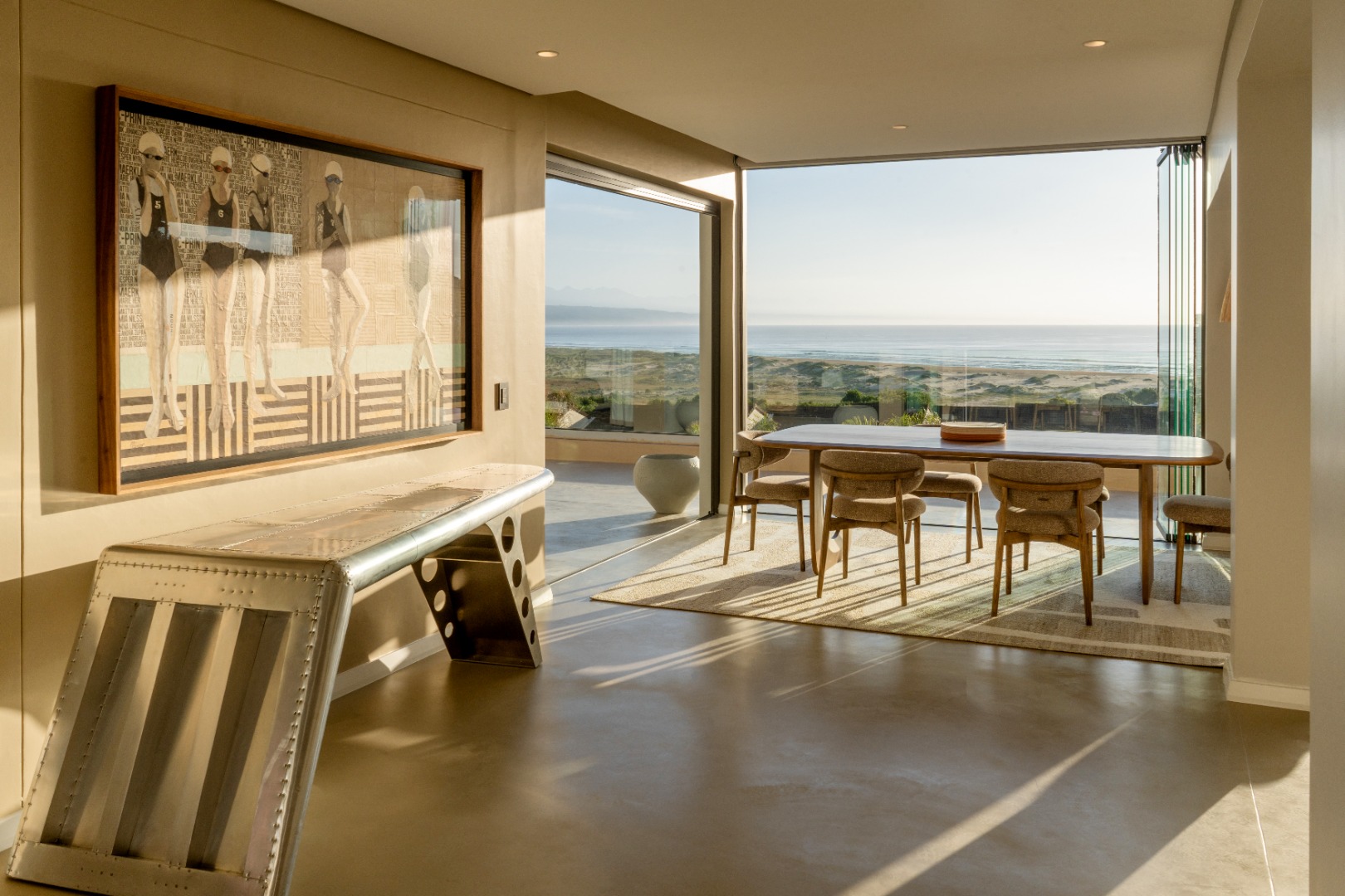The dining area is furnished with a table and chairs seating eight, with glass stack doors opening to the entertainment area