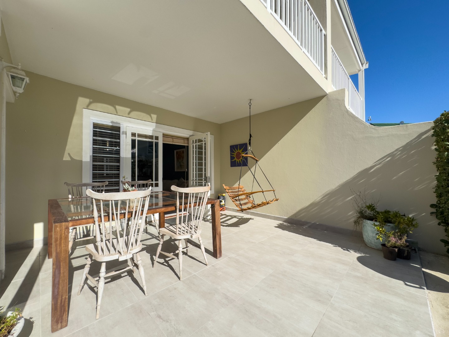 Lovely, covered front patio with furniture, weber braai, private garden.