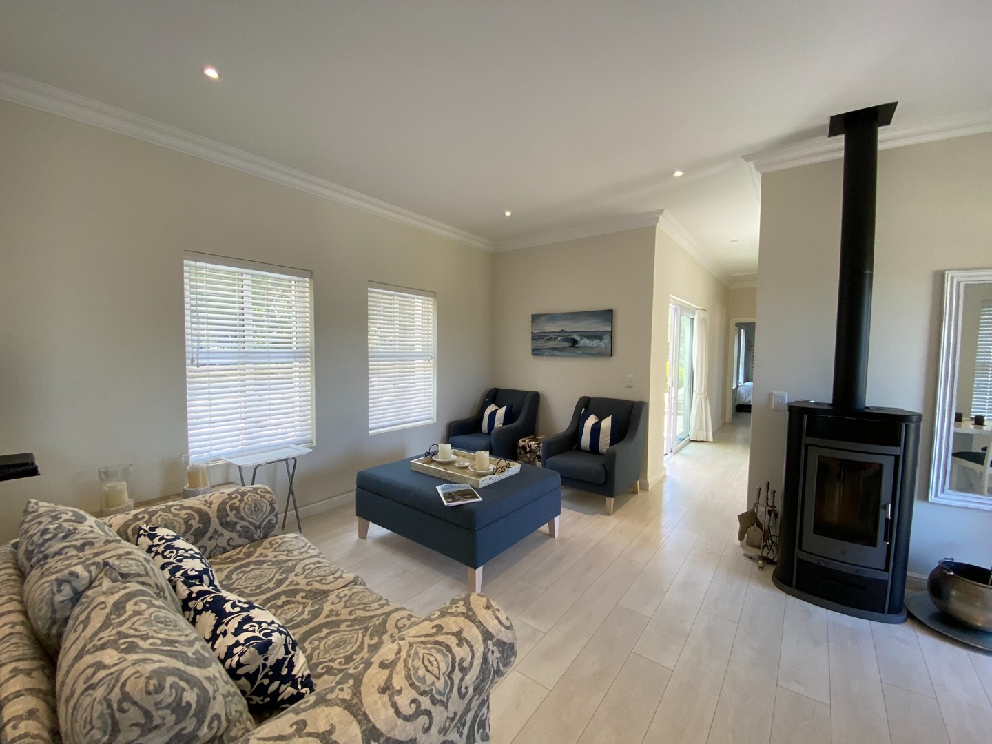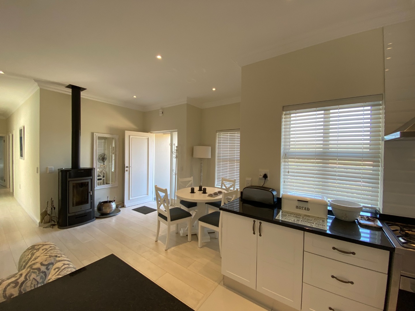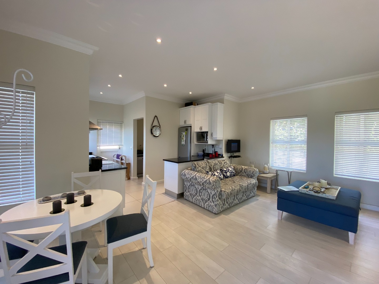 The Home has an open plan Living Area with Lounge with full DSTV, Dining Area seating 4, Kitchen and Scullery Area.
