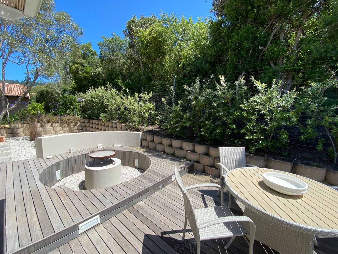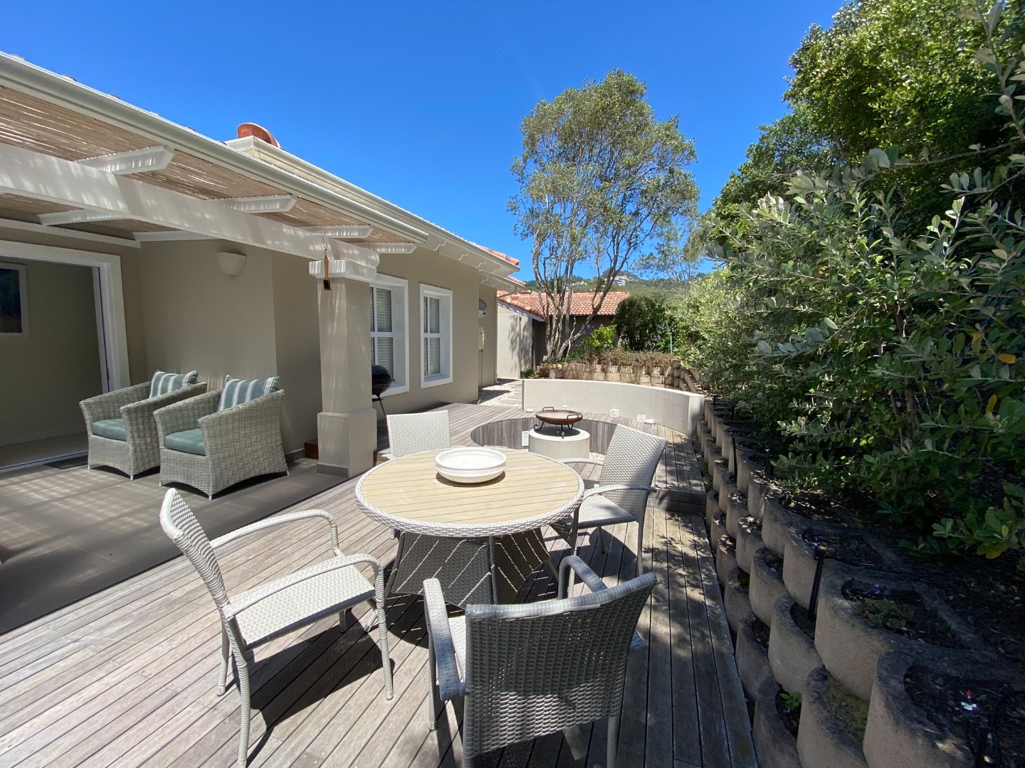 * Lovely covered private back Patio with furniture, Weber Braai and Fire Boma with built-in seating.