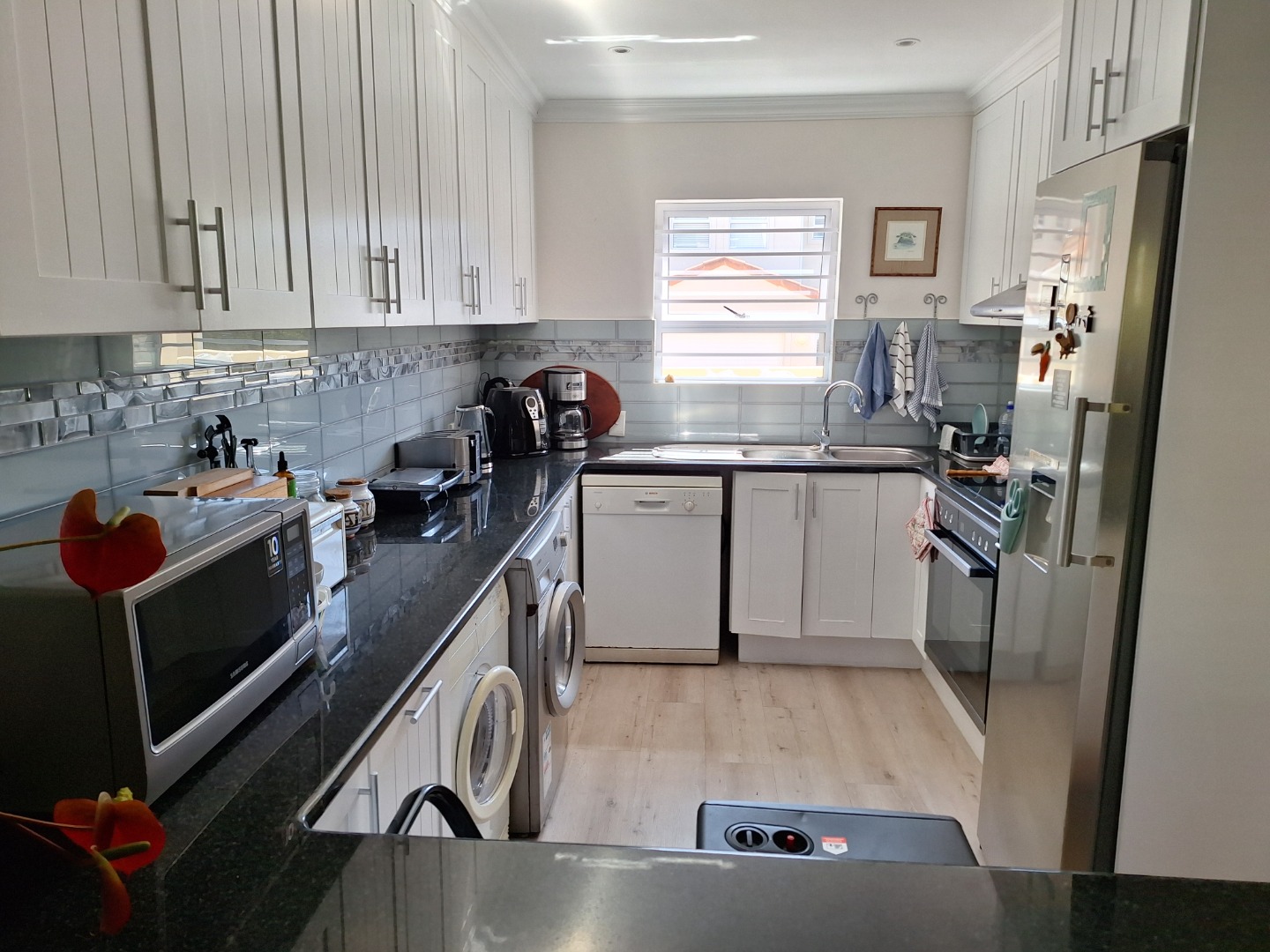 Fridge (in the kitchen) and chest freezer (in the garage) washing machine, tumble dryer and dishwasher, electric oven, air fryer, coffee machine, microwave, double toaster.