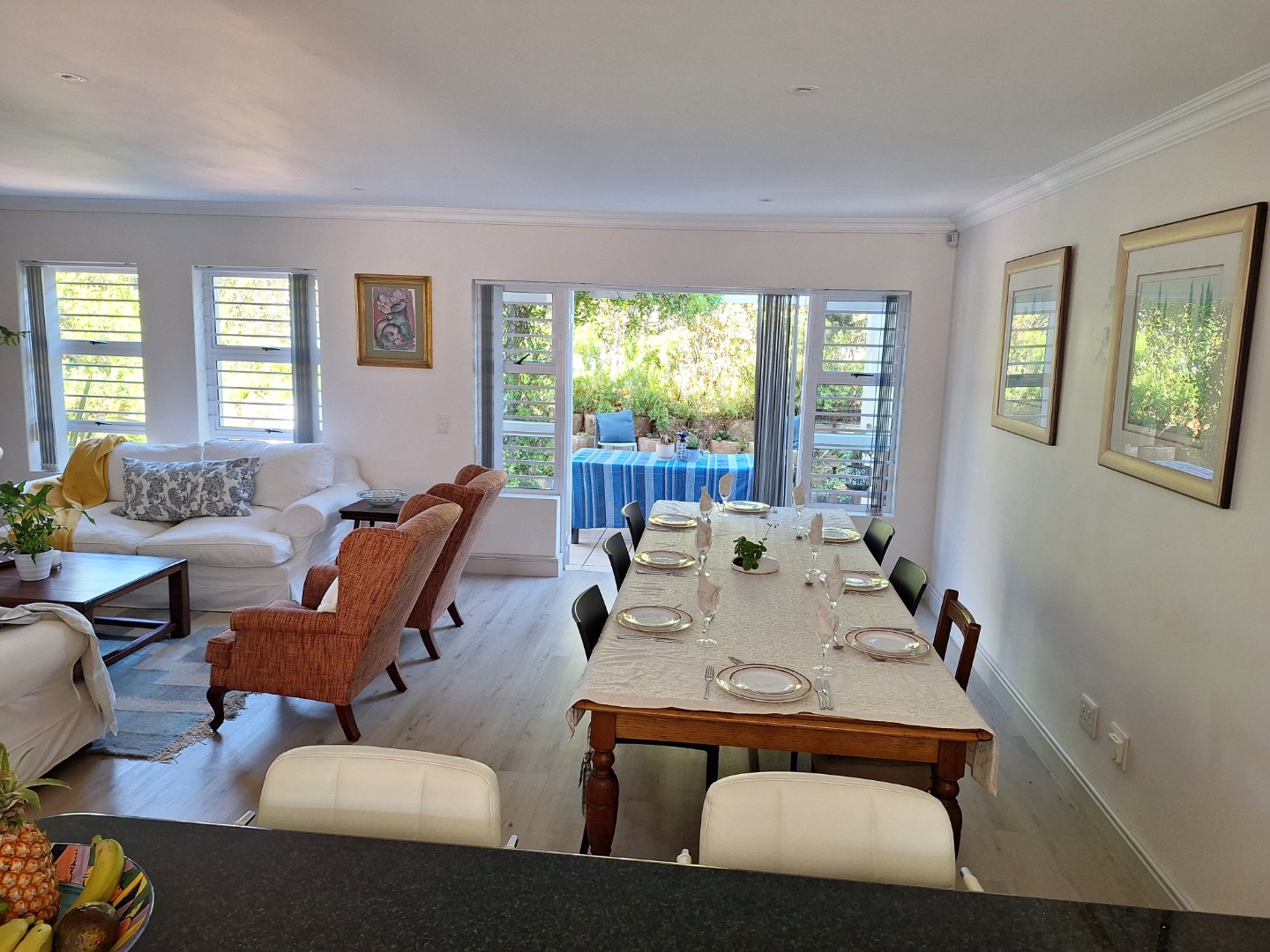 The lounge and dining area flow onto a spacious open patio, perfect for outdoor relaxation