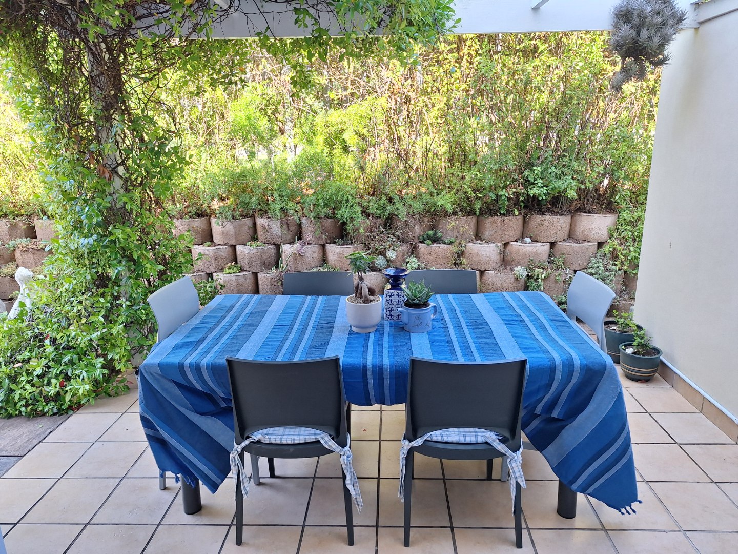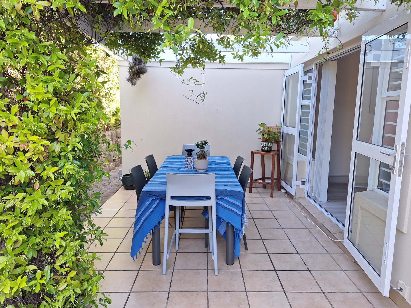 Spacious patio with a pergola, braai facility, patio table and chairs to enjoy outdoor dining.