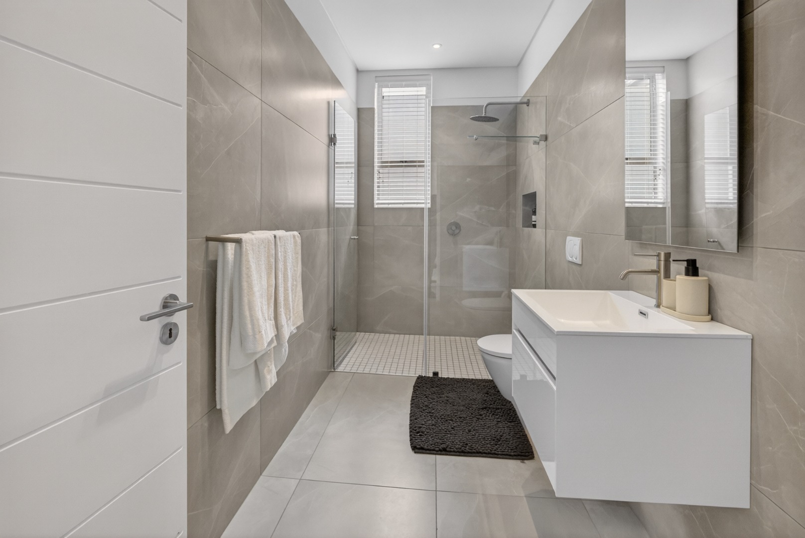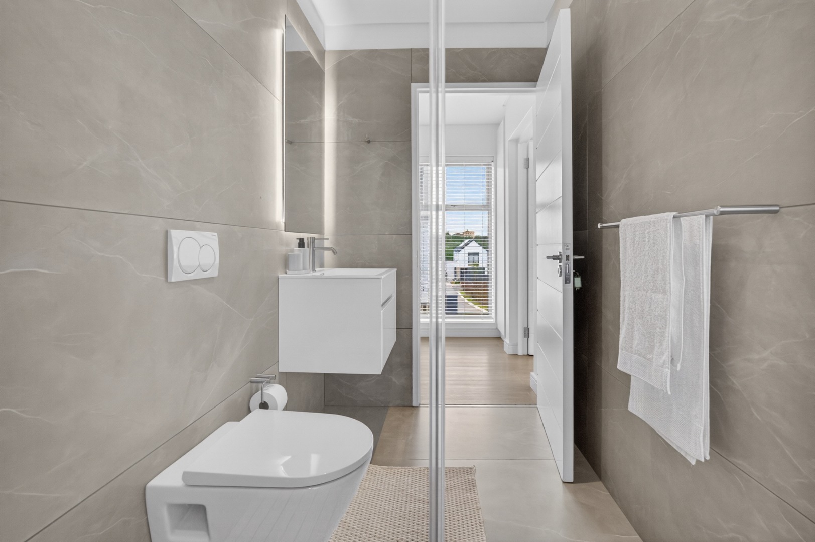 Separate private bathroom with shower, toilet and basin.