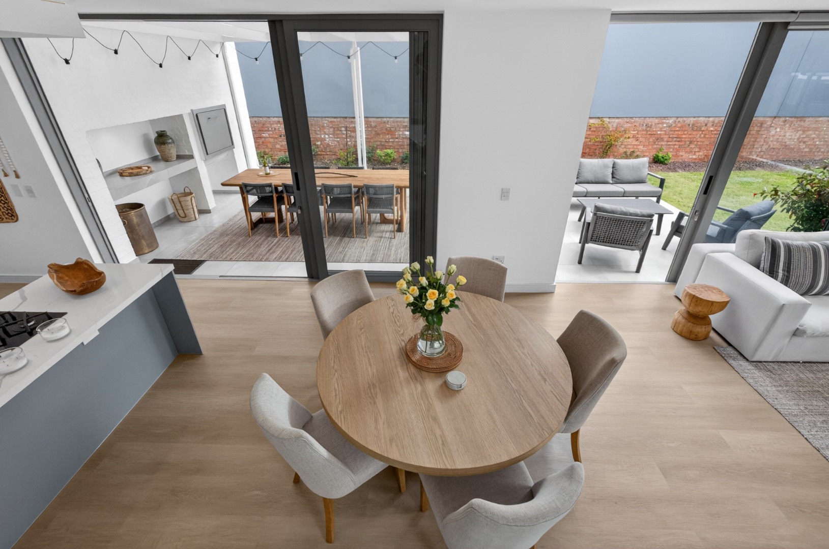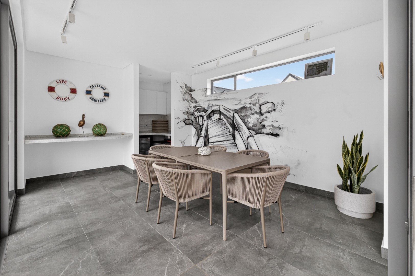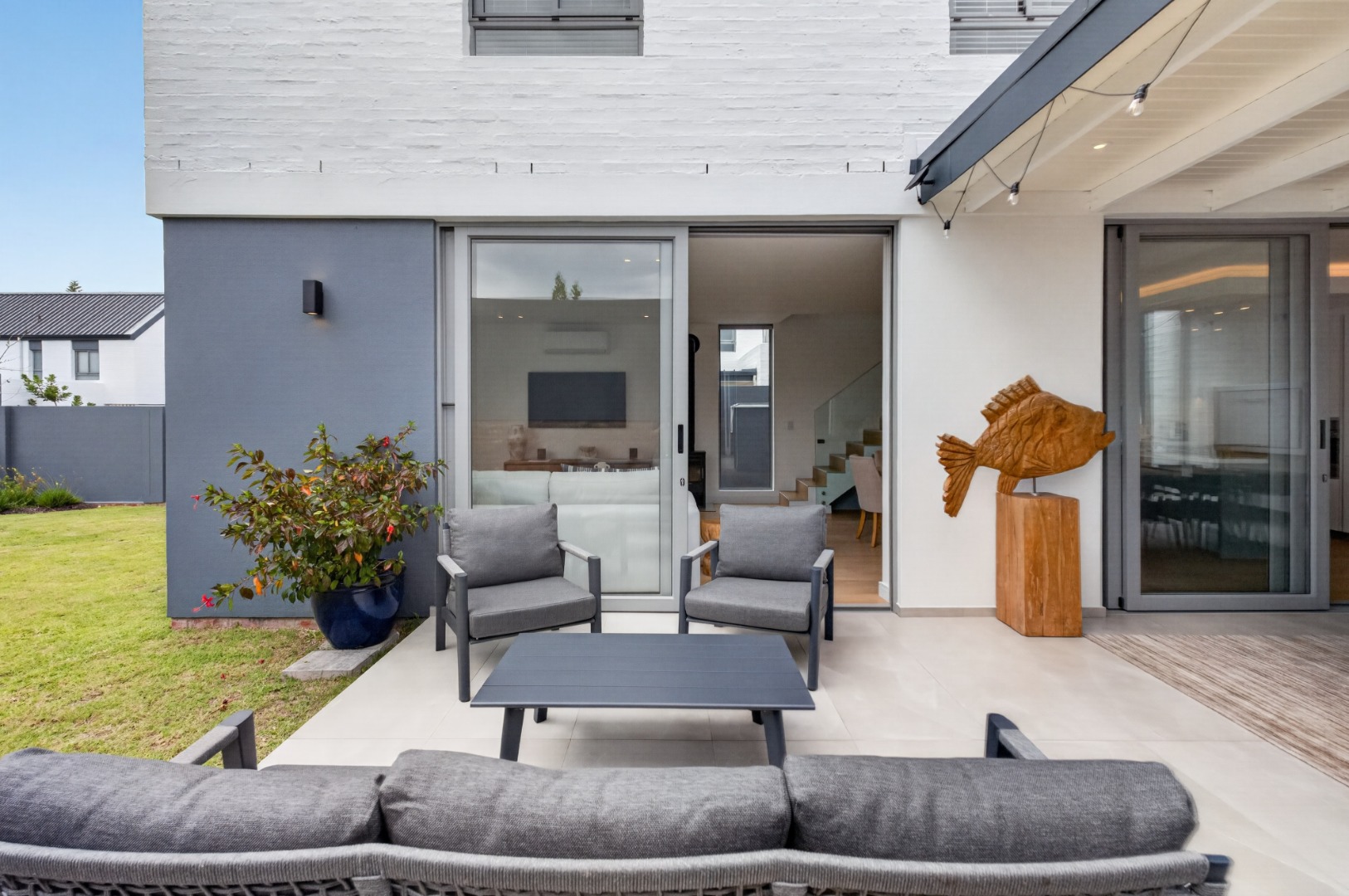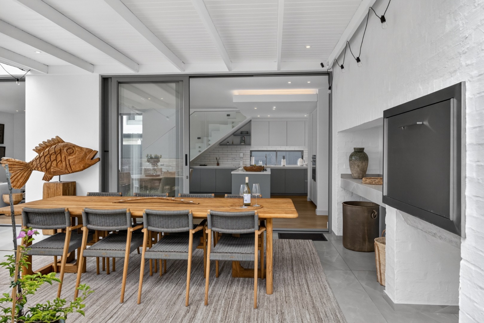 Spacious, covered patio, creating a seamless indoor/outdoor flow and includes a built-in braai, large table and chairs and lounge furniture for outdoor dining and relaxation.