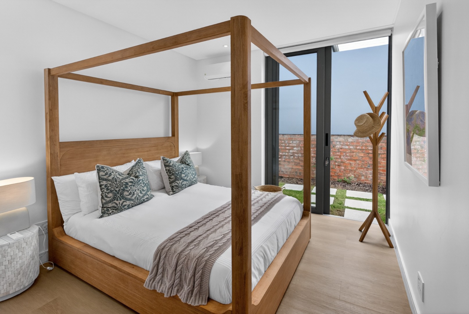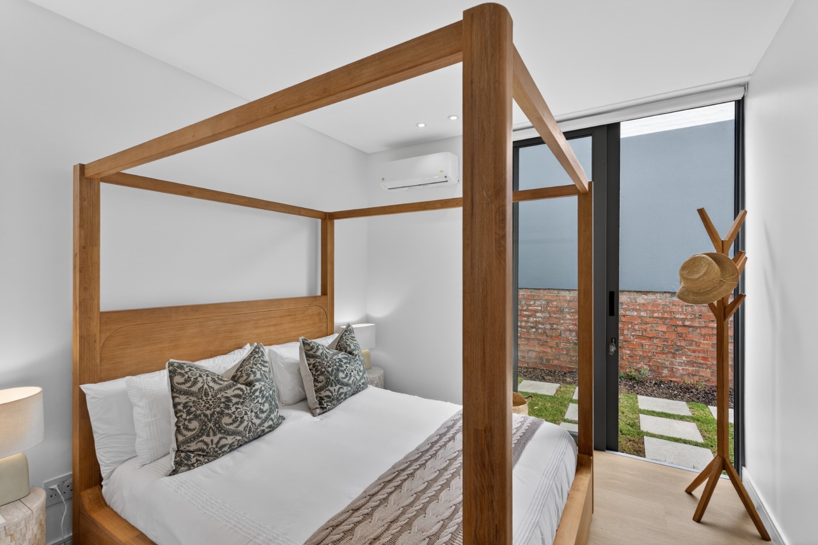 1 x luxury furnished bedroom a Queen bed, sliding doors open the garden, air conditioner.