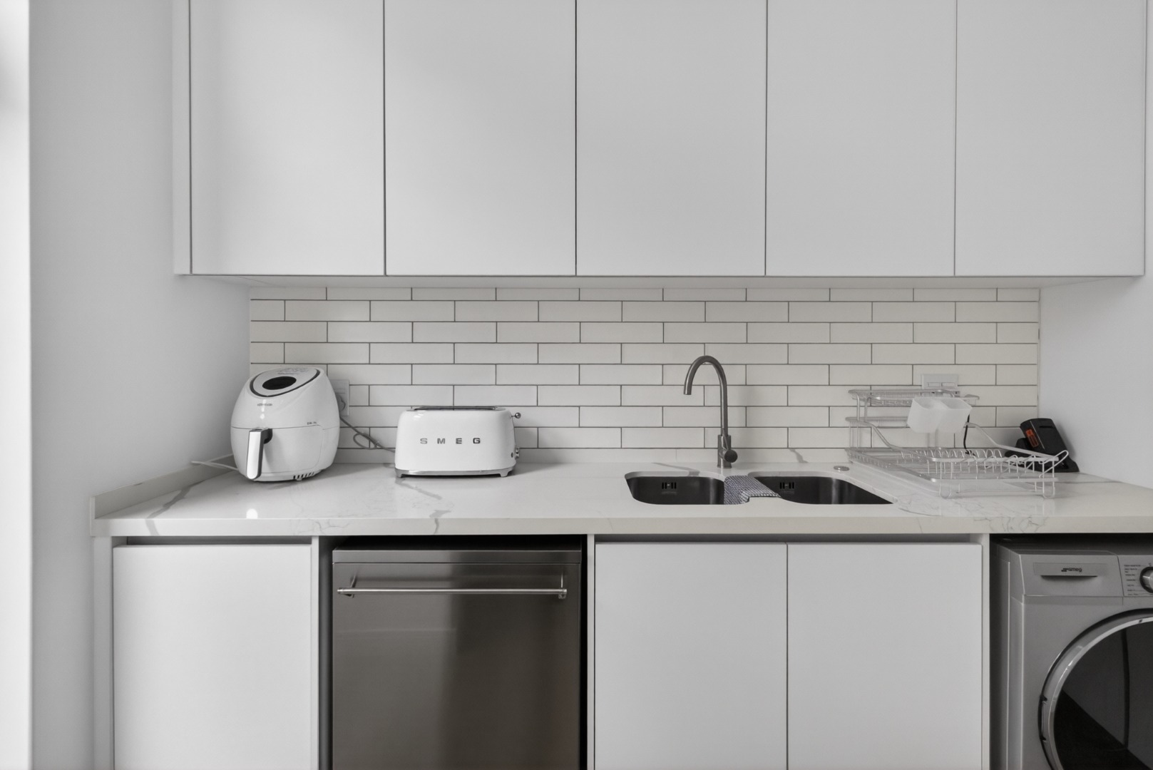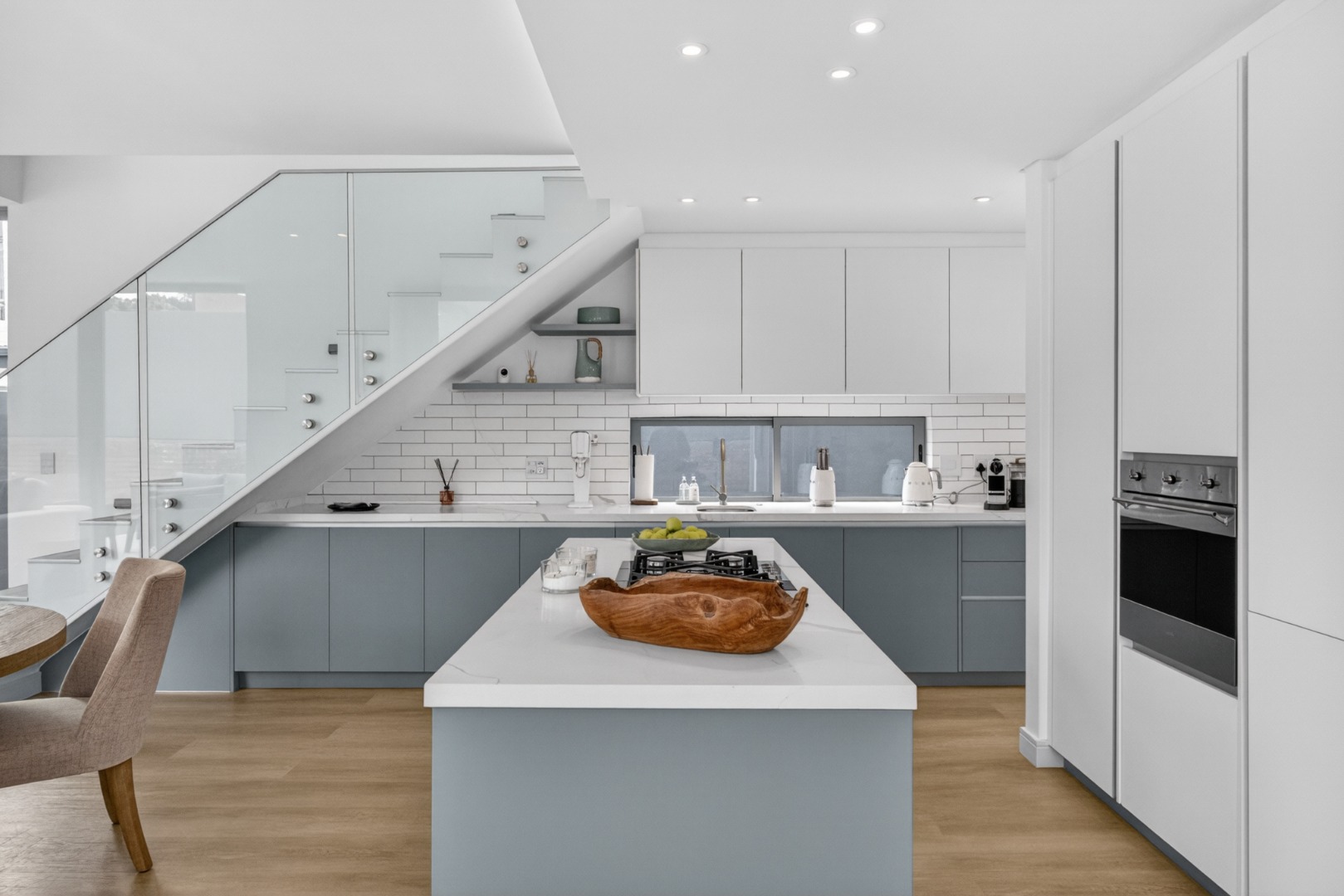 Open plan light and airy very well-equipped modern kitchen with all the mod cons, large kitchen island, 5 plate gas hob, under counter electric oven, built in fridge/freezer, air fryer, all Smeg appliances, prep bowl, scullery with dishwasher, washing machine, microwave, double sink.