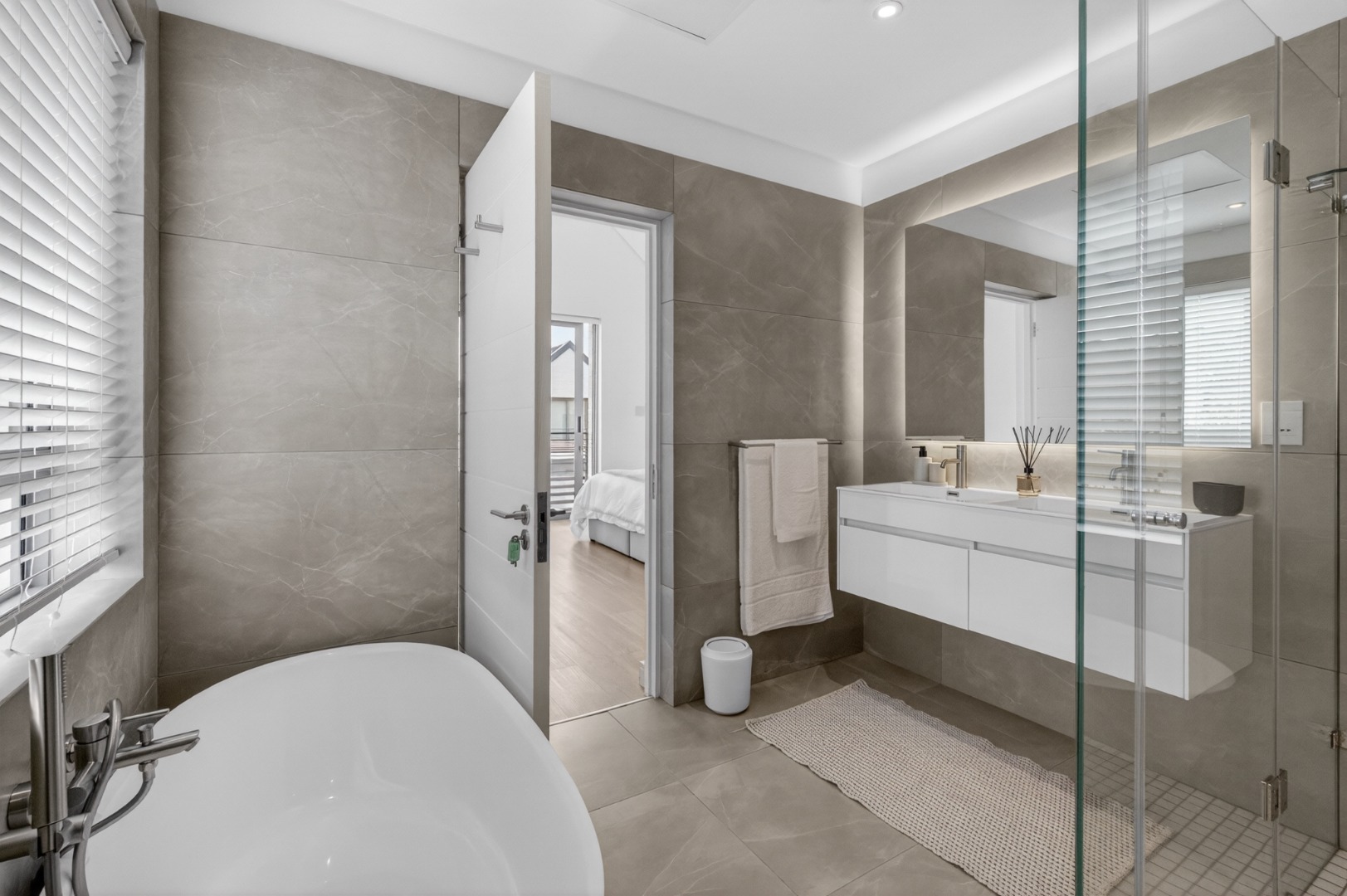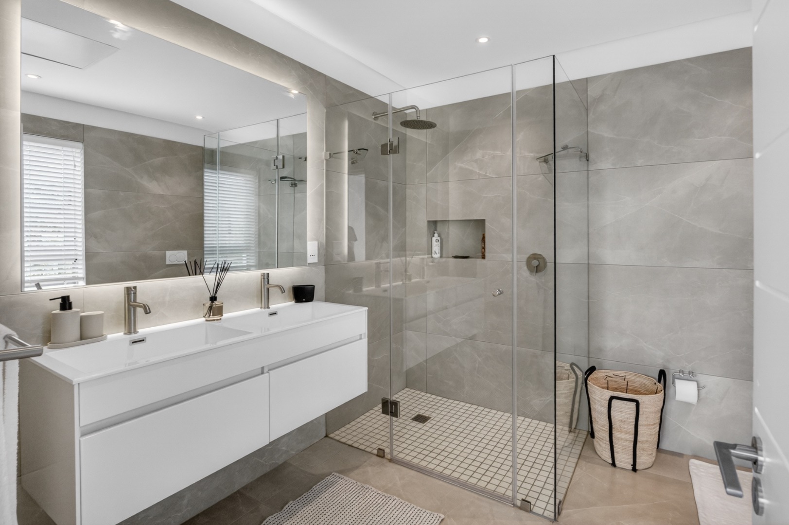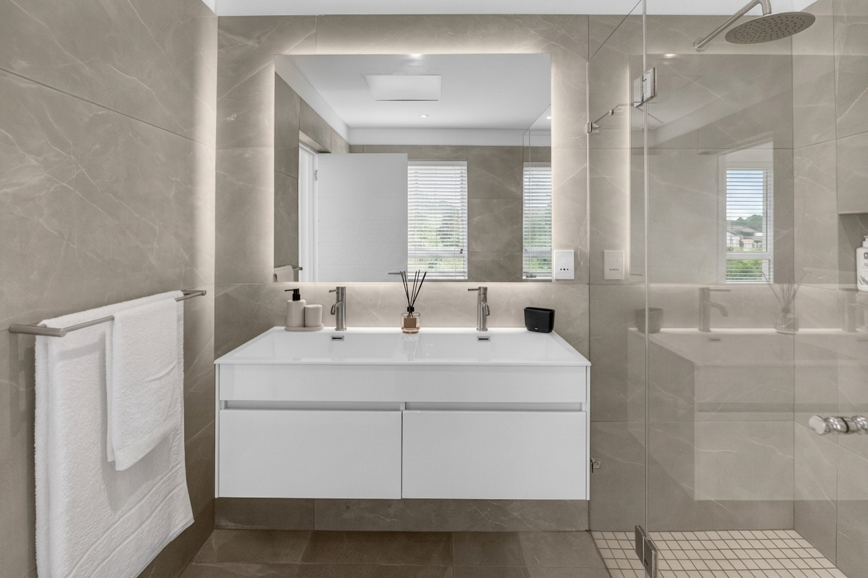En-suite bathroom with double vanity, shower, toilet, basin and bath.