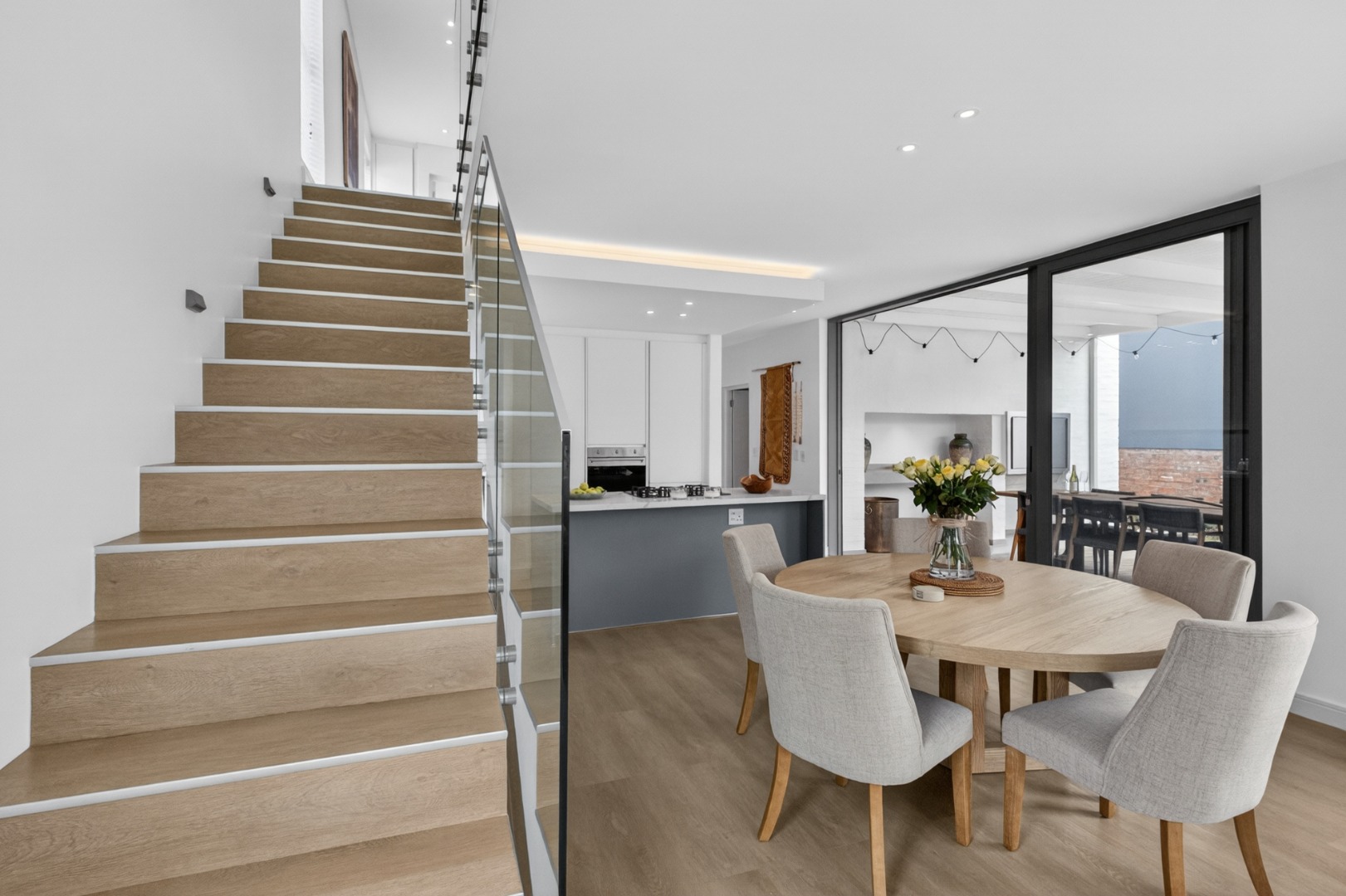 Spacious, open plan, lovely furnished, bright and airy, dining room seating 5 people with doors that open onto the enclosed patio/entertainment area.