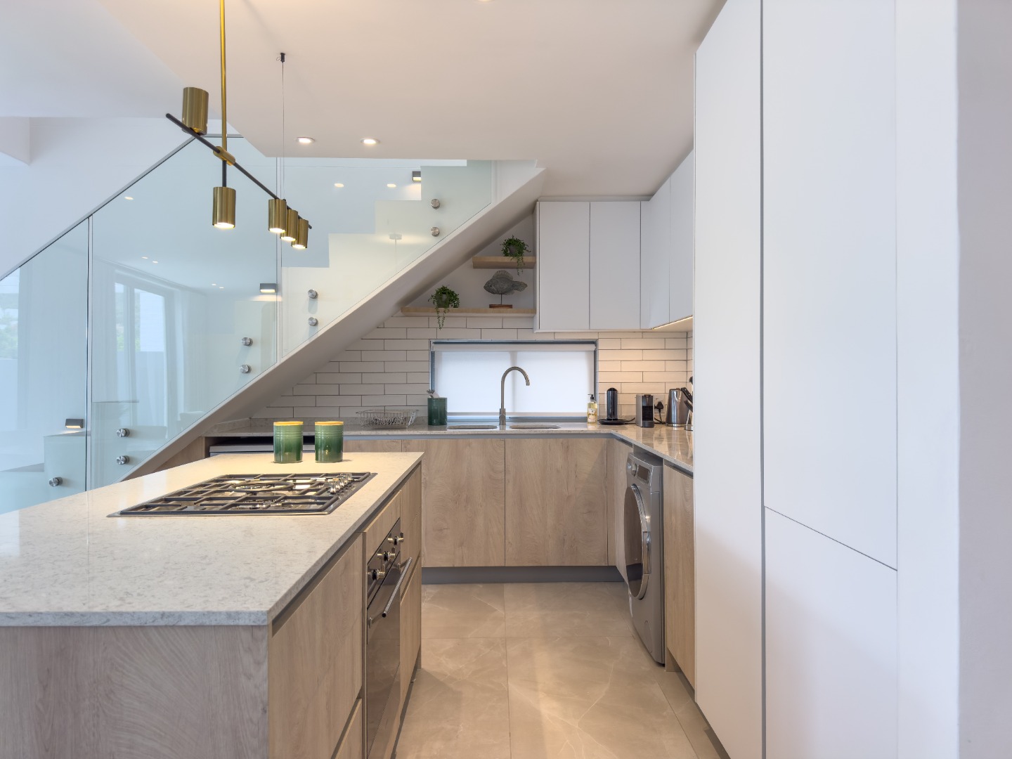Open plan light and airy very well-equipped modern kitchen with all the mod con, large kitchen counter with 4 bar stools, 5 plate gas hob, under counter electric oven, built in fridge/freezer, dishwasher, washing machine combined dryer, Nespresso machine, air fryer, microwave, double sink.