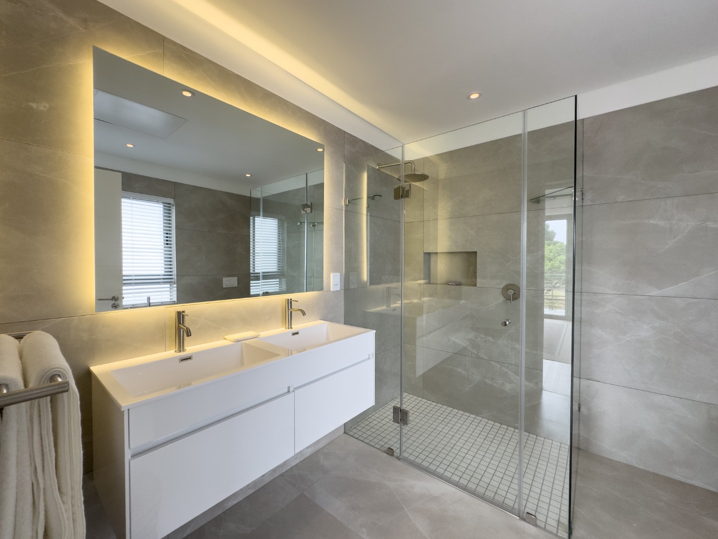 En-suite bathroom with double vanity, shower, toilet, basin and bath.