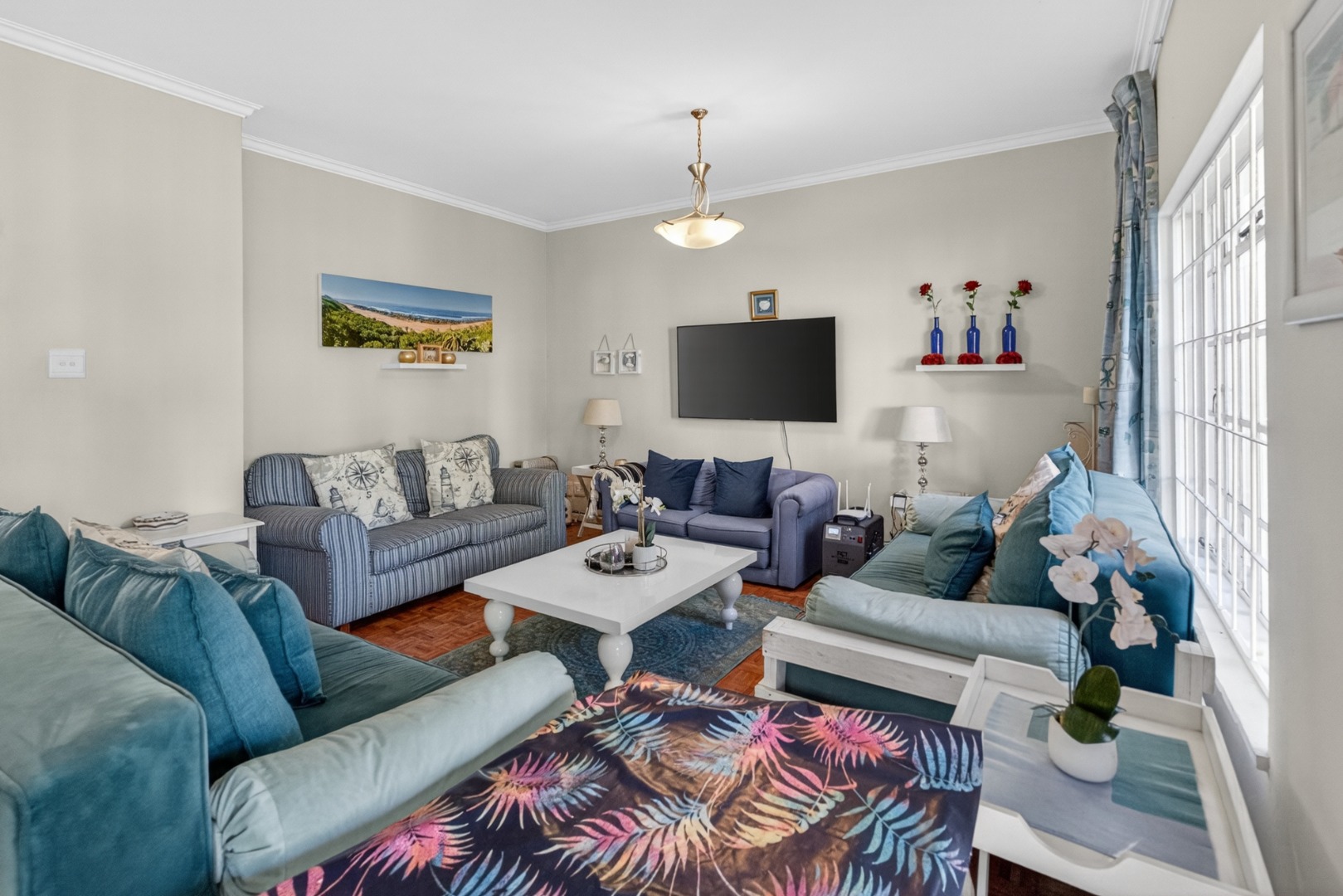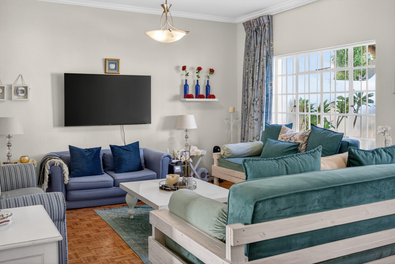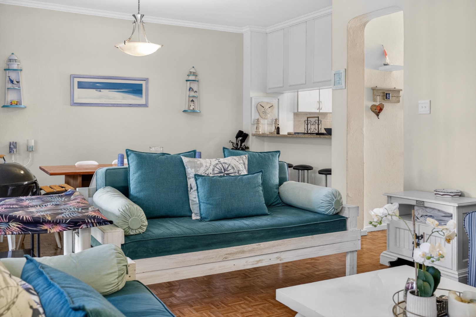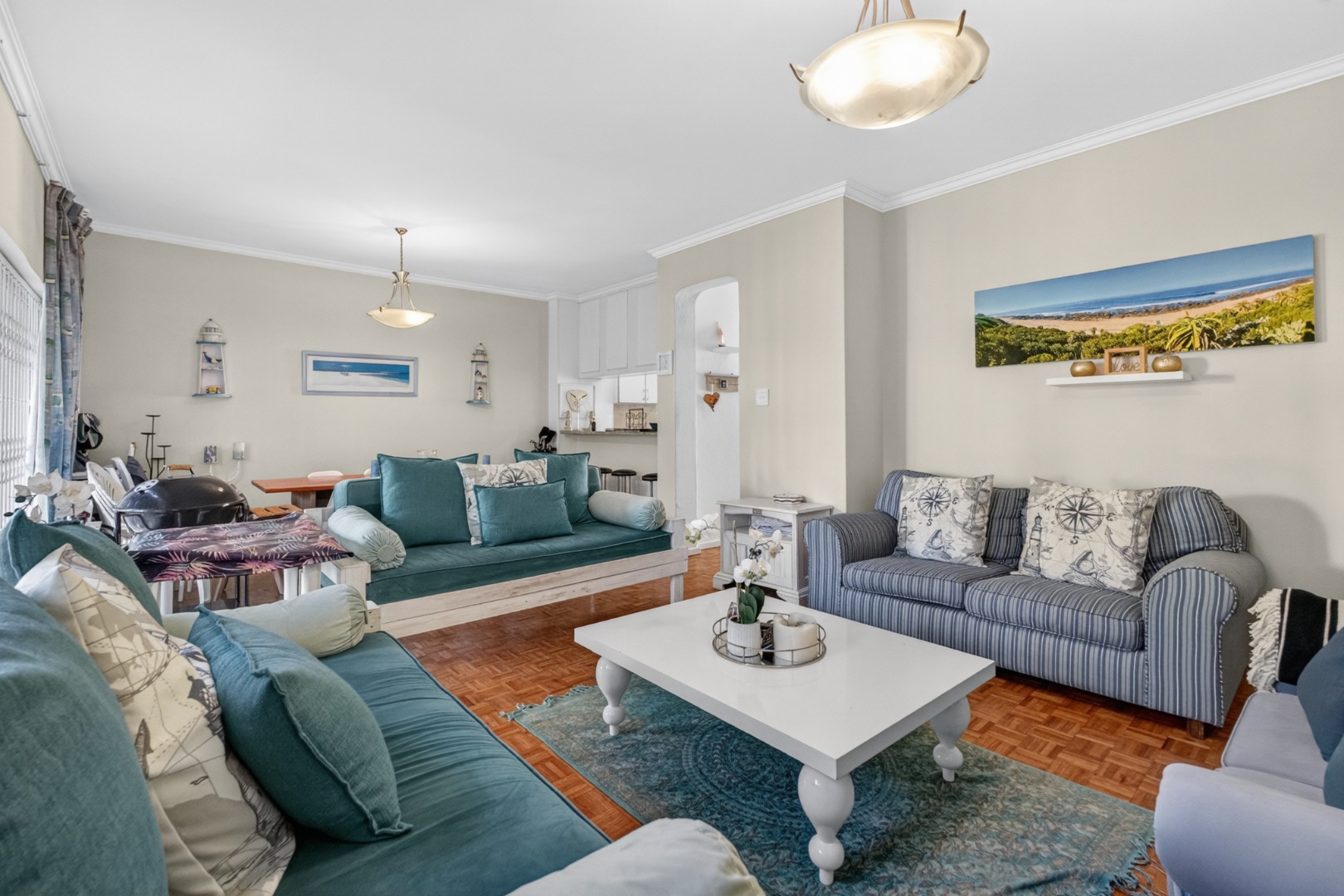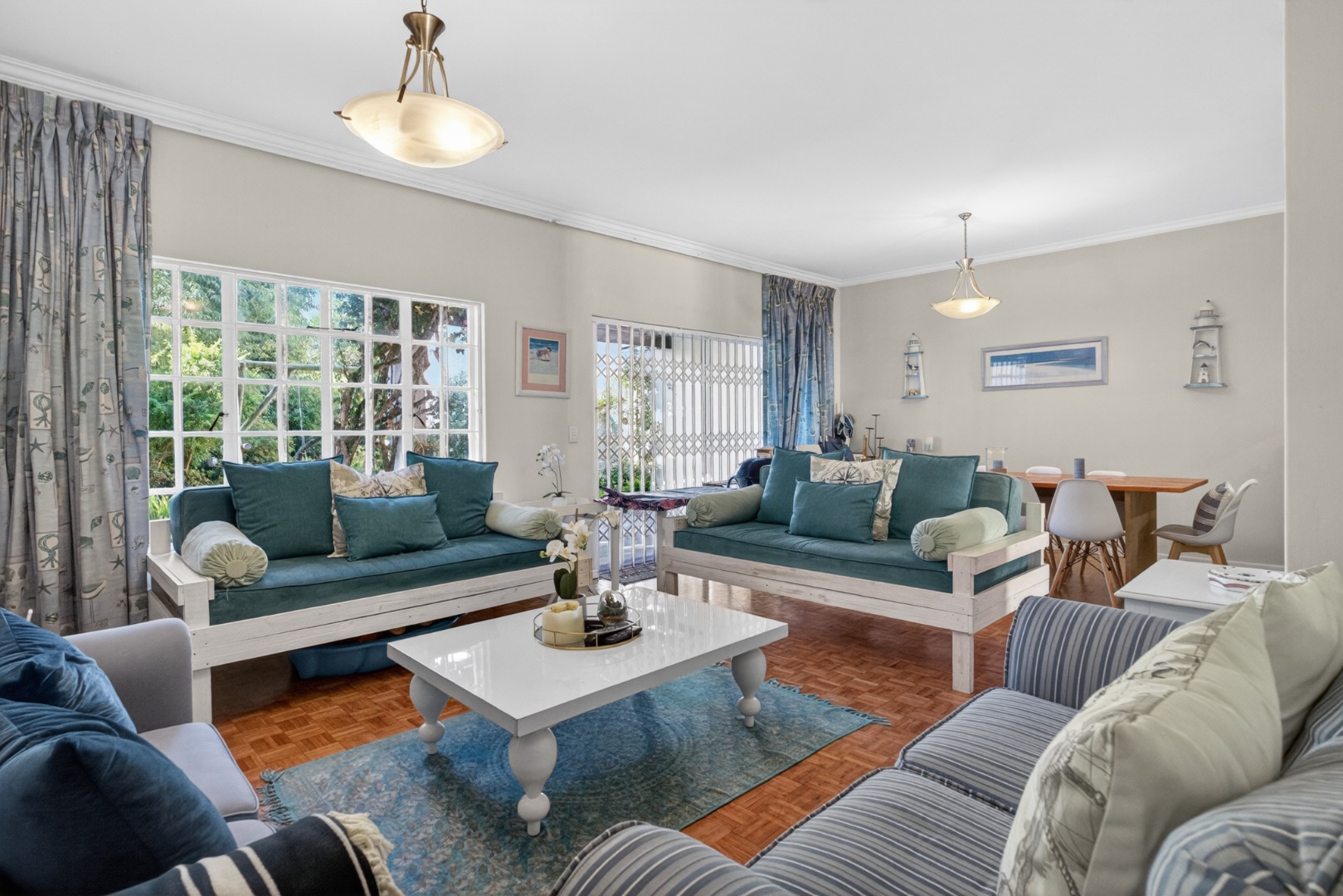 Well-furnished lounge with 2 x-day beds and 2 sofas, TV (tenant to provide their own DSTV), doors open to the patio.