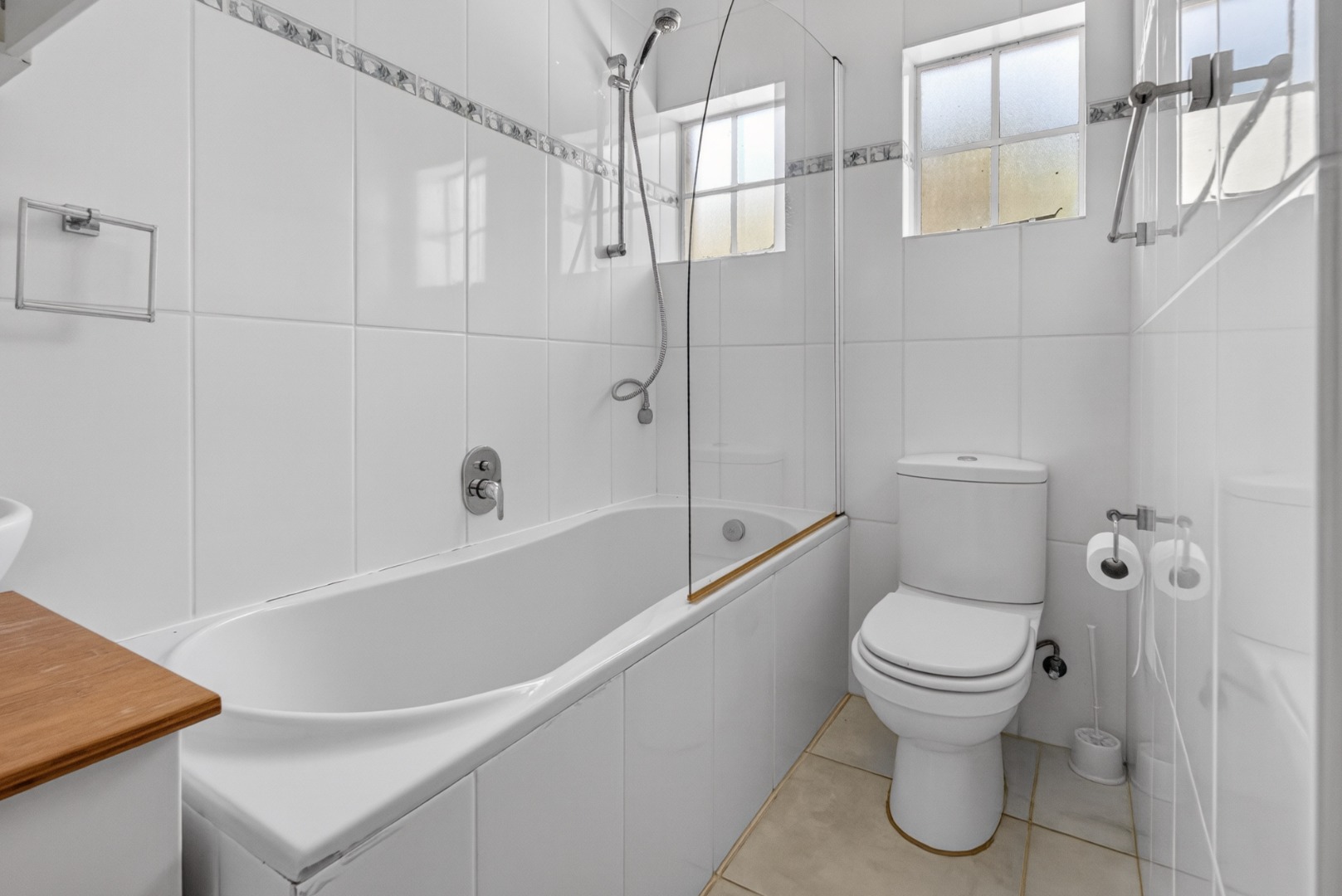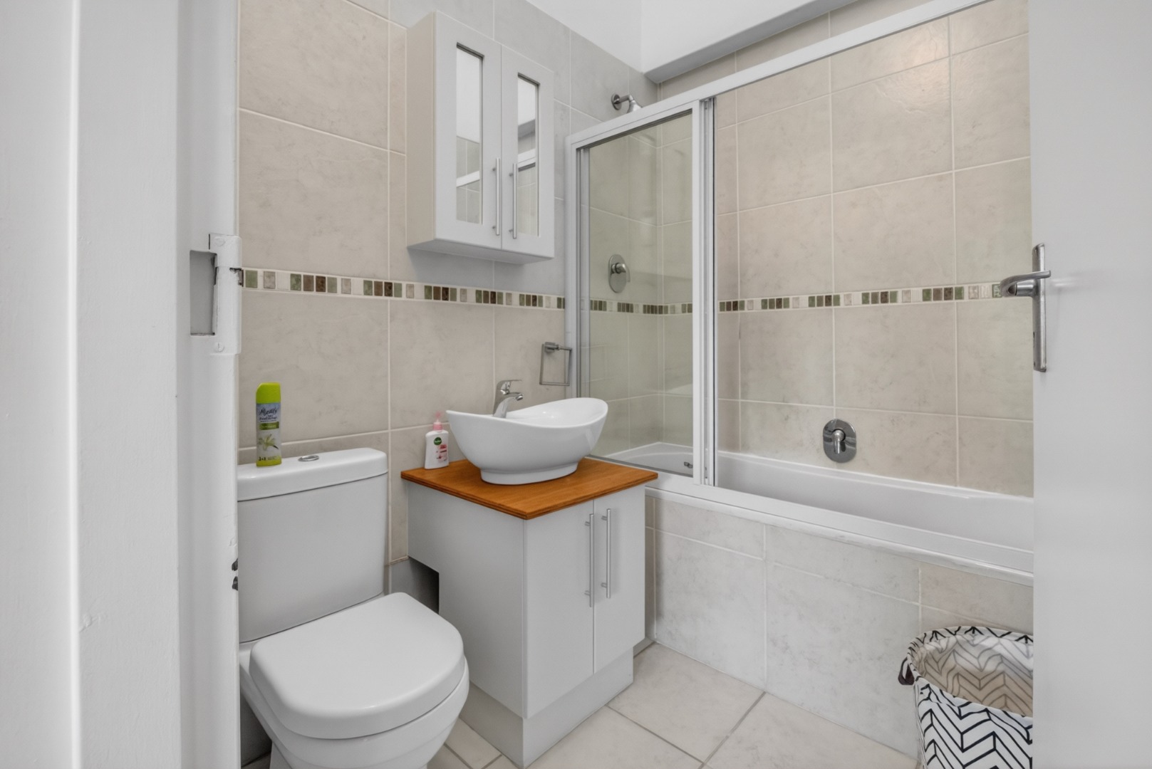 1 x separate bathroom with bath (shower over bath), toilet and basin.