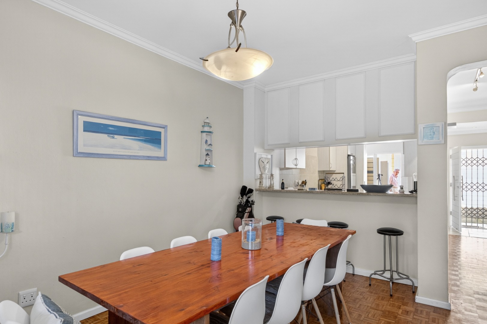 Open plan dining area with a 10-seater dining table and chairs.