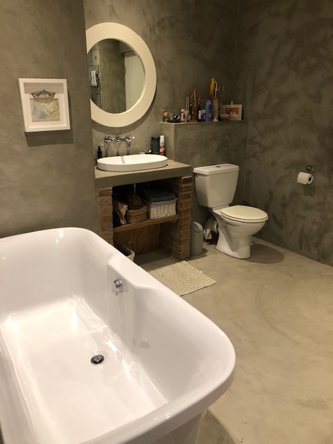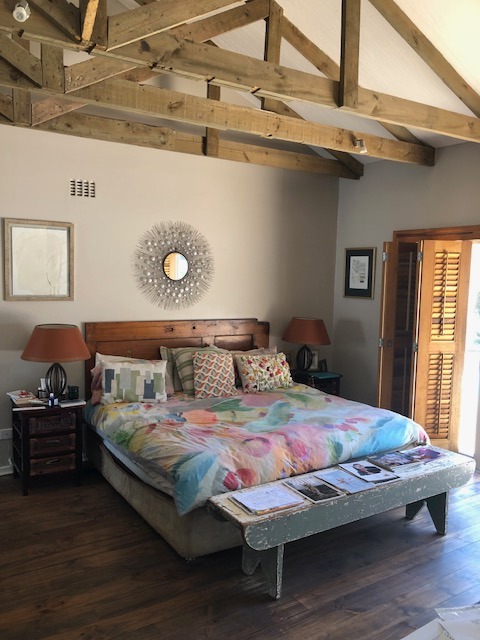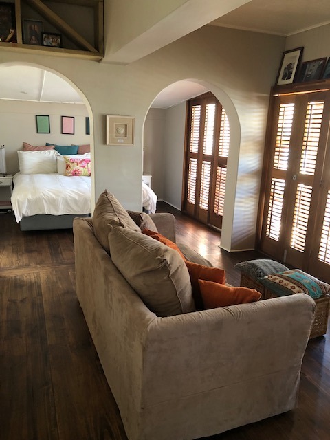 1 x bedroom with a private lounge and doors open to the patio, King size bed, with spacious en-suite bathroom, shower, toilet, and basin. (the ceiling in the bedroom is quite low)
