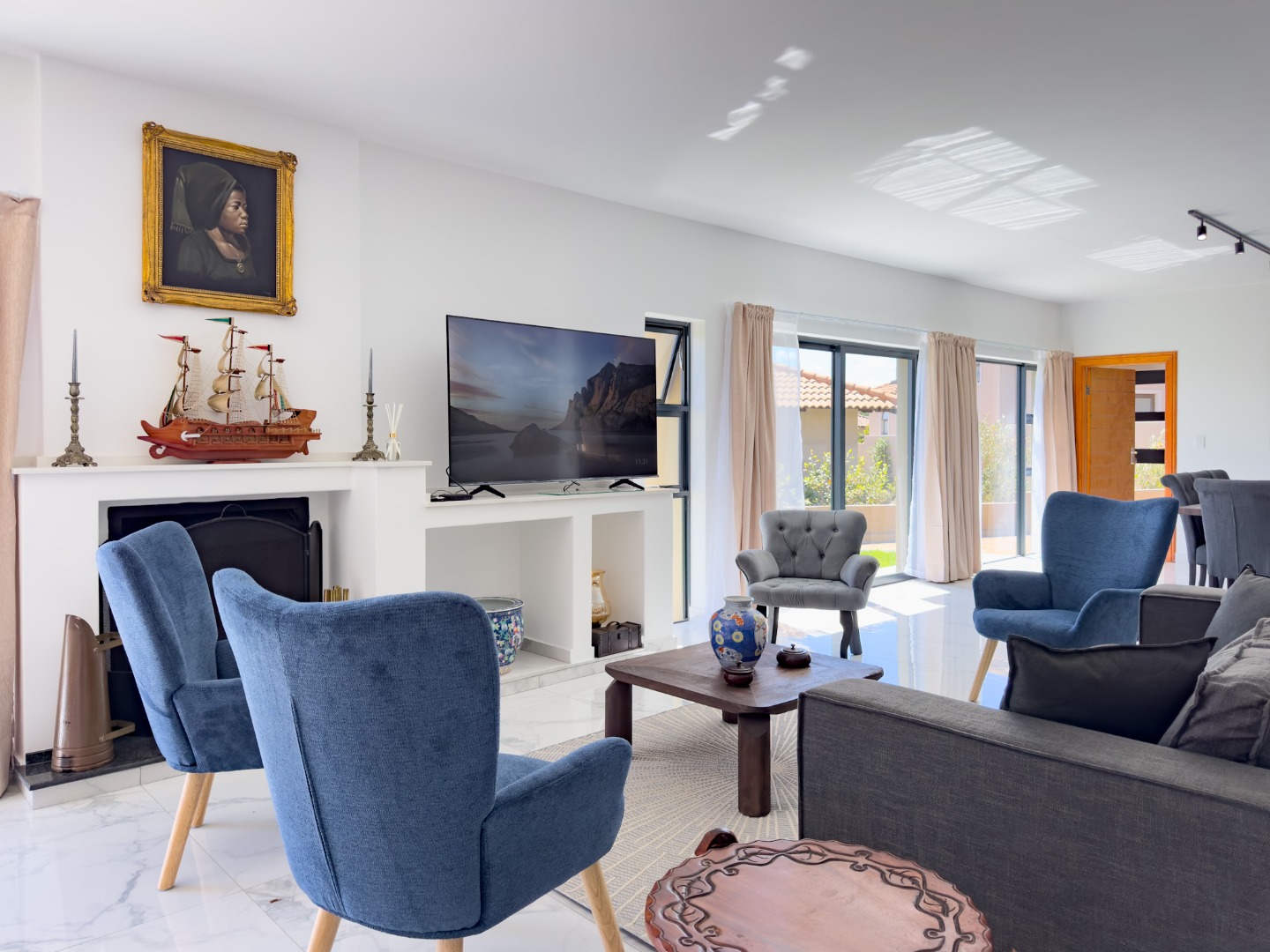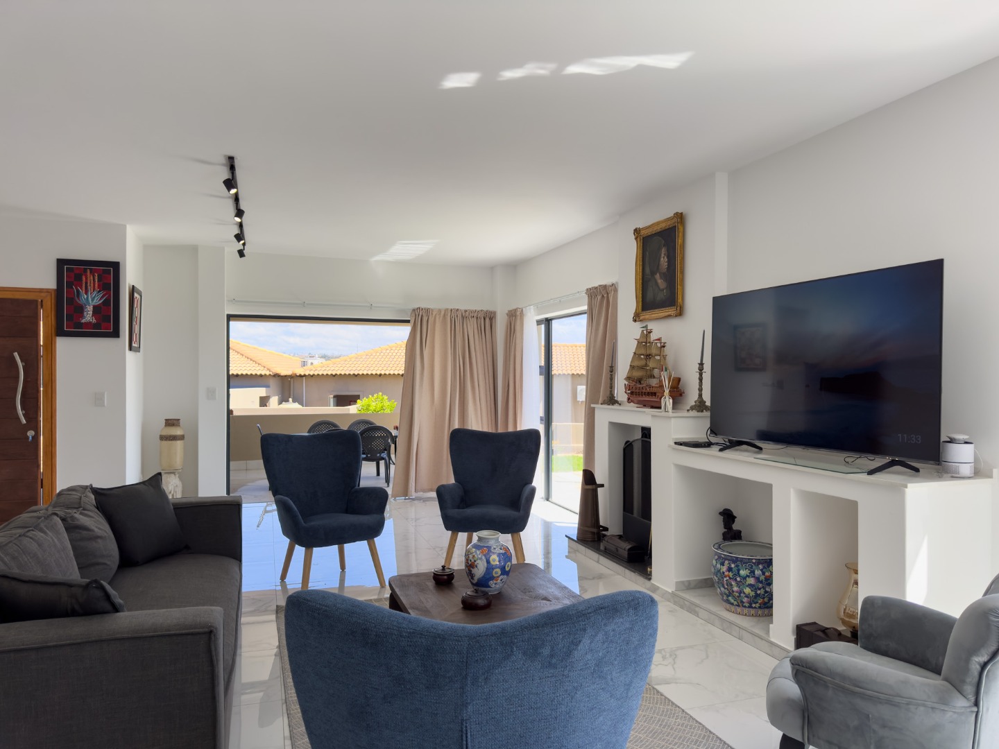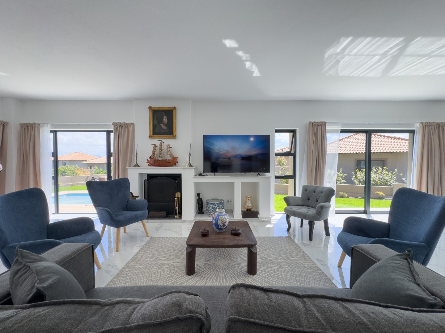 Spacious open plan lounge with Smart TV, (guests can stream their own viewing channels. Lovely comfy sofas, fireplace, doors open to the patio and pool area.