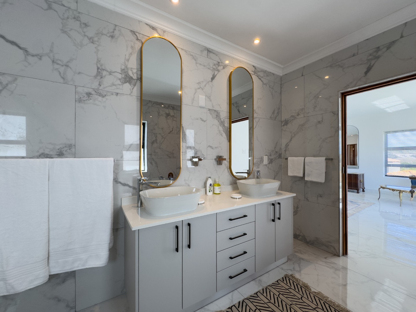 1 x Main spacious bedroom with King size bed, lovely mountain views, dressing room, en-suite bathroom with double vanity, bath, shower, toilet and basin.