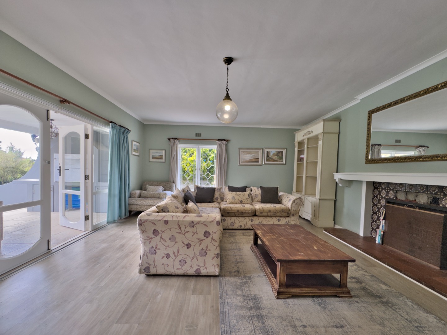 Step down into a spacious family lounge with comfy sofas, fireplace, doors leading out onto a covered patio, swimming pool and garden